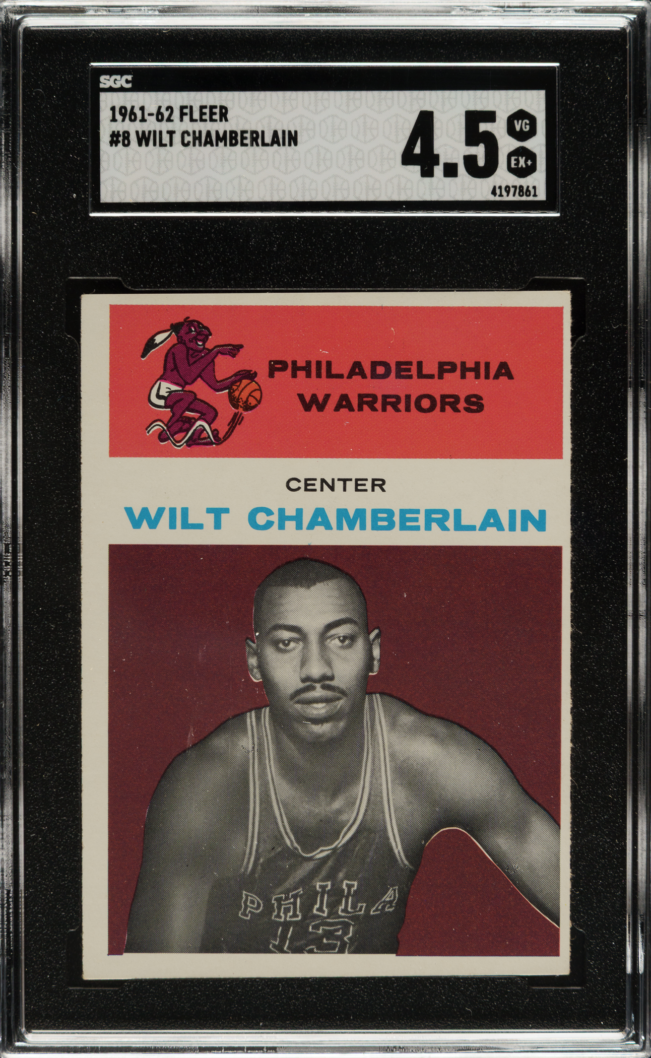 Graded VG/EX+ 4.5 by SGC (submitted by REA). Extremely desirable rookie card of Hall of Famer Wilt Chamberlain from the 1961-1962 Fleer basketball set. Chamberlain's rookie card is one of the classics of all basketball cards. Besides being Chamberlain's most popular card, it is also the key to the set. This example has a deep red background, superb image quality, and light corner wear. Boldly printed reverse.