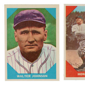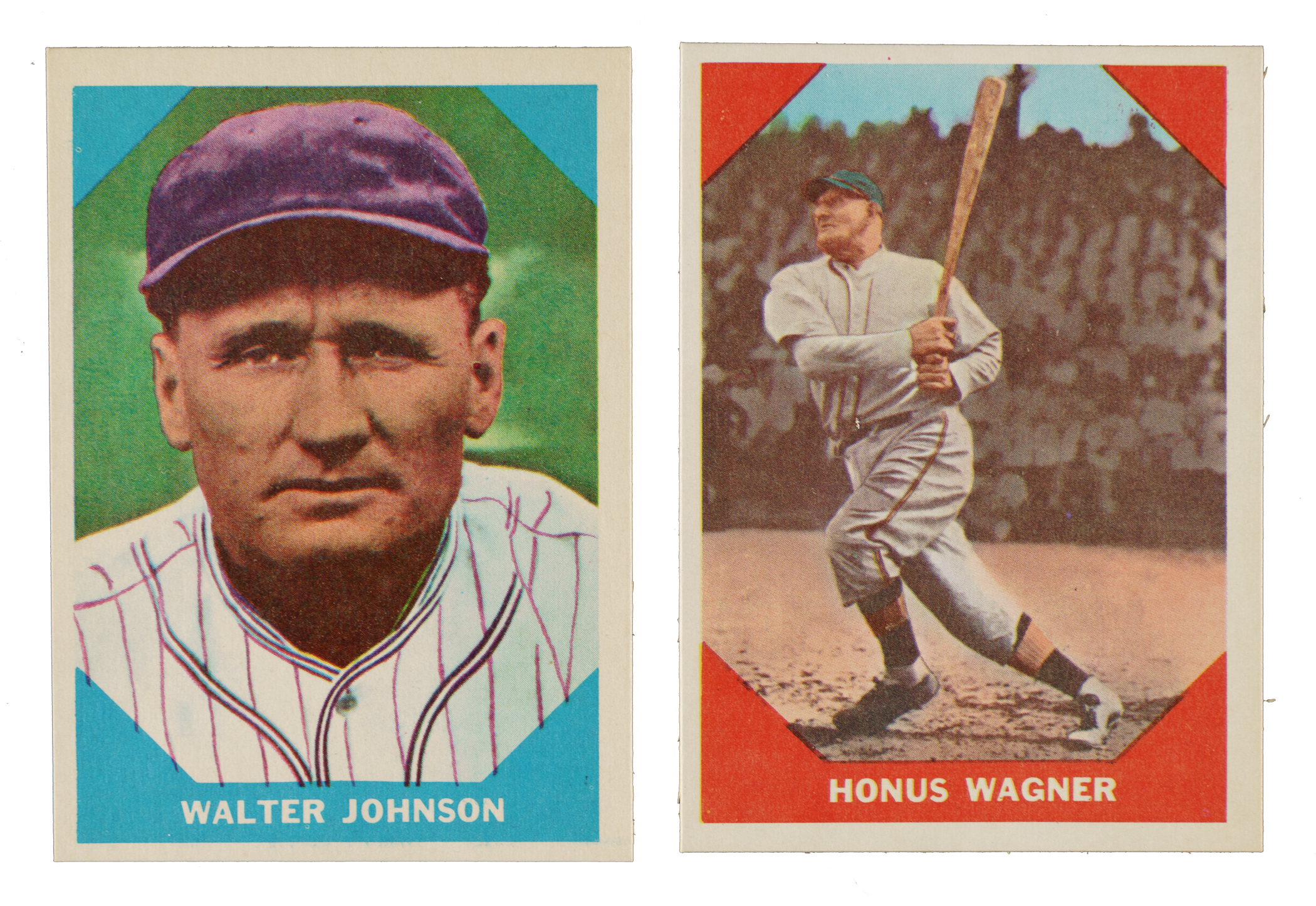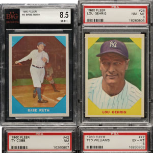 Presented is a complete 79-card set of 1960 Fleer All-Time Greats. This is a very attractive set of one of card collecting's all-time great sets (no pun intended!) featuring old-timers, which was no doubt the introduction to baseball history for countless thousands of youngsters. Condition is 42% Nr/Mt to Nr/Mt-Mt (including a couple higher), 47% Ex to Ex-Mt (due mostly to centering), and 11% Vg to Vg-Ex. Four cards have been professionally graded and encapsulated by PSA (3) and BVG (1). Keys: #3 Ruth (BVG NM-MT+ 8.5), 6 Johnson (Nr/Mt), 28 Gehrig (NM-MT 8), 42 Cobb (NM 7), 62 Wagner (Nr/Mt+), and 72 T. Williams (EX-MT 6). In 1960, Fleer would have preferred to put out a set featuring current stars, but was unable to do so due to Topps' ironclad contracts with all the modern players (except Ted Williams), so Fleer came up with the idea for this old-timers set to keep its foot in the trading-card game. This is a very attractive high-grade complete set of this historic, classic, and often overlooked Fleer issue. Total: 79 cards.