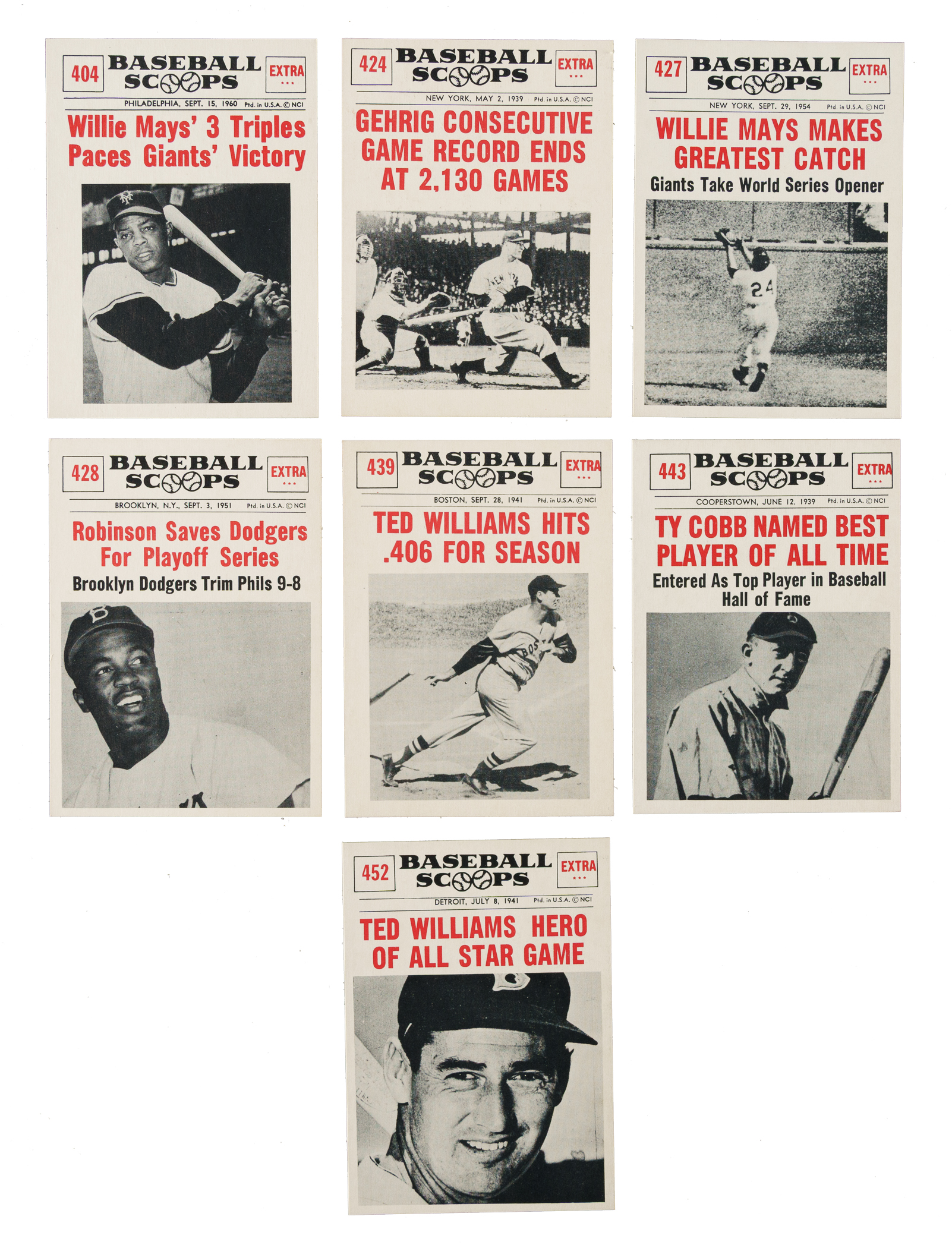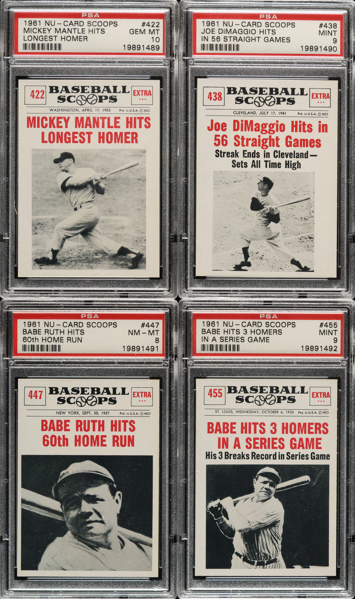 This complete set of 80 cards issued by Nu-Card in 1961 features many of baseball's greatest moments presented in a mock newspaper design. This set is highlighted by #422 Mickey Mantle Hits Longest Homer PSA GEM MINT 10. Condition is 58% Nr/Mt-Mt (including a few higher), 29% Nr/Mt, and 13% Ex to Ex-Mt (including one lesser). Four cards have been professionally graded and encapsulated by PSA. Keys: #404 Mays (Nr/Mt-Mt+), 422 Mantle (GEM MINT 10), 424 Gehrig (Ex-Mt), 427 Mays (Nr/Mt-Mt+), 428 Robinson (Nr/Mt), 438 J. DiMaggio (MINT 9), 439 Williams (Nr/Mt-Mt+), 443 Cobb (Nr/Mt), 447 Ruth (NM-MT 8), 452 Williams (Nr/Mt-Mt+), and 455 Ruth (MINT 9). Superb high-grade complete set of 1961 Nu-Card Baseball Scoops, loaded with Hall of Famers and stars. Total: 80 cards.