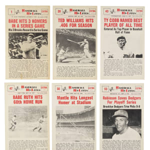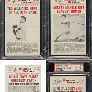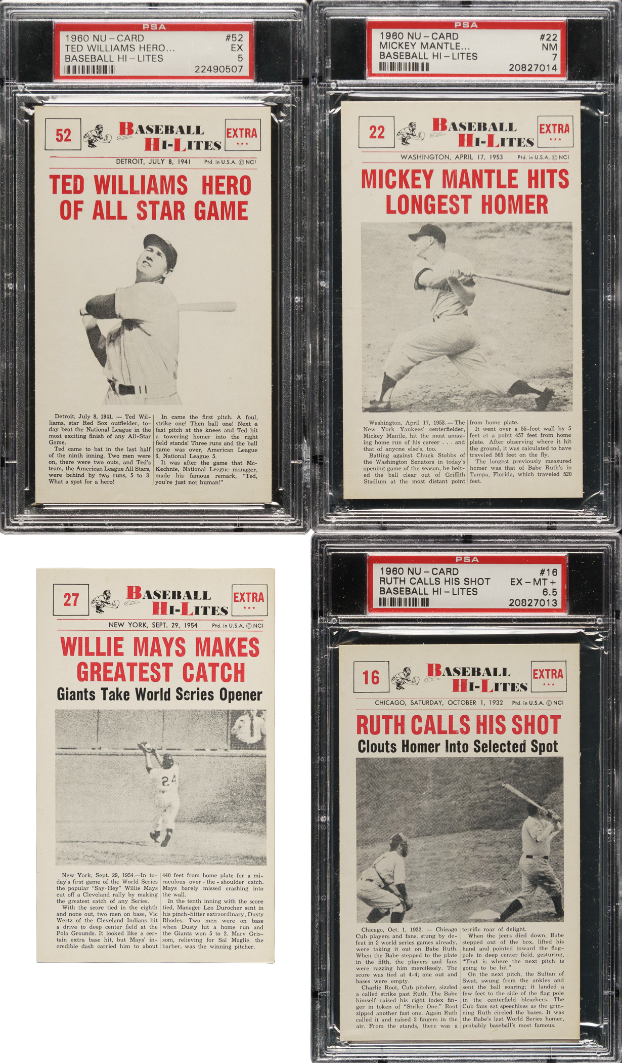 Presented is a fascinating near-complete set of sixty-four different cards (out of 72 in the set) issued by Nu-Card, featuring many of baseball's greatest moments presented in a mock newspaper design. Condition is 16% Nr/Mt, 64% Ex to Ex-Mt, and 20% Vg to Vg-Ex (including four lesser). Three cards have been professionally graded and encapsulated by PSA. The following two cards are CVC Baseball Hi-Lites (produced in black and white with blank backs): #8 and 12. Keys: #1 Babe Hits 3 Homers (Vg), 16 Ruth Calls His Shot (EX-MT+ 6.5), 22 Mickey Mantle Hits Longest HR (NM 7), 27 Willie Mays Greatest Catch (Ex+), 39 Ted Williams Hits .406 (Vg), 43 Ty Cobb Named Best of All Time (Ex-Mt), 47 Babe Ruth Hits 60th HR (Vg), 50 Mantle Hits Longest HR at Stadium (Ex), 52 Williams Hero of AS Game (EX 5), and 53 Robinson Saves Dodgers (Ex+). Missing the following eight cards for completion: #6, 24 Gehrig Consecutive Game Record Ends, 32, 46, 48, 56, 65, and 68. Crisp and clean complete set of 1960 Nu-Card Baseball Hi-Lites loaded with Hall of Famers and stars. Total: 64 cards.