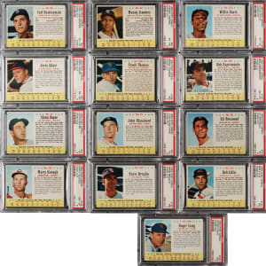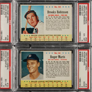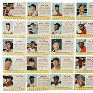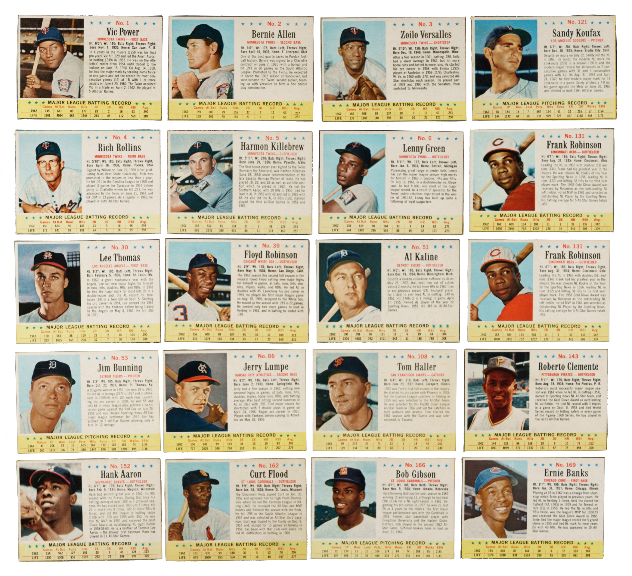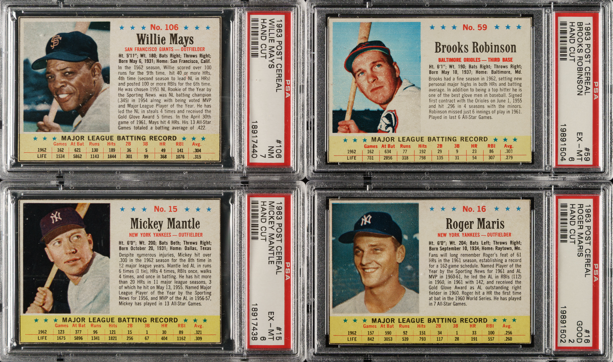 Impressive 200-card complete set of one of the 1960s' great classics: 1963 Post Cereal. Includes both variations of #131 F. Robinson. The grades in the following condition composite are without respect to the neatness of the cut, as many of the cards are cut inside one or more borders and would qualify only for "Authentic" if submitted for professional grading. Condition is 15% Nr/Mt to Nr/Mt-Mt (mostly Nr/Mt), 35% Ex to Ex-Mt, 40% Vg to Vg-Ex, and 10% lesser. Twenty-one cards have been professionally graded and encapsulated by PSA. Keys: #15 Mantle (EX-MT 6), 16 Maris (GOOD 2), 30 Thomas (Ex-Mt+), 39 Floyd Robinson (Vg), 51 Kaline (Ex), 53 Bunning (Gd), 59 B. Robinson (EX-MT 6), 61 Adair (EX-MT 6), 80 Yastrzemski (EX-MT 6 [MK]), 86 Lumpe (Ex), 87 Jimenez (EX-MT 6), 106 Mays (NM 7), 108 Haller (Ex-Mt), 119 Davis (EX-MT 6), 121 Koufax (Vg), 128 Kasko (EX-MT 6), 131a Frank Robinson/no stripes on cap (Vg+), 131b Frank Robinson/stripes on cap (pencil on reverse, otherwise Vg-Ex+), 143 Clemente (Vg-Ex), 152 Aaron (Vg-Ex), 162 Flood (Pr due to back damage), 166 Gibson (Ex+), 169 Banks (pen writing on reverse, otherwise Nr/Mt), 172 B. Williams (NM-MT 8), 187 Aspromonte (NM-MT 8), and 196 Thomas (NM 7). Nine additional PSA-graded cards: #14 (EX 5), 21 (EX 5), 78 (EX 5), 103 (NM 7), 135 (NM-MT 8), 165 (NM 7), 191 (NM 7), 199 (EX 5), and 200 (NM 7). A very attractive and mostly mid- to high-grade complete set of this scarce and extremely underrated early 1960s food issue. Total: 201 cards (set of 200 plus one variation). The size/weight of this item requires that there will be an additional shipping charge for this lot.