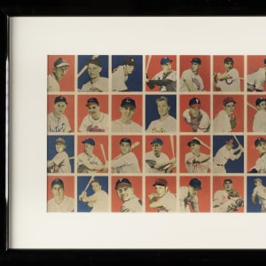 Complete 36-card uncut sheet (18 x 9.5 inches; visible dimensions) of 1949 Bowman baseball. The cards appearing on this sheet are #1-36, including Hall of Famers Lou Boudreau, Stan Musial, George Kell (RC), Bob Feller, Ralph Kiner, Warren Spahn, and Pee Wee Reese. While the colors are slightly muted, the sheet otherwise has an overall Excellent appearance. This is a magnificent early original Bowman baseball uncut sheet, highlighted by several of the key Hall of Famers in the set. Matted and framed to total dimensions of 24.5 x 16 inches.
