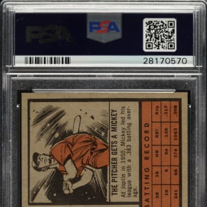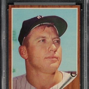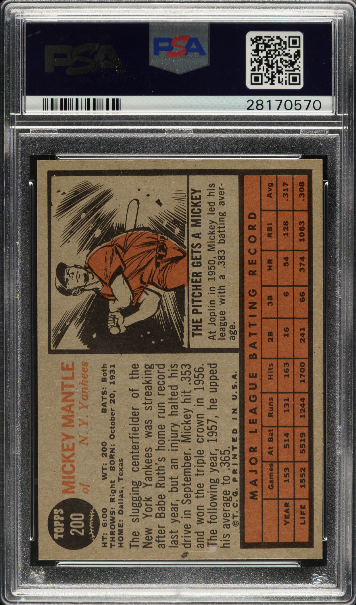 Graded NM-MT+ 8.5 by PSA. Stunning example of the key card from the 1962 Topps set: #200 Mickey Mantle. Issued in the year following the historic 1961 season, the 1962 Topps is naturally one of Mickey Mantle's most popular cards. Crisp and clean, both front and back, with a sharp image, four strong corners, minimal chipping on the condition-sensitive brown borders, and outstanding centering. This is a spectacular card from this very condition-sensitive issue, that would fit perfectly in any world-class Mickey Mantle or 1962 Topps collection.