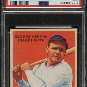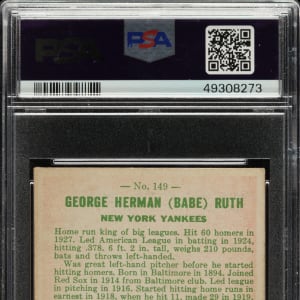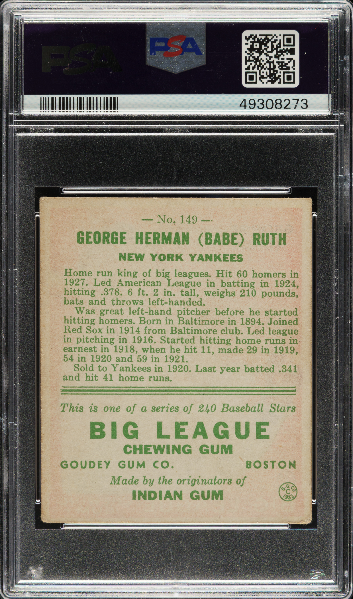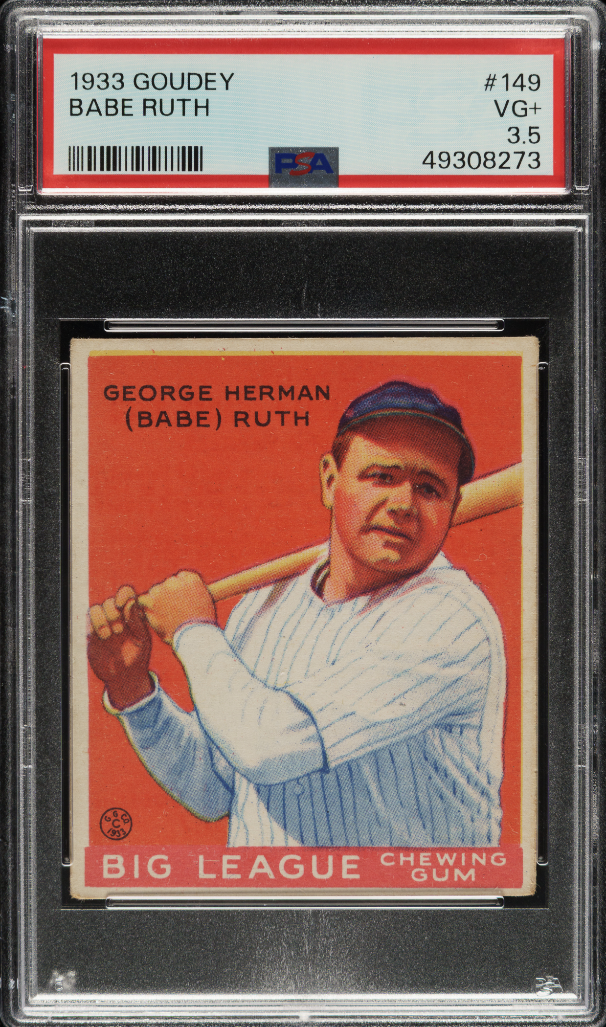 Graded VG+ 3.5 by PSA. Tremendous example of one of Babe Ruth’s most famous and classic cards: #149 (red background) from the 1933 Goudey series. This card has a brilliant red background, outstanding registration, and honest corner wear. Clean reverse with bold green text with some background color bleed/wet sheet transfer visible. In an extremely desirable condition, this is an ideal card for the collector who wants an exceptional 1933 Goudey #149 Babe Ruth.