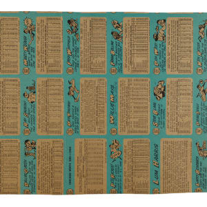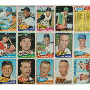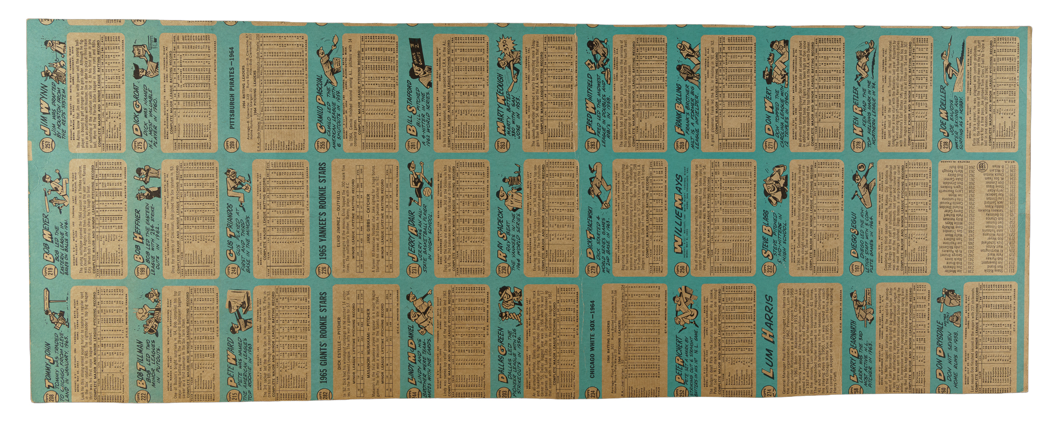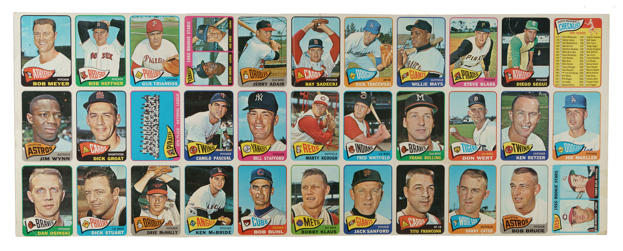 1965 O-Pee-Chee uncut sheet of 33 cards. All cards on this sheet are from the third and fourth series (#177-283). The reverse also shows third and fourth series card backs, but they are upside down and slightly misaligned, so that each card is essentially a wrong back. Keys include: Willie Mays (Camilo Pasqual on back), Camilo Pasqual (Willie Mays on back), Pirates Team (Steve Blass on back), Dan Osinski (Don Drysdale on back), and Danny Cater (Masanori Murakami RC on back). This 33-card sheet is technically defined as a partial sheet, as 1965 O-Pee-Chee were printed in 132-card production sheets. This attractive partial uncut sheet presents a very rare and relatively affordable alternative to a complete 132-card O-Pee-Chee sheet (if one were to be available). Technically in modest grade, with a heavy vertical crease extending through the sixth row and small edge tear on the left. There a several scattered pinholes on the left portion of the sheet. This sheet is still a significant rarity and displays very nicely. Dimensions of 28 x 10-1/2 inches. The size/weight of this item requires that there will be an additional shipping charge for this lot.