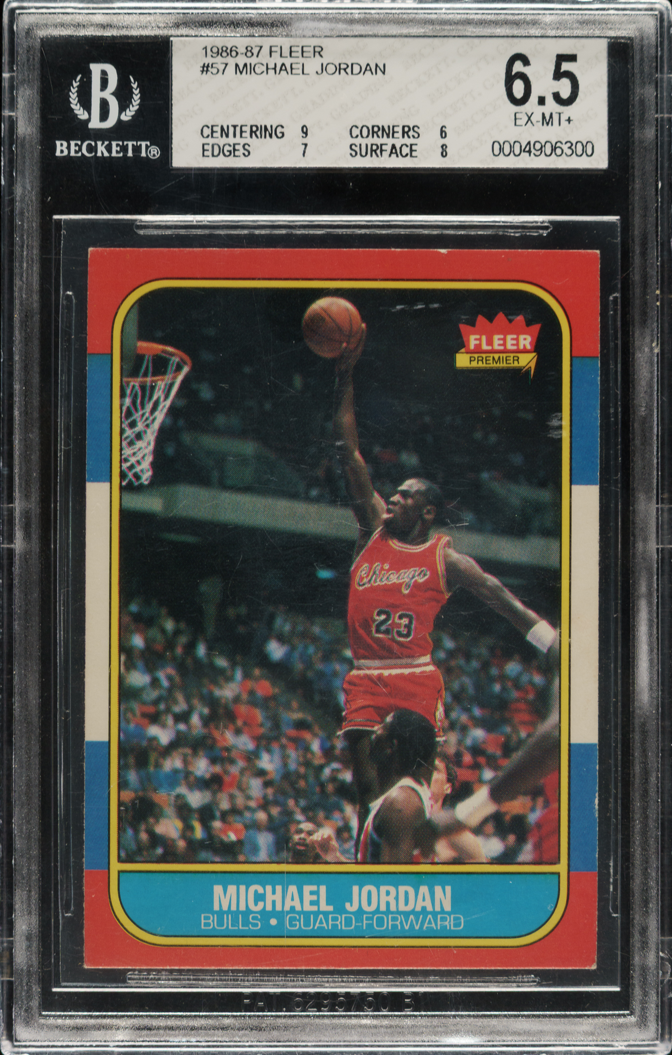 Graded EX-MT+ 6.5 by BGS. High-grade rookie card of Chicago Bulls Hall of Famer Michael Jordan, arguably the greatest basketball player ever. The 1986-1987 Fleer basketball issue is extremely condition-sensitive due to its blue flush-to-the-border design. The offered card has superb clarity, excellent centering, and strong corners with light touches of wear. A very attractive example of this most sought-after modern basketball-card classic.