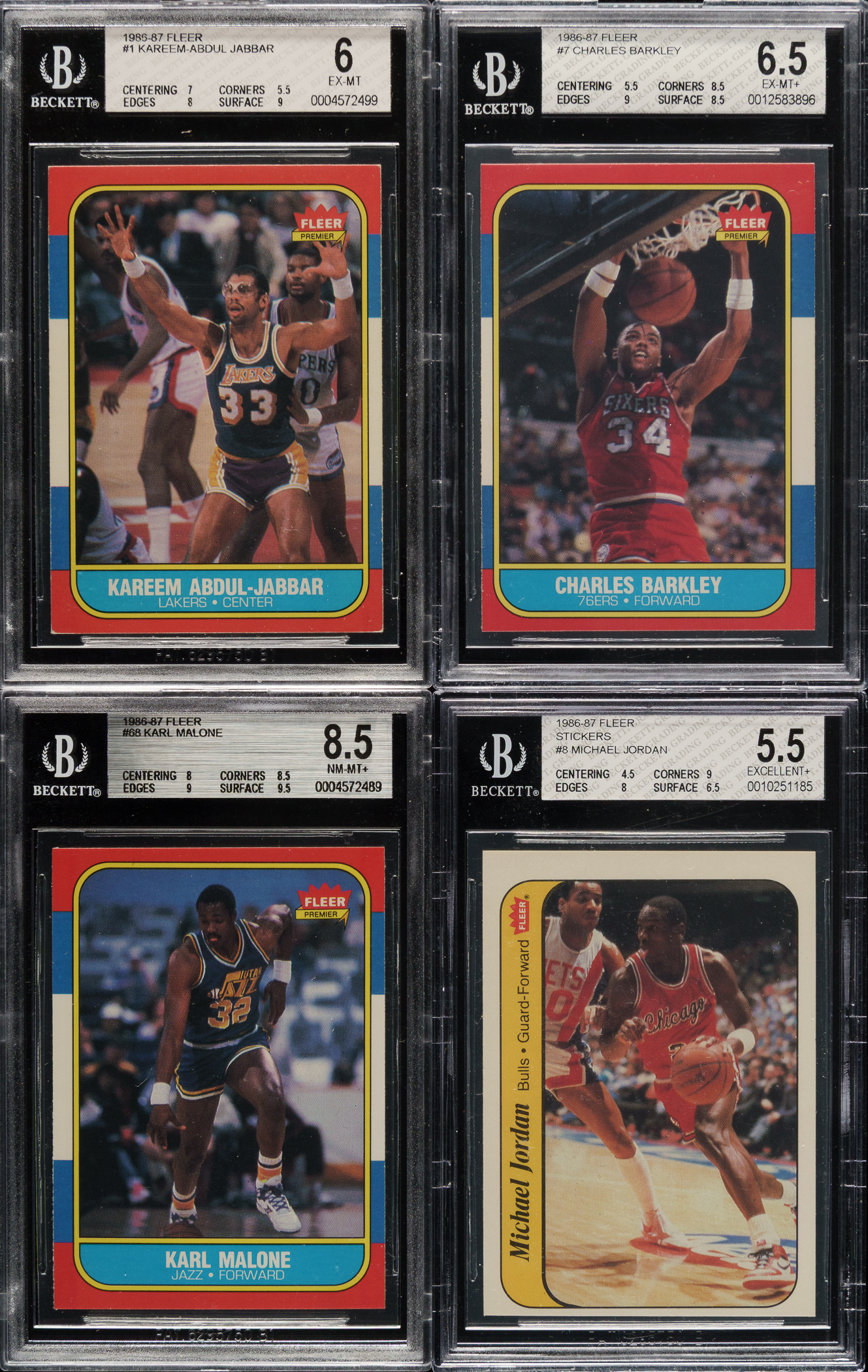 Presented is an outstanding near-complete master set of 1986-1987 Fleer basketball consisting of 127 different base cards (out of 132) and seven different stickers (out of 11). Missing five cards (#9 Bird, 27 Dumars, 57 Jordan, 82 Olajuwon, and 131 Worthy) and four stickers (#1 Abdul-Jabbar, 2 Bird, 4 English, and 7 Johnson) for completion. Ninety cards are graded and encapsulated by BGS. BGS Grading Composite: MINT 9 (1 card): #45. NM-MT+ 8.5 (19 cards): #13, 14, 16, 17, 18, 23, 24, 29, 37, 48, 56, 62, 68 K. Malone RC, 69, 93, 102, 111, 123, and 124. NM-MT 8 (16 cards): #5, 21, 46, 59, 60, 61, 67, 70, 73, 76, 90, 95, 101, 103, 105, and 118. NM+ 7.5 (18 cards): #6, 26 Drexler RC, 42, 47, 51, 52, 58, 66, 71, 79, 81, 85, 86, 87, 89, 104, 107, and 129. NM 7 (12 cards): #10, 22, 30, 41, 43, 54, 72, 78, 88, 91, 108, and 109 Thomas RC. EX-MT+ 6.5 (12 cards): #7 Barkley RC, 11, 32 Ewing RC, 35, 40, 44, 74, 75, 80, 100, 121 D. Wilkins RC, and 132 Checklist. EX-MT 6 (2 cards): #1 Abdul-Jabbar and 33. EX+ 5.5 (1 card): #2. EX 5 (1 card): #4. VG-EX 4 (1 card): #38. The condition of the 44-card unencapsulated balance is 50% Nr/Mt to Nr/Mt-Mt, 38% Ex to Ex-Mt, and 12% Vg to Vg-Ex. Unencapsulated Keys: #31 Erving (25/75 L/R, otherwise Ex-Mt), 53 Johnson (Ex), and 77 Mullin RC (Vg-Ex). The partial sticker set consists of the following seven BGS-graded cards: EX-MT 6 (4 stickers): #6 Ewing, 9 Olajuwon, 10 Thomas, and 11 Wilkins. EX 5 (2 cards): #5 Erving and 8 Jordan. VG-EX+ 4.5 (1 card): #3. This is a superb near-complete set of this modern classic basketball issue loaded with highlights. The equivalent SMR value for just 66 of the BGS-graded cards (not including the 24 cards and stickers graded lower than NM 7 and factoring in the 37 NM-MT+ and NM+ half grades at the lower whole-grade level) is $1,490. Total: 134 cards. The size/weight of this item requires that there will be an additional shipping charge for this lot.