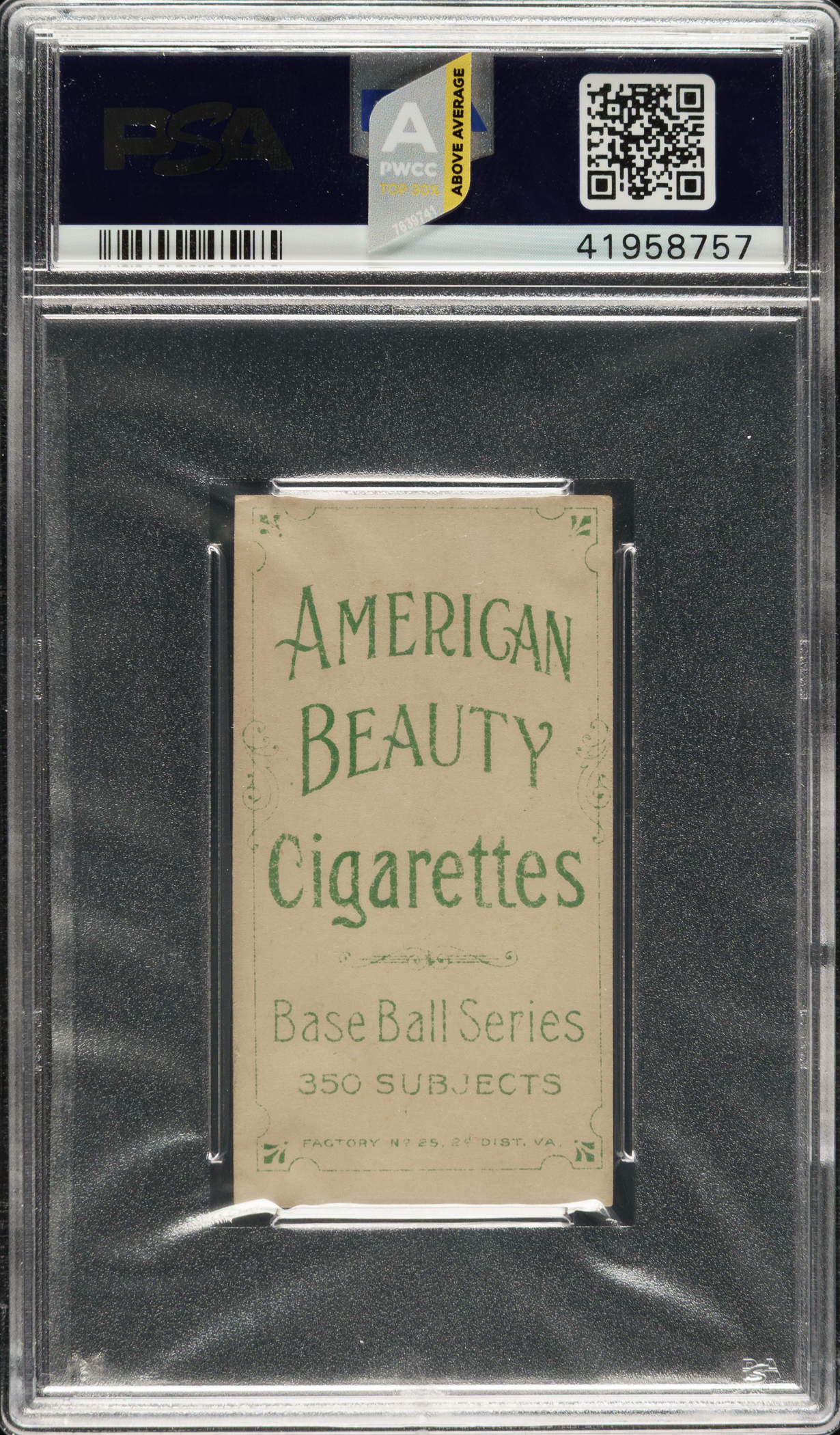 Graded EX-MT 6 by PSA (submitted by REA). This is the ONLY example graded at this level with just one higher. Superb high-grade example of Hall of Famer Christy Mathewson (dark cap) from the classic T206 series with a very desirable American Beauty 350 advertising reverse. American Beauty is an uncommon back, certainly not in the same league as Drum or Uzit but very unusual and seen far less often than most other T206 advertising backs. The T206 Christy Mathewson dark cap pose is one of the most recognizable cards in all of card collecting. The offered example is stunning, with extremely vibrant colors, a crisp image, and just a hint of light wear to the four corners. Entirely clean both front and back. This is an extremely attractive and very rare scarce-back example of this classic Christy Mathewson tobacco card.