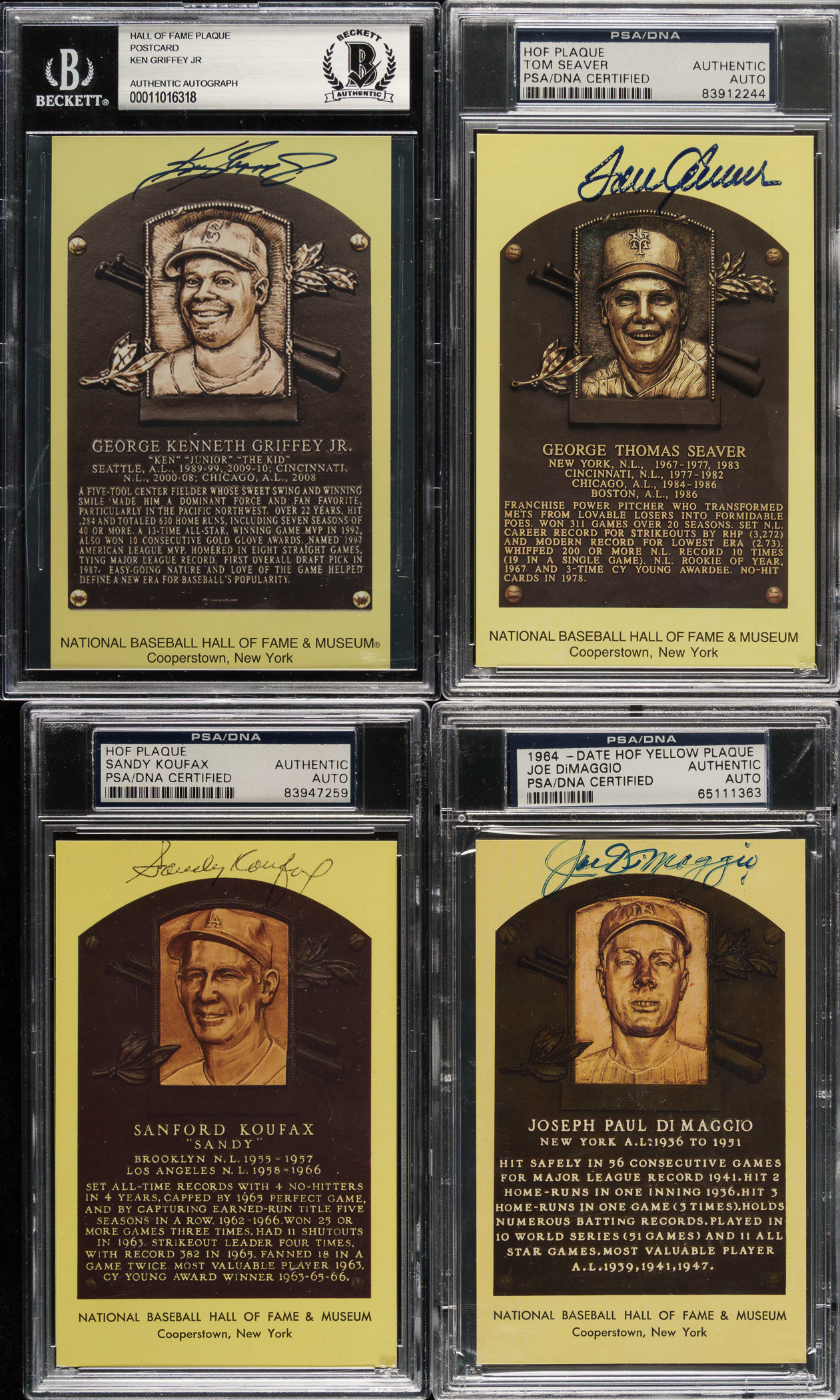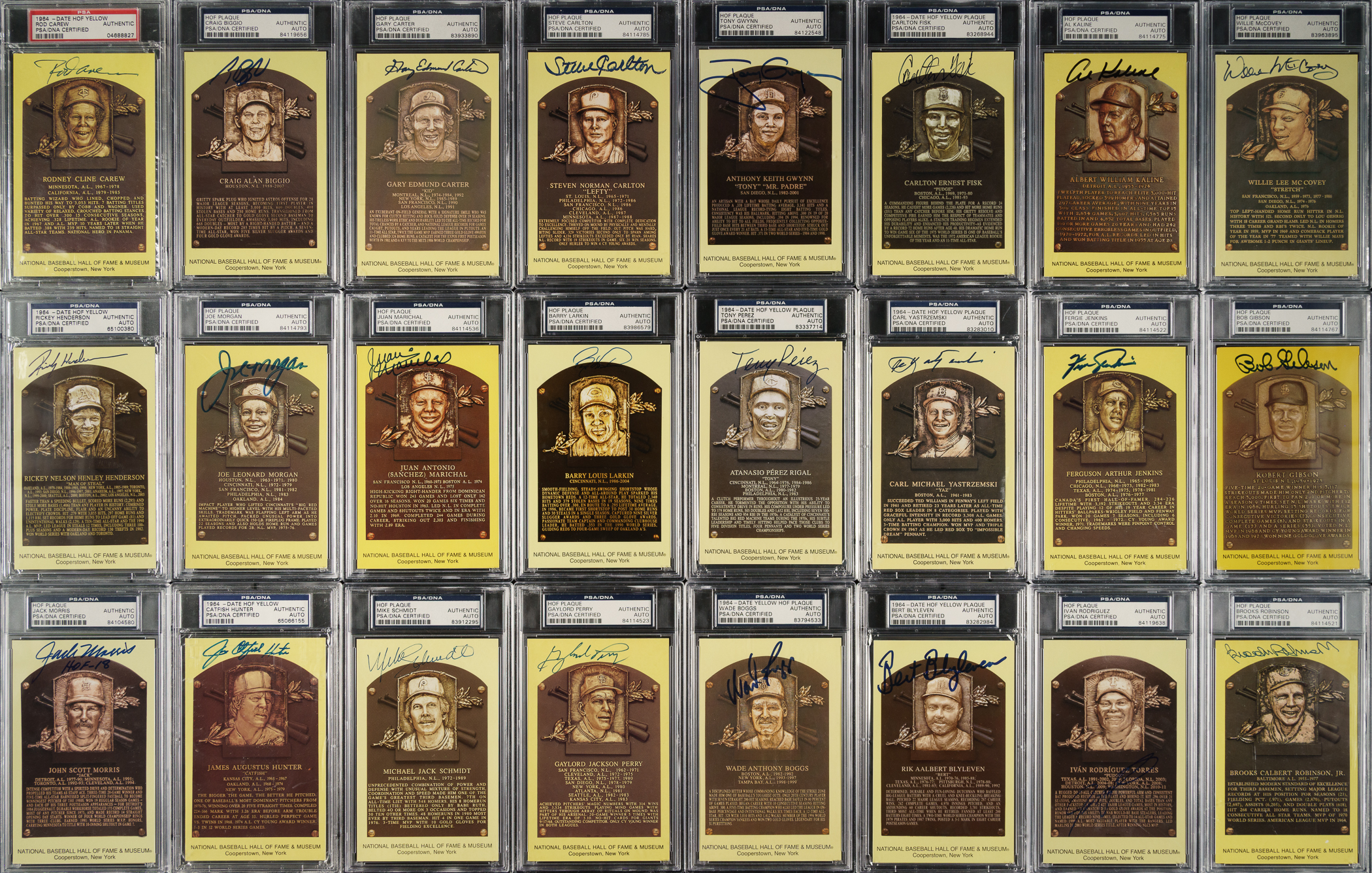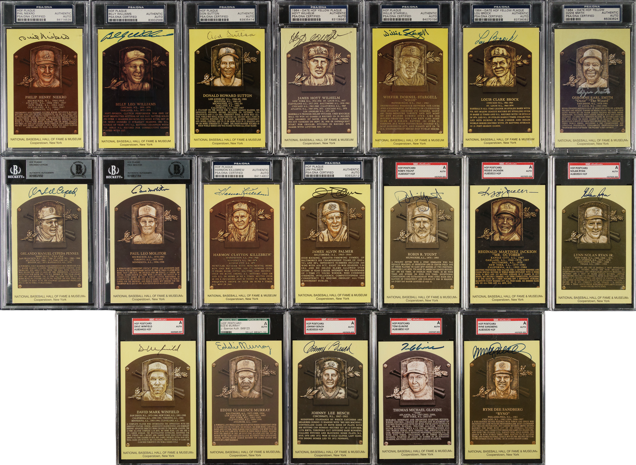 Collection of 47 different autographed Hall of Fame yellow postcards, each encapsulated by PSA/DNA (36), SGC (8), or BGS (3) with all of the signatures certified as "Authentic." All of the signatures have been executed in either blue or black ink and appear on the front. The collection consists of the following PSA-graded cards (unless otherwise noted): Bench (SGC), Biggio, Blyleven, Boggs, Brock, Carew, Carlton, Carter, Cepeda (BGS), DiMaggio, Fisk, Gibson, Glavine (SGC), Griffey Jr. (BGS), Gwynn, Henderson, Hunter, R. Jackson (SGC), Jenkins, Kaline, Killebrew, Koufax, Larkin, Marichal, McCovey, Molitor (BGS), Morgan, Morris (HOF 18), Murray (SGC/JSA), Niekro, Palmer, Perez, Perry, B. Robinson, I. Rodriguez, Ryan (SGC), Sandberg (SGC), Schmidt, Seaver, O. Smith (silver sharpie), Stargell, Sutton, Wilhelm, B. Williams, Winfield (SGC), Yastrzemski, and Yount (SGC). Total: 47 signed postcards. The size/weight of this item requires that there will be an additional shipping charge for this lot.