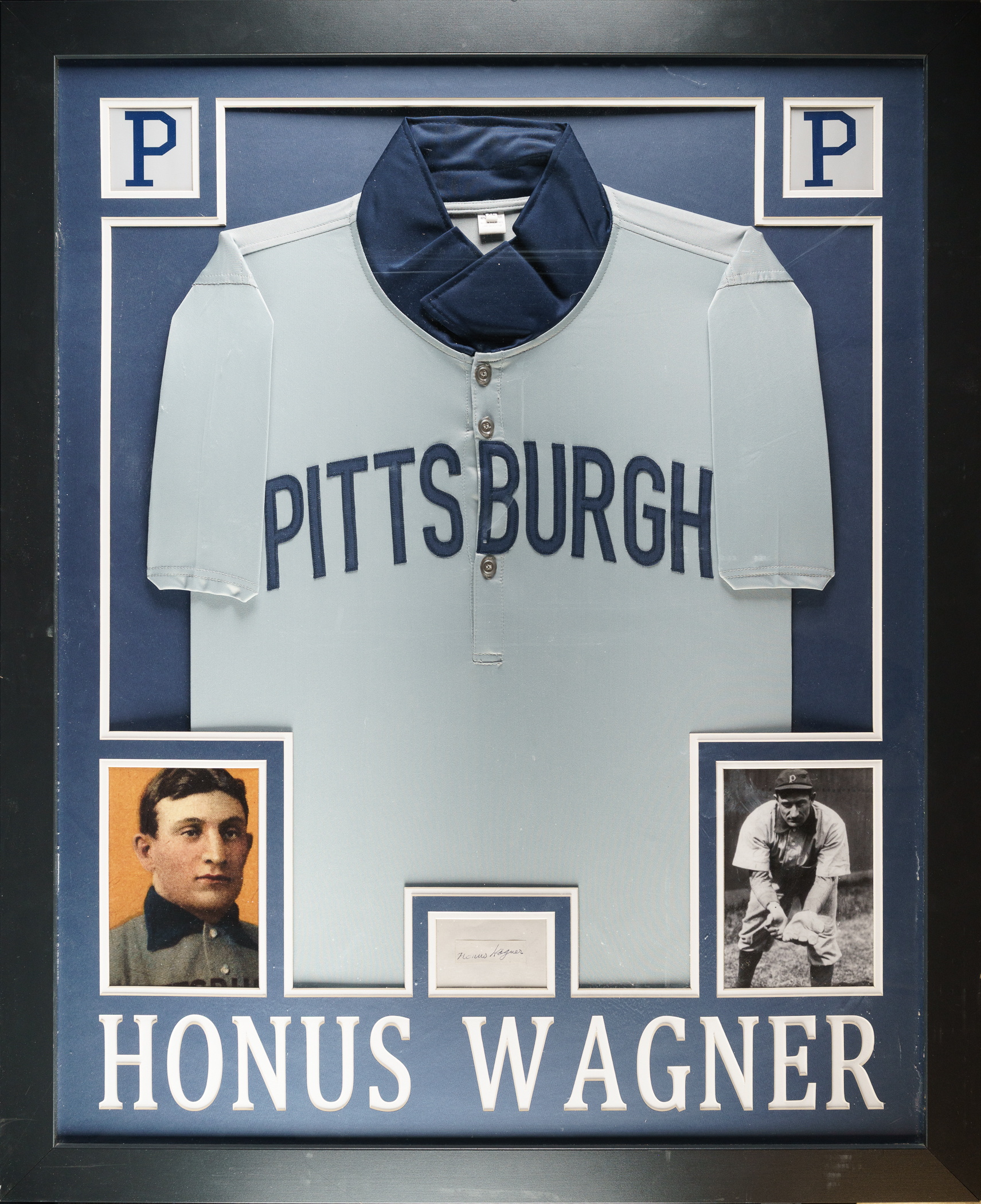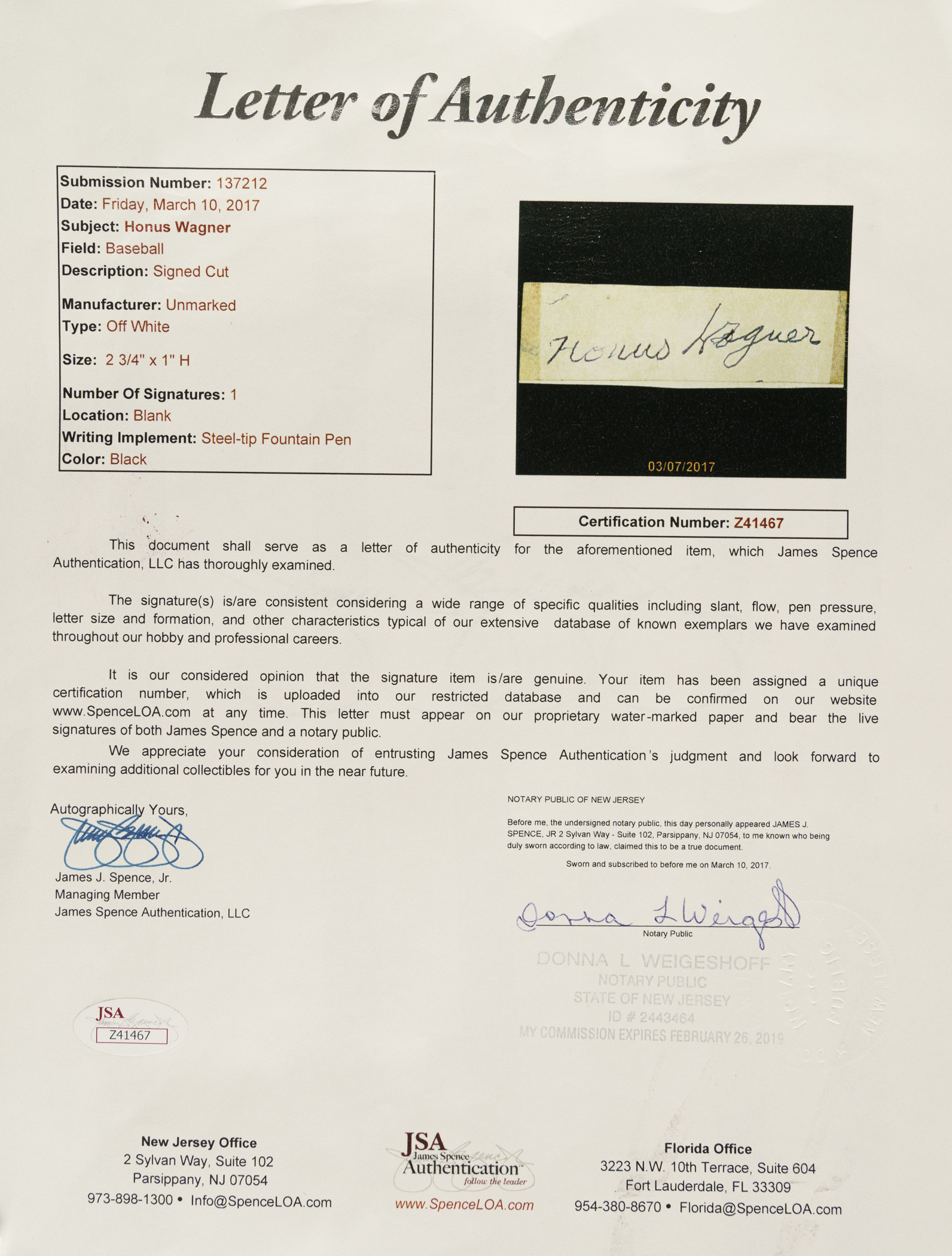 Pittsburgh Pirates Hall of Famer Honus Wagner cut signature matted in an elaborate framed display. The cut (2.5 x 1 inches) is affixed to a larger white sheet and presents in Excellent condition overall. Matted and framed to total dimensions of 35.5 x 43.5 inches. The size/weight of this item requires that there will be an additional shipping charge for this lot.