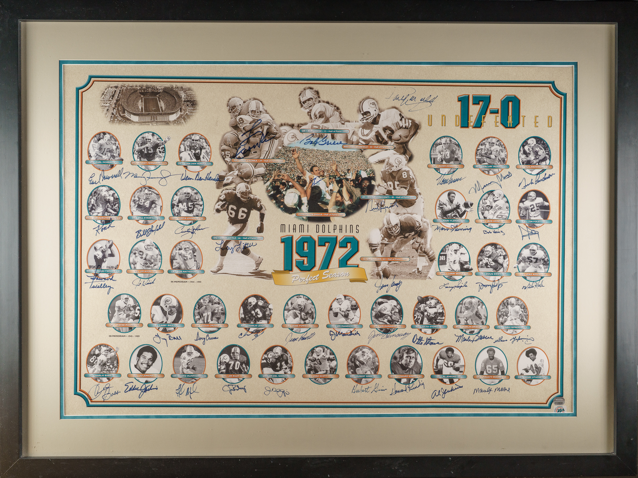Tremendous limited-edition composite display lithograph featuring 46 members of the 1972 Super Bowl Champion Miami Dolphins, the only undefeated team in NFL history. Among those pictured are Don Shula (head coach), Larry Csonka, Paul Warfield, Larry Little, Bob Griese, Nick Buoniconti, and Jim Langer. With the exception of Bob Matheson, Jake Scott, and Henry Stuckey, each individual pictured has signed the lithograph in blue marker along or near his image. The members of the 1972 Dolphins will forever be immortals of the sporting world due to their historic 14-0 season. The team then went on to defeat Cleveland and Pittsburgh in the playoffs before capping its historic campaign with a 14-7 victory over Washington in Super Bowl VII. The lithograph (38 x 27 inches; visible dimensions) is in apparent Near Mint condition overall. Matted and framed to total dimensions of 48 x 36 inches. Please note that the lithograph's limitation number in the lower right is covered by the matting. Auction LOA from James Spence/JSA. The size/weight of this item requires that there will be an additional shipping charge for this lot.