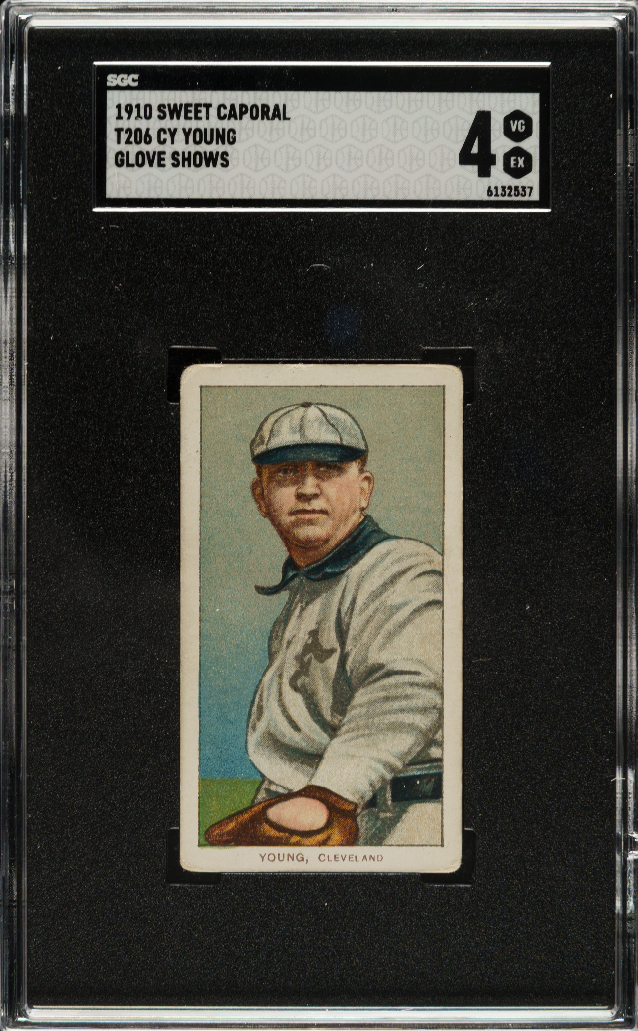 Graded VG/EX 4 by SGC. Every player has his classic card and for Cleveland Naps Hall of Famer Cy Young, to many, it is his T206 glove-shows pose. It is one of the most recognizable of all vintage cards and one of the most popular cards in the entire T206 set. This well-centered example displays vibrant colors, a crisp image, and honest corner wear. Sweet Caporal 350/25 advertising reverse. This is a strong mid-grade example of this classic Cy Young card.