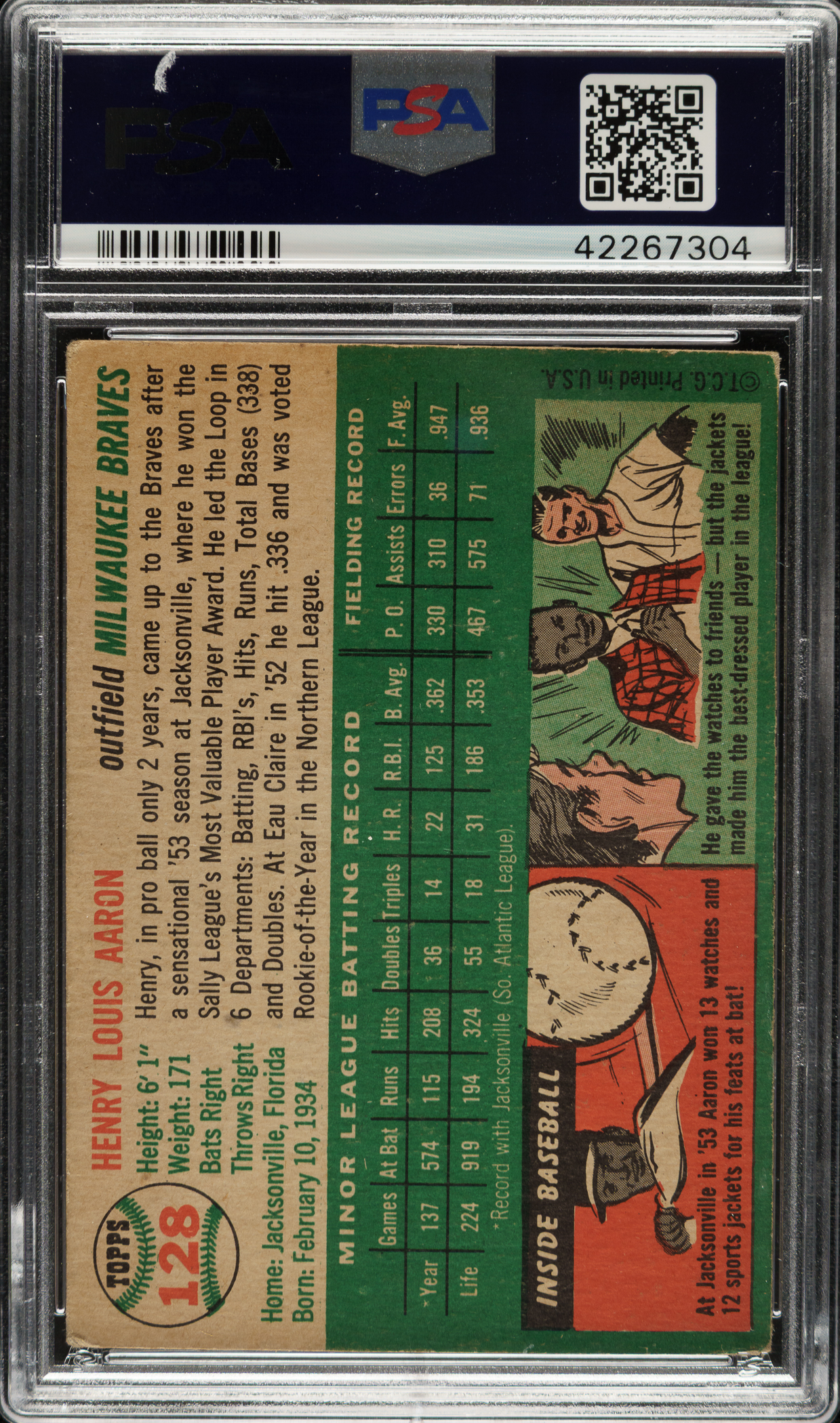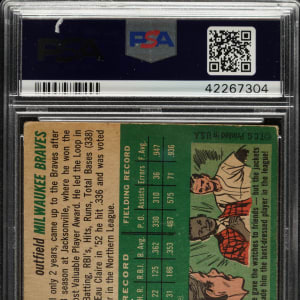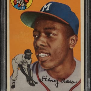 Graded VG 3 by PSA. Very attractive mid-grade example of Milwaukee Braves Hall of Famer Hank Aaron's rookie card. One of card collecting's classics, Aaron's rookie card is the key to the 1954 Topps set and one of the most popular of all postwar baseball cards. The card has brilliant colors, outstanding registration and honest wear. Clean reverse.