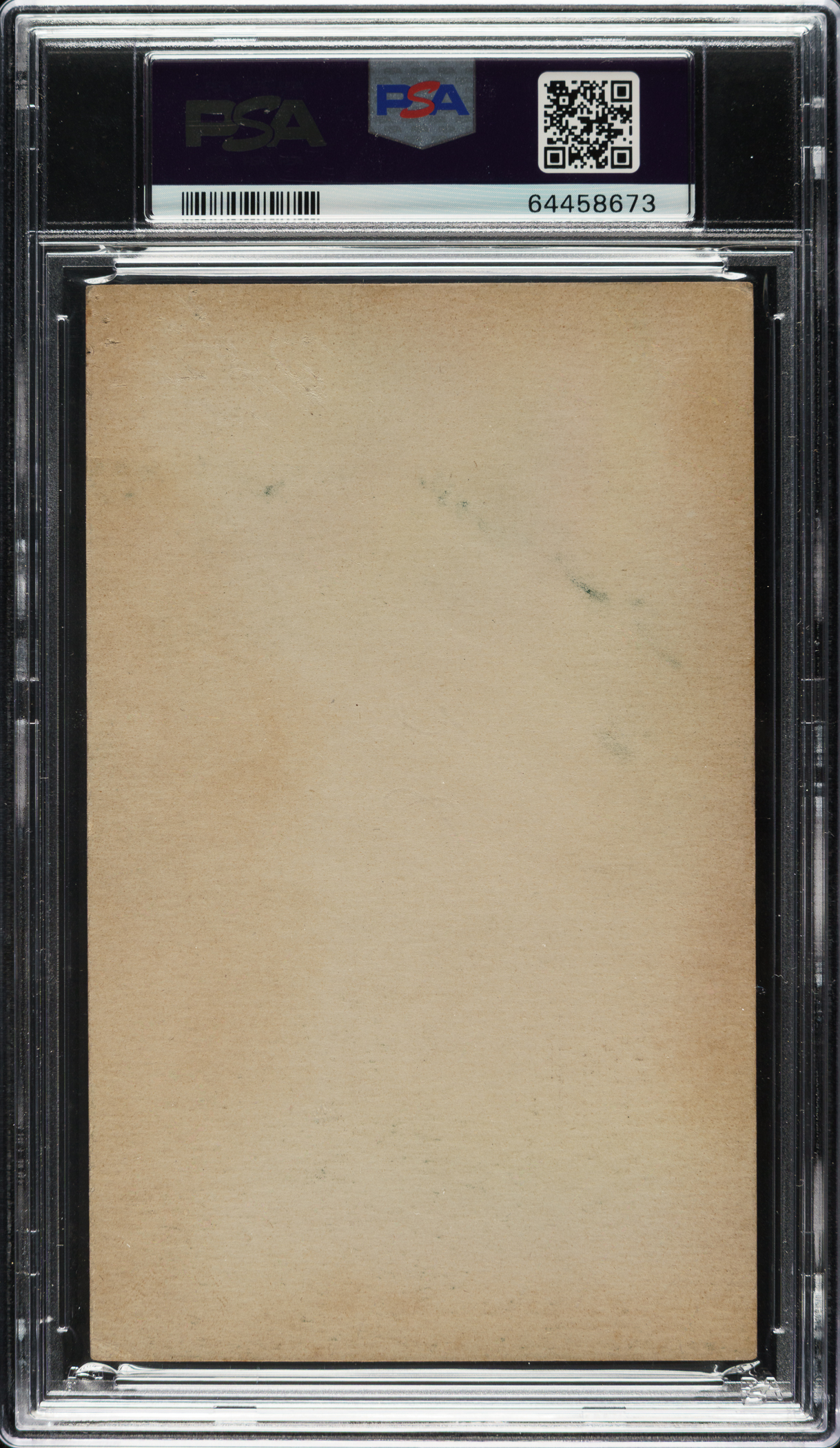 Graded VG 3 (MK) by PSA. Pleasing example of Babe Ruth from the 1927 Exhibits set. The key card to the 1927 Exhibits card set features Ruth in his classic follow-through swing. The 1927 Exhibits (3-3/8 x 5-3/8 inches) have a green tint and are blank-backed. The lower-left corner has the printed notation “Geo. H. 'Babe” Ruth – New York, A.L.” The card has a strong image and honest corner wear. The blank reverse has a few surface abrasions and erased pencil marks, hence the qualifier. This attractive card would be a worthy addition to any Exhibits, Babe Ruth, or classic prewar-cards collection.
