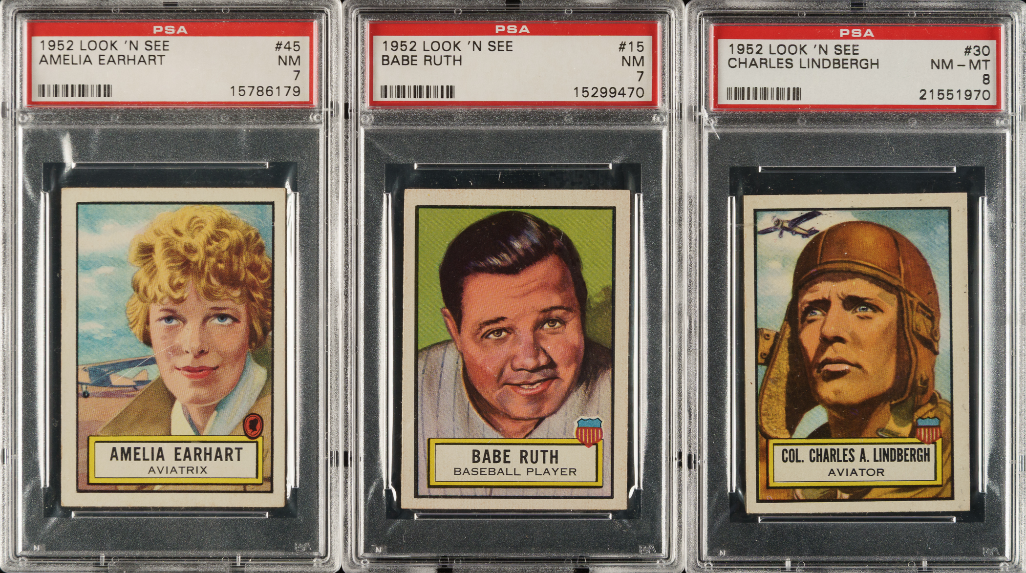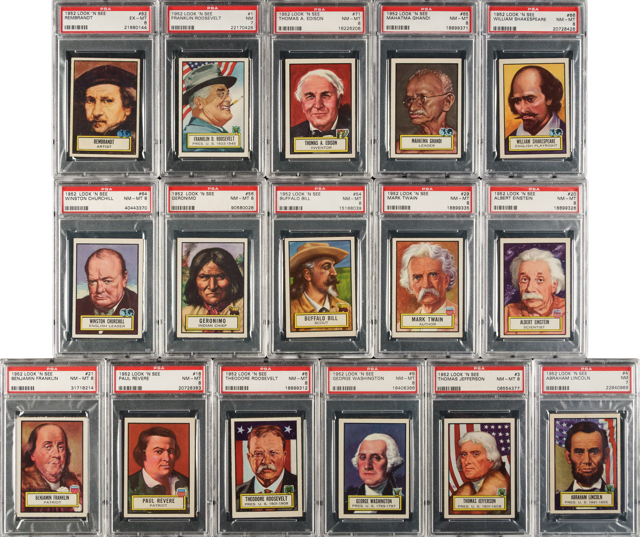 Presented is an outstanding high-grade complete set of 1952 Topps "Look 'n See," one of the great classics of early 1950s nonsport card issues and one of the earliest of all Topps sets. "Look 'n See" is one of the most highly regarded and collected of all postwar sets. This was an extremely ambitious concept for a set, with strong historical and educational content. The card fronts feature full-color portraits of famous people from all eras and areas of history. Any kid collecting and studying this set could not help but learn about and develop a greater interest in world history. This is one of the finest sets of this popular issue we have ever offered! All 135 cards have been graded and encapsulated by PSA. Included are seventy-five NM-MT 8s, fifty NM 7s, and ten EX-MT 6s. This set currently ranks 12th on the PSA Set Registry with an impressive GPA of 7.39! PSA Grading Composite: NM-MT 8 (75 cards): #2, 3, 5, 6, 7, 8, 9, 10, 11, 12, 14, 16, 18, 19, 20, 21, 22, 23, 25, 27, 28, 29, 30 Lindbergh, 32, 33, 34, 35, 36, 37, 38, 39, 40, 41, 43, 44, 46, 48, 49, 51, 52, 53, 54, 55, 56, 57, 60, 61, 62, 63, 64, 65, 66, 67, 68, 69, 70, 71, 73, 74, 87, 90, 91, 98, 105, 108, 110, 114, 118, 119, 123, 125, 127, 128, 134, and 135. NM 7 (50 cards): #1, 4, 13, 15 Ruth, 17, 24, 26, 31, 42, 45 Earhart, 47, 50, 58, 59, 72, 76, 77, 78, 79, 81, 83, 84, 85, 86, 89, 92, 94, 95, 96, 97, 99, 101, 102, 103, 106, 107, 109, 111, 112, 113, 115, 116, 117, 120, 122, 124, 126, 129, 130, and 132. EX-MT 6 (10 cards): #75, 80, 82 Rembrandt, 88, 93, 100, 104, 121, 131, and 133. This classic and always very popular nonsport set is filled with many great historical figures. This is an extremely fresh, clean, and sharp-looking set in particularly strong condition for this scarce, early Topps issue. The total SMR value in the assigned grades is $10,032. Total: 135 cards. The size/weight of this item requires that there will be an additional shipping charge for this lot.