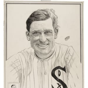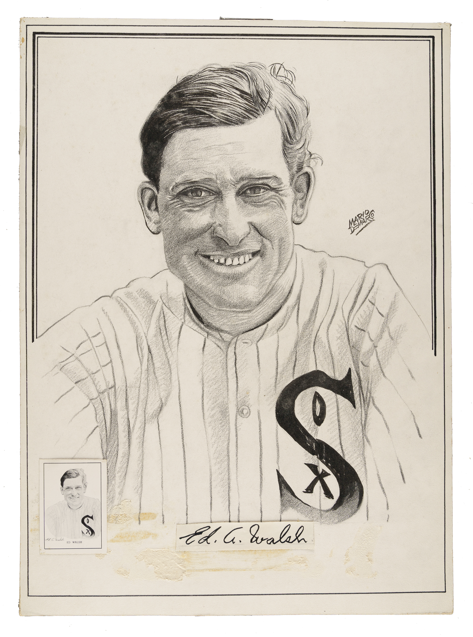 Original artwork of Hall of Fame pitcher Ed Walsh by Mario DeMarco. Signed by the artist in the upper right. This particular piece was used for Walsh's card in the classic 1950-1956 Callahan Hall of Fame card set, which was the official card set of the Hall of Fame. The unique Bristol-on-paper artwork was created utilizing DeMarco's painstakingly slow trademark "dot method" of drawing, with each artwork consisting of thousands of small dots. The artwork includes a cut signature, just as it appears on his issued card, affixed directly to the background. Many Callahan artworks have signatures in the backgrounds, and it is interesting to note that these are actual cut signatures that the artist has traced over for boldness and glued to the artworks. When working on the set, DeMarco wrote to all living Hall of Famers for this purpose, but did not seek signature examples of already deceased players, which explains why some old-timers do not have signatures as part of the design of their Callahan cards, while others do. Nearly all of the artworks from the Callahan Hall of Fame card set were sold directly by Mario DeMarco in the 1970s. An example of Walsh's card from the set has been affixed to the piece in the lower-left corner. The artwork (11.5 x 15.5 inches) displays spots of paper loss and adhesive residue along the bottom. The same condition issues are visible along the reverse, plus multiple spots of clear tape affixed to the perimeter. Technically in Poor condition overall but with far superior visual appeal. The size/weight of this item requires that there will be an additional shipping charge for this lot.