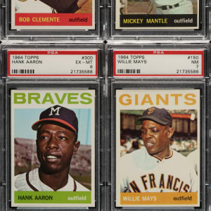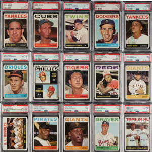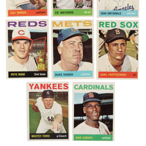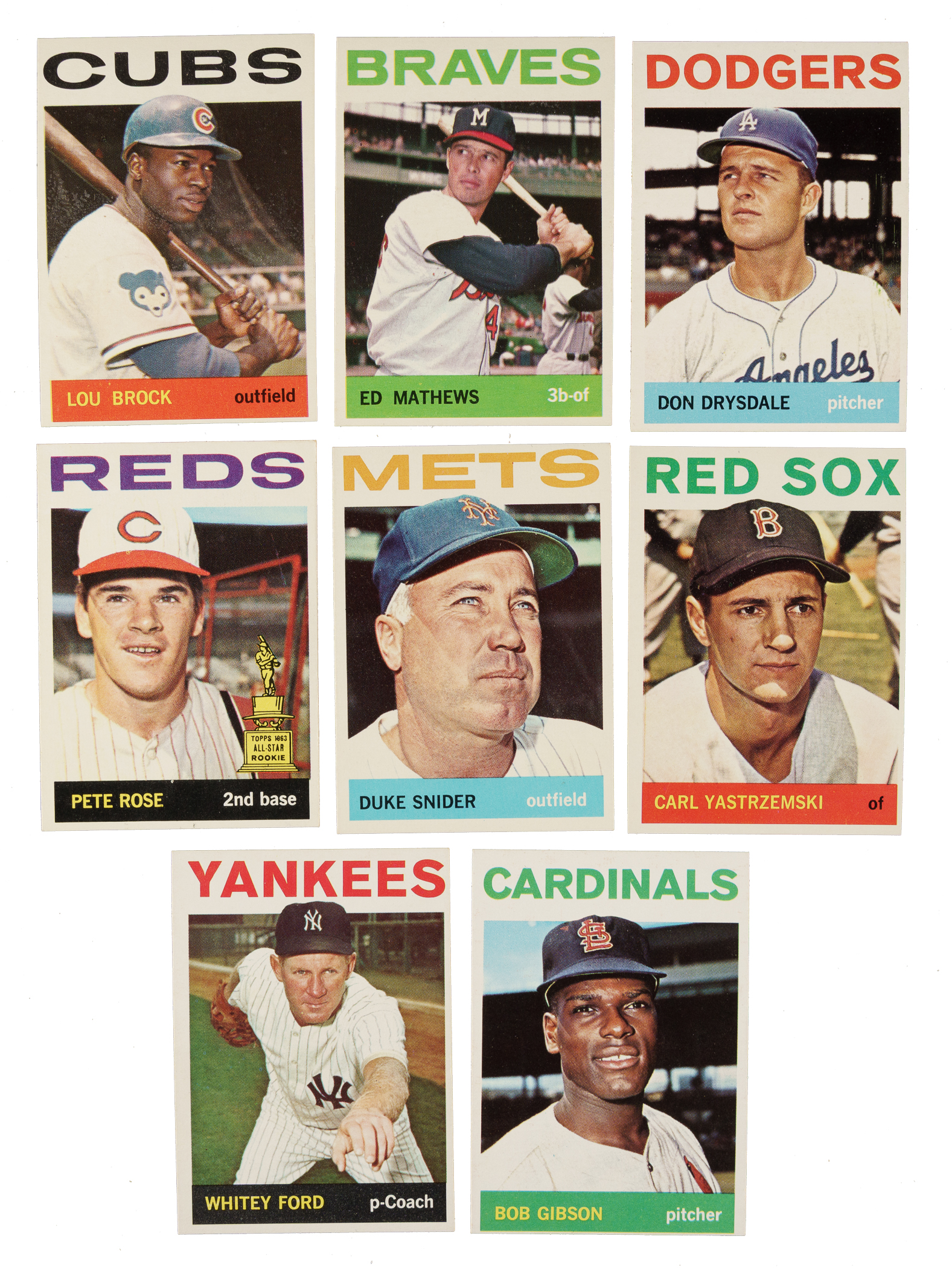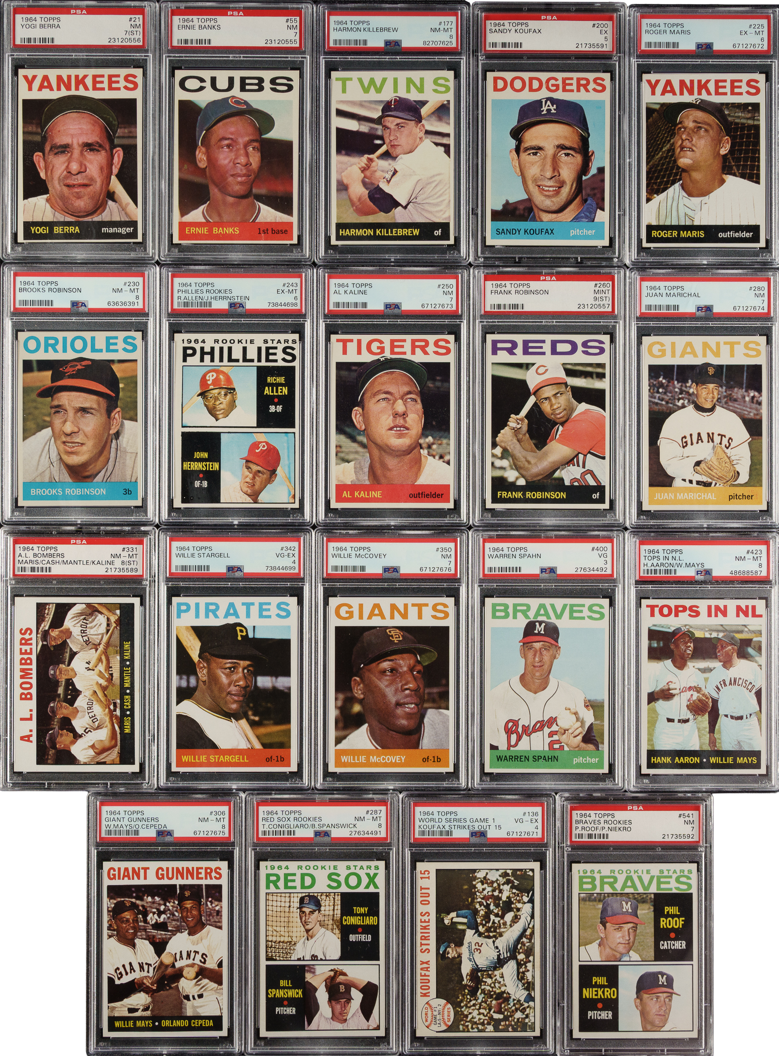Very attractive, mid- to high-grade complete set of 1964 Topps baseball. The 1964 Topps set is loaded with scores of stars and Hall of Famers of the era and also includes several extremely popular multiplayer cards featuring great legends of the early 1960s. Condition is 43% Nr/Mt to Nr/Mt-Mt, 46% Ex to Ex-Mt, and 11% Vg to Vg-Ex. Twenty-three cards have been professionally graded and encapsulated by PSA. Keys: #21 Berra (NM 7 [ST]), 29 Brock (Ex), 35 Mathews (Nr/Mt+), 50 Mantle (EX-MT 6), 55 Banks (NM 7), 120 Drysdale (Nr/Mt), 125 Rose (Ex+), 136 WS Gm. 1 - Koufax (VG-EX 4), 150 Mays (NM 7), 155 Snider (Ex-Mt), 177 Killebrew (NM-MT 8), 200 Koufax (EX 5), 210 Yastrzemski (Ex), 225 Maris (EX-MT 6), 230 B. Robinson (NM-MT 8), 243 Allen RC (EX-MT 6), 250 Kaline (NM 7), 260 F. Robinson (MINT 9 [ST]), 280 Marichal (NM 7), 287 Conigliaro RC (NM-MT 8), 300 Aaron (EX-MT 6), 306 Mays/Cepeda (NM-MT 8), 331 AL Bombers w/ Mantle/Maris (NM-MT 8 [ST]), 342 Stargell (VG-EX 4), 350 McCovey (NM 7), 380 Ford (Ex-Mt due to centering), 400 Spahn (VG 3), 423 Aaron/Mays (NM-MT 8), 440 Clemente (NM 7), 460 Gibson (90/10 T/B, otherwise Nr/Mt), and 541 Niekro RC (NM 7). This is a very sharp-looking complete set of one of the classic sets of the era. Total: 587 cards. The size/weight of this item requires that there will be an additional shipping charge for this lot.