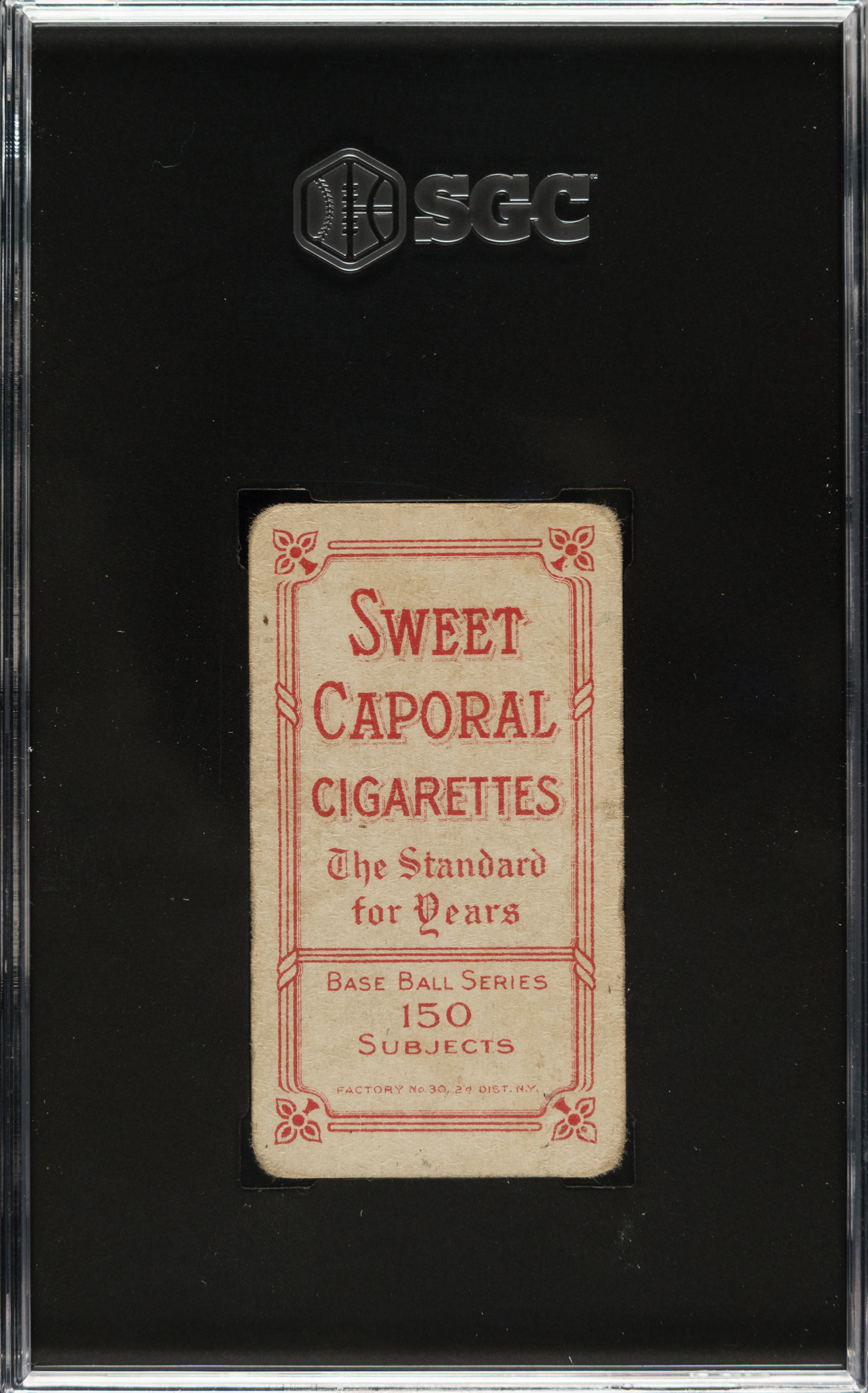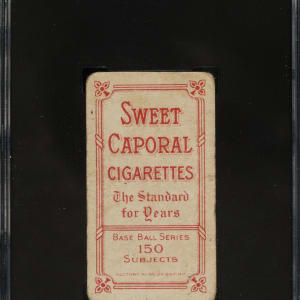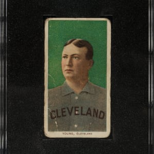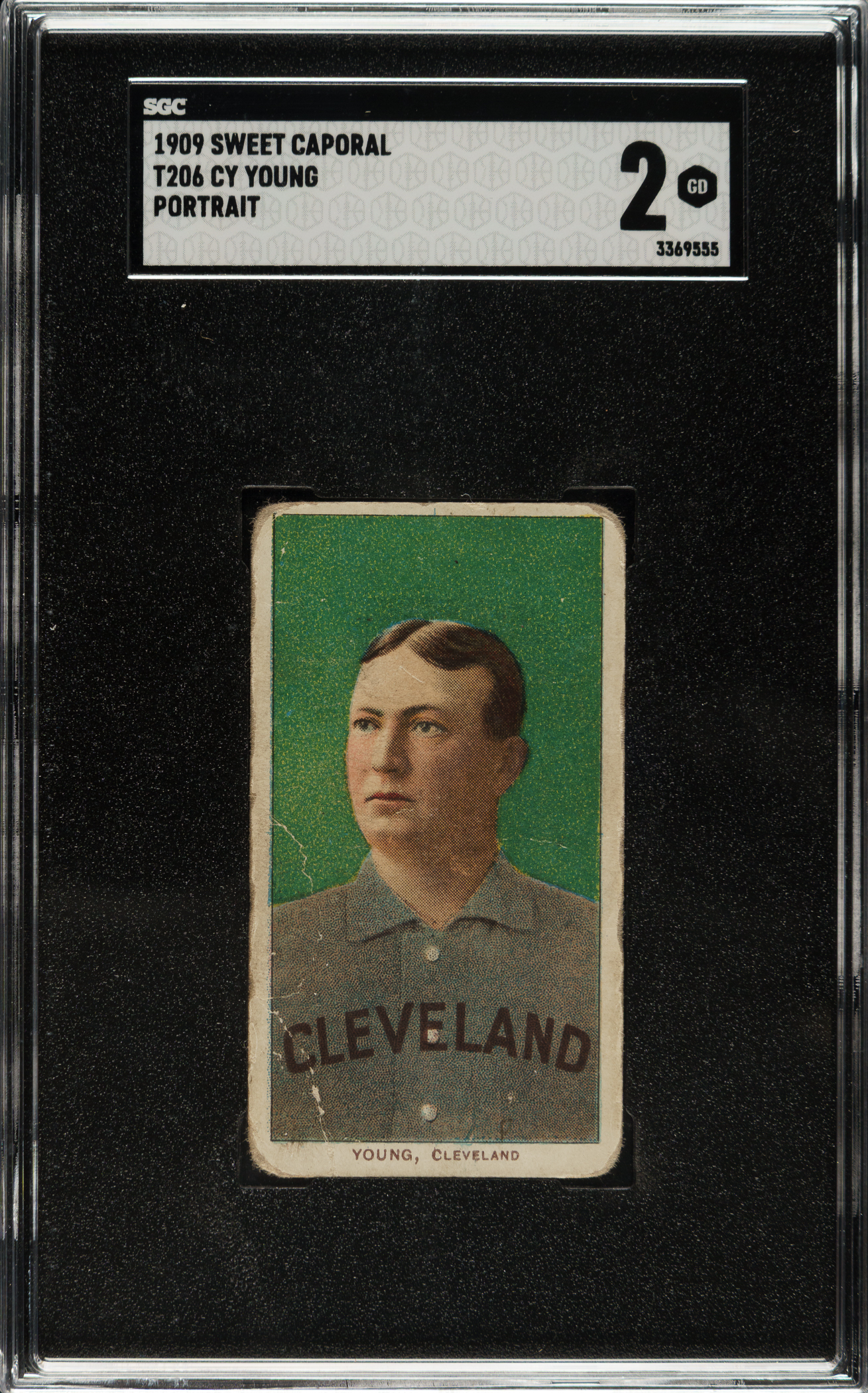 Graded GOOD 2 by SGC. Attractive T206 portrait of Cleveland Naps Hall of Famer Cy Young set against a beautiful green background. This is one of Cy Young's most striking cards and one of the most popular cards in the entire T206 set. The offered card has vibrant colors, outstanding registration, rounded corners, and scattered creases. The Sweet Caporal 150/30 advertising reverse is boldly printed.