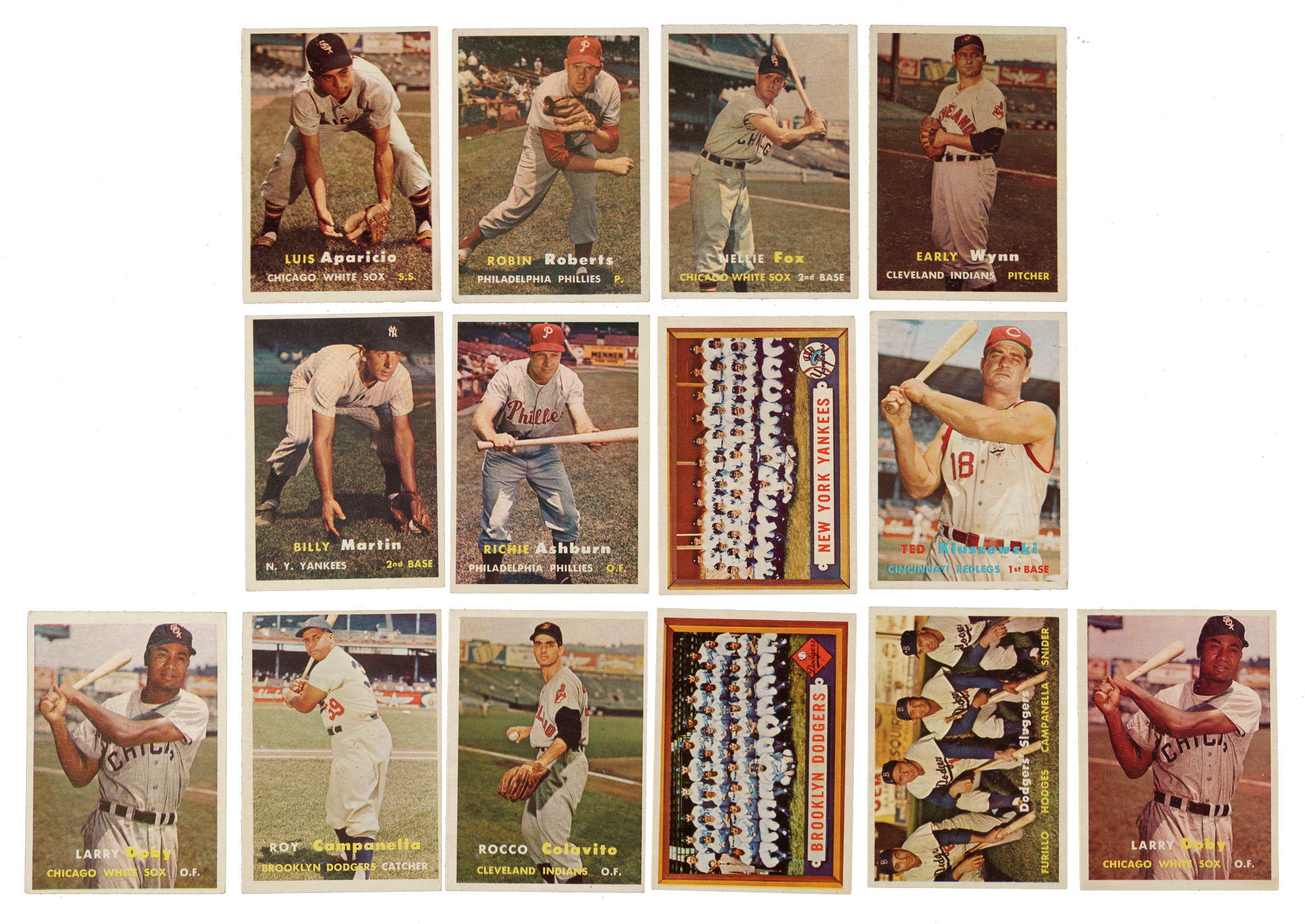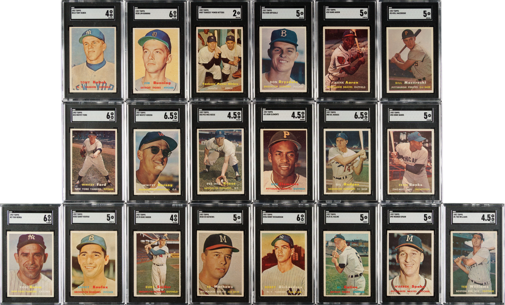This is a very attractive, mostly mid- to high-grade complete set of the classic 1957 Topps issue. Highlighted by the rookie cards of Don Drysdale, Frank Robinson, and Brooks Robinson, the 1957 Topps set includes many additional key star cards, among them Ted Williams and Mickey Mantle. Includes seven duplicates (#14, 64, 78, 85, 92, 257, and 262). Condition is 12% Ex-Mt to Nr/Mt, 69% Vg-Ex to Ex, 14% Gd to Vg, and 5% lesser. Twenty-four cards have been professionally graded and encapsulated by SGC. Keys: #1 T. Williams (VG/EX+ 4.5), 2 Berra (EX/NM 6), 7 Aparicio (Gd+), 10 Mays (EX 5), 15 Roberts (Vg-Ex), 18 Drysdale RC (EX 5), 20 Aaron (EX 5), 24 Mazeroski RC (EX 5), 25 Ford (EX/NM 6), 29 Herzog RC (EX/NM+ 6.5), 30 Reese (VG/EX+ 4.5), 35 F. Robinson RC (EX 5), 38 Fox (Vg-Ex), 40 Wynn (Vg-Ex), 55 Banks (EX 5), 62 Martin (Vg-Ex), 70 Ashburn (Ex), 76 Clemente (VG/EX+ 4.5), 80 Hodges (EX/NM+ 6.5), two 85 Doby (Ex and Vg+), 90 Spahn (EX 5), 95 Mantle (VG/EX+ 4.5), 97 Yankees Team (Vg-Ex+), 125 Kaline (EX 5), 165 Kluszewski (Vg-Ex), 170 Snider (VG/EX 4), 210 Campanella (Vg-Ex+), 212 Colavito RC (Ex), 250 Mathews (EX 5), 286 Richardson RC (EX/NM 6), 302 Koufax (EX 5), 312 Kubek RC (VG/EX 4), 324 Dodgers Team (Ex), 328 B. Robinson RC (NM 7), 338 Bunning RC (EX/NM 6), 400 Dodgers' Sluggers (Fr due mostly to small tear of top edge), and 407 Mantle/Berra (GOOD 2). 1957 Topps have always been very popular due to their classic photographic style and inclusion of so many stars. This is a very attractive complete set of this extremely desirable 1950s baseball issue, with 24 key cards graded and encapsulated by SGC. Total: 414 cards (set of 407 plus seven duplicates). The size/weight of this item requires that there will be an additional shipping charge for this lot.