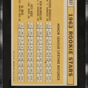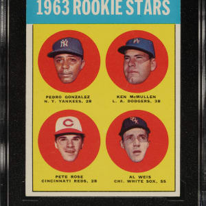 Graded NM 7 by SGC. High-grade example of the 1963 Topps Pete Rose (Cincinnati Reds) rookie card, one of baseball-card collecting's modern classics. This card is particularly difficult to find in high grade due to the flush-to-the-border design, which makes the top edges and corners so susceptible to wear. The offered card has vibrant colors, superb image quality, and light corner wear. Clean reverse.