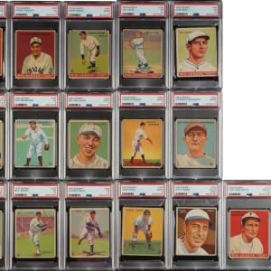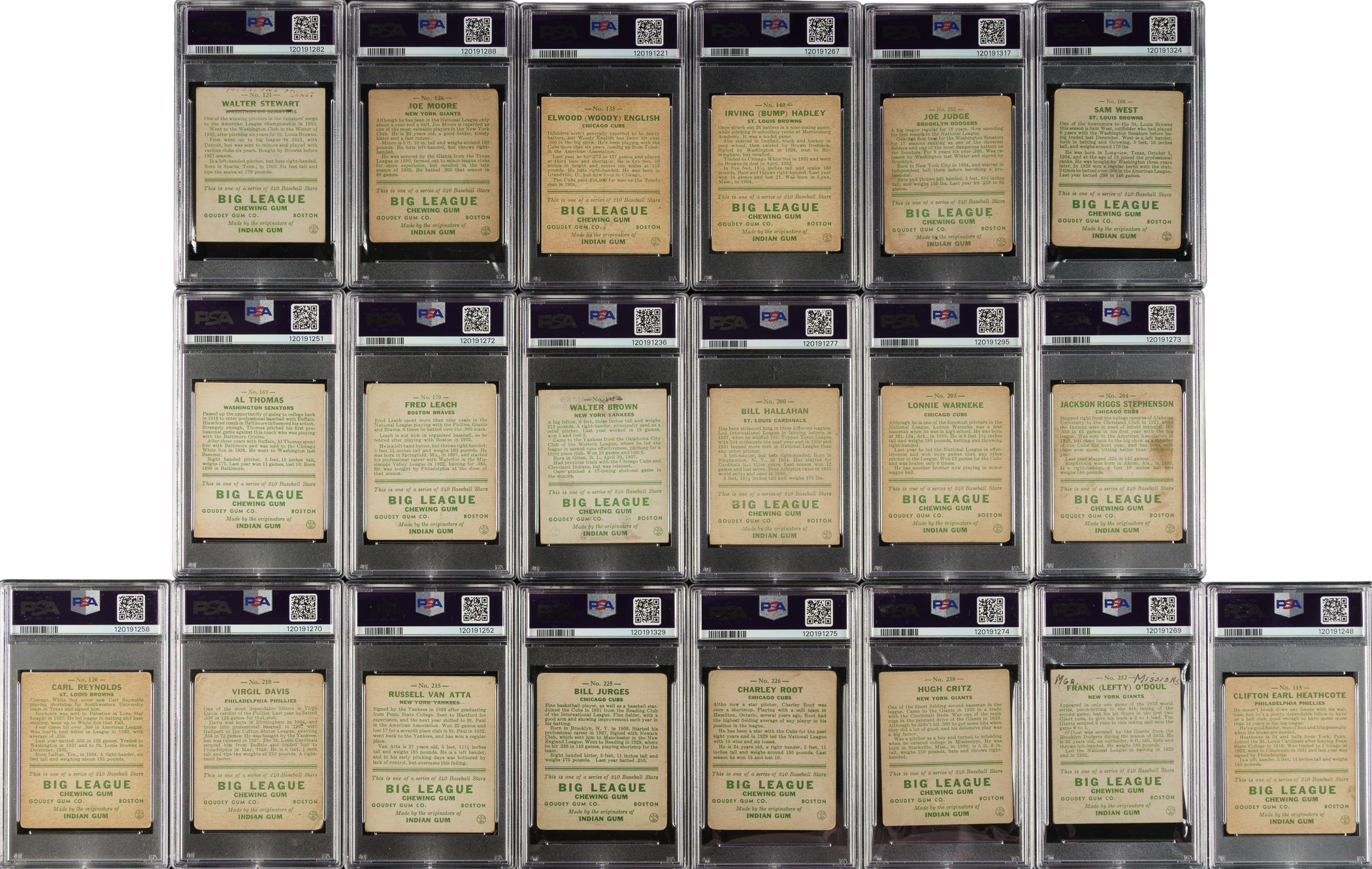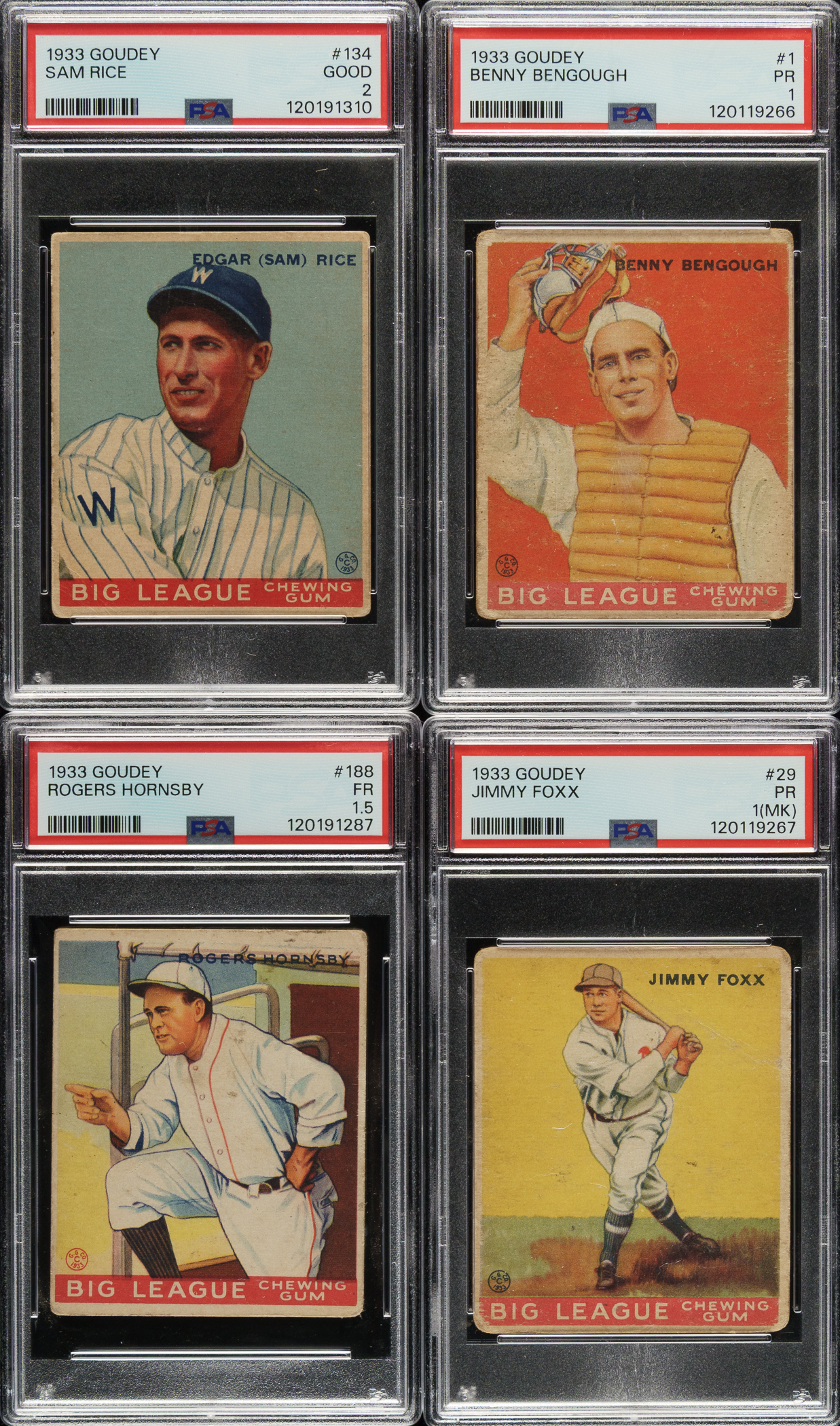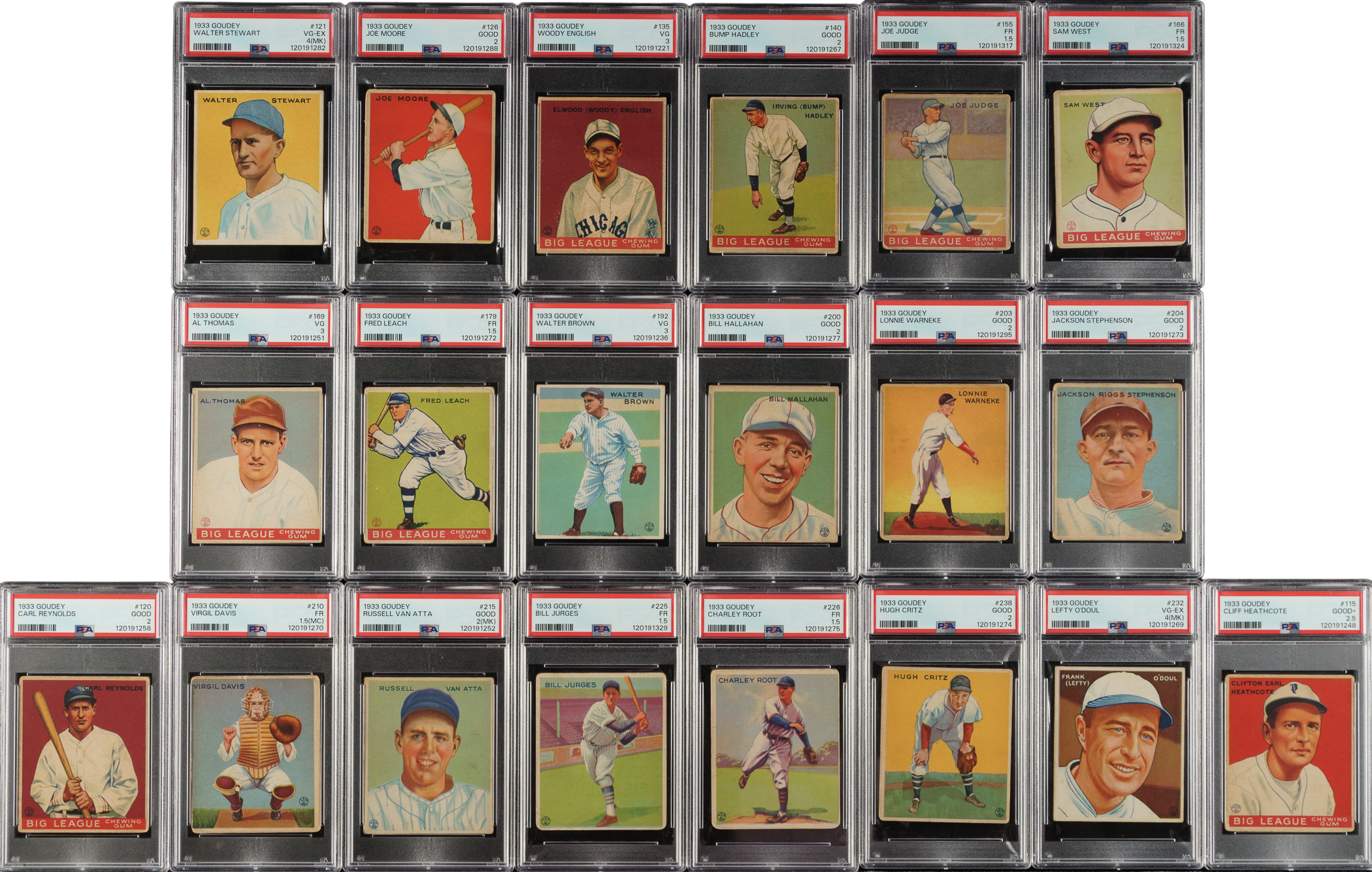 The 1933 Goudey set is recognized as the single most popular and collected of all 1930s gum issues and one of the most significant of all prewar baseball-card issues. Presented is a partial set of 1933 R319 Goudey consisting of 99 different cards (out of 240 in the set), including 56 cards that have been professionally graded and encapsulated by PSA. This collection is highlighted by 17 Hall of Famers including Jimmie Foxx, Eddie Collins, Bill Terry, and Rogers Hornsby. PSA Grading Composite: VG-EX 4 (5 cards): #17 (MK), 91, 114 (MK), 121 (MK), and 232 O'Doul (MK). VG 3 (13 cards): #10, 12 (MK), 40, 41, 42 Collins, 50, 59 (MK), 61, 104, 113 (MK), 135, 169, and 192. GOOD+ 2.5 (2 cards): #70 and 115. GOOD 2 (16 cards): #6b/age is 36 in bio, 16, 75, 96, 110 Goslin, 120, 126, 134 Rice, 138 Pennock, 140, 194 Averill, 200, 203, 204, 215 (MK), and 238. FAIR 1.5 (13 cards): #9 (MK), 14, 18, 44 Bottomley, 51, 63 Cronin, 155, 166, 179, 188 Hornsby, 210 (MC), 225, and 226. POOR 1 (7 cards): #1 Bengough, 29 Foxx (MK), 60 Hoyt, 64 Grimes, 99, 125 Terry (MK), and 187 Manush. Unencapsulated (43): Condition ranges from Pr to Gd, averaging Fr (with a couple slightly better). Includes: #5, 38, 39, 43, 66, 67, 71, 82, 85, 86, 94, 95, 101, 105, 108, 112, 122, 123, 124, 131, 141, 146, 150, 153, 167, 170, 175, 178, 180, 183, 186, 189 Cronin (Fr), 196, 198, 199, 205, 208, 212, 216 Gomez (Fr), 218, 224, 235, and 240 Schumacher (Fr). This collection of 99 different 1933 Goudey Gum cards represents an outstanding foundation for the assembly of a medium- to lower-grade complete set of this classic 1930s gum-card issue. Total: 99 cards. The size/weight of this item requires that there will be an additional shipping charge for this lot.