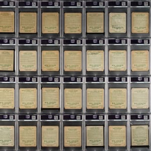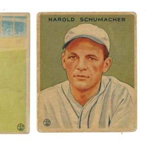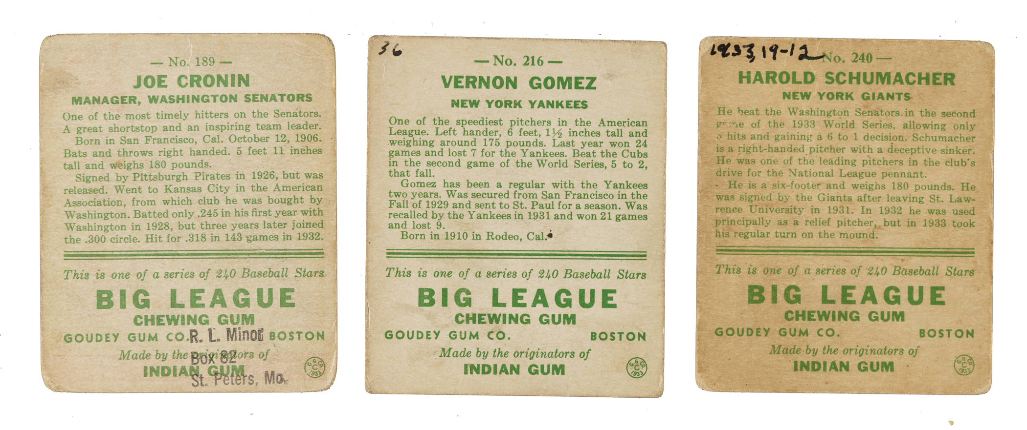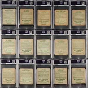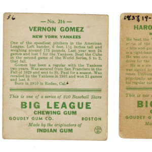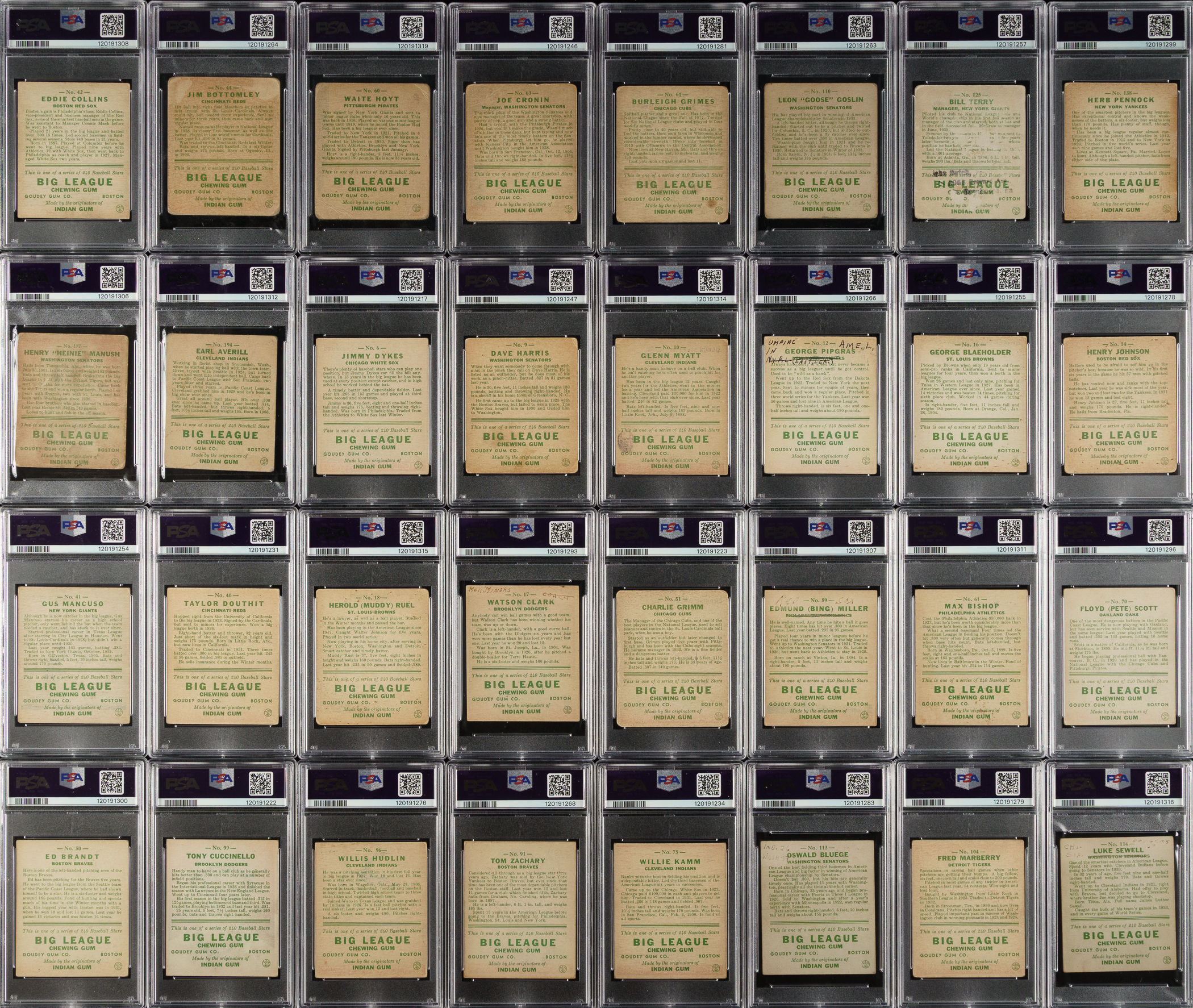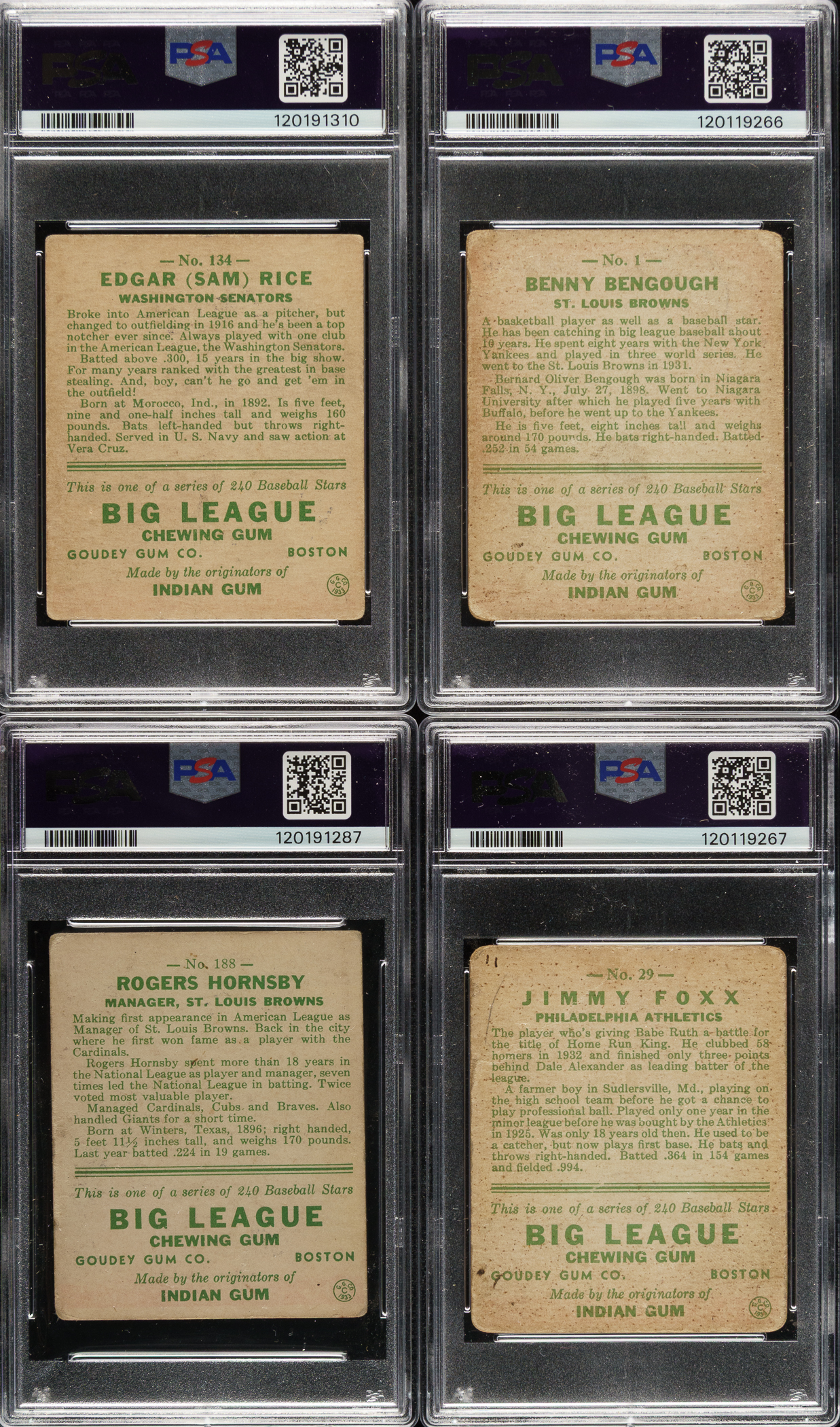 The 1933 Goudey set is recognized as the single most popular and collected of all 1930s gum issues and one of the most significant of all prewar baseball-card issues. Presented is a partial set of 1933 R319 Goudey consisting of 99 different cards (out of 240 in the set), including 56 cards that have been professionally graded and encapsulated by PSA. This collection is highlighted by 17 Hall of Famers including Jimmie Foxx, Eddie Collins, Bill Terry, and Rogers Hornsby. PSA Grading Composite: VG-EX 4 (5 cards): #17 (MK), 91, 114 (MK), 121 (MK), and 232 O'Doul (MK). VG 3 (13 cards): #10, 12 (MK), 40, 41, 42 Collins, 50, 59 (MK), 61, 104, 113 (MK), 135, 169, and 192. GOOD+ 2.5 (2 cards): #70 and 115. GOOD 2 (16 cards): #6b/age is 36 in bio, 16, 75, 96, 110 Goslin, 120, 126, 134 Rice, 138 Pennock, 140, 194 Averill, 200, 203, 204, 215 (MK), and 238. FAIR 1.5 (13 cards): #9 (MK), 14, 18, 44 Bottomley, 51, 63 Cronin, 155, 166, 179, 188 Hornsby, 210 (MC), 225, and 226. POOR 1 (7 cards): #1 Bengough, 29 Foxx (MK), 60 Hoyt, 64 Grimes, 99, 125 Terry (MK), and 187 Manush. Unencapsulated (43): Condition ranges from Pr to Gd, averaging Fr (with a couple slightly better). Includes: #5, 38, 39, 43, 66, 67, 71, 82, 85, 86, 94, 95, 101, 105, 108, 112, 122, 123, 124, 131, 141, 146, 150, 153, 167, 170, 175, 178, 180, 183, 186, 189 Cronin (Fr), 196, 198, 199, 205, 208, 212, 216 Gomez (Fr), 218, 224, 235, and 240 Schumacher (Fr). This collection of 99 different 1933 Goudey Gum cards represents an outstanding foundation for the assembly of a medium- to lower-grade complete set of this classic 1930s gum-card issue. Total: 99 cards. The size/weight of this item requires that there will be an additional shipping charge for this lot.