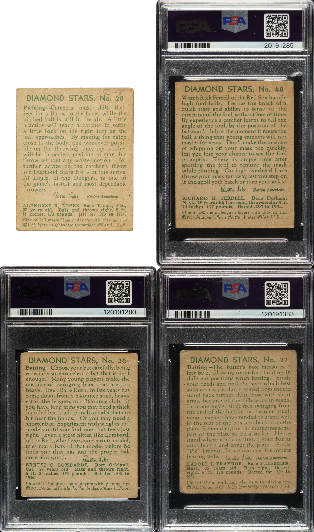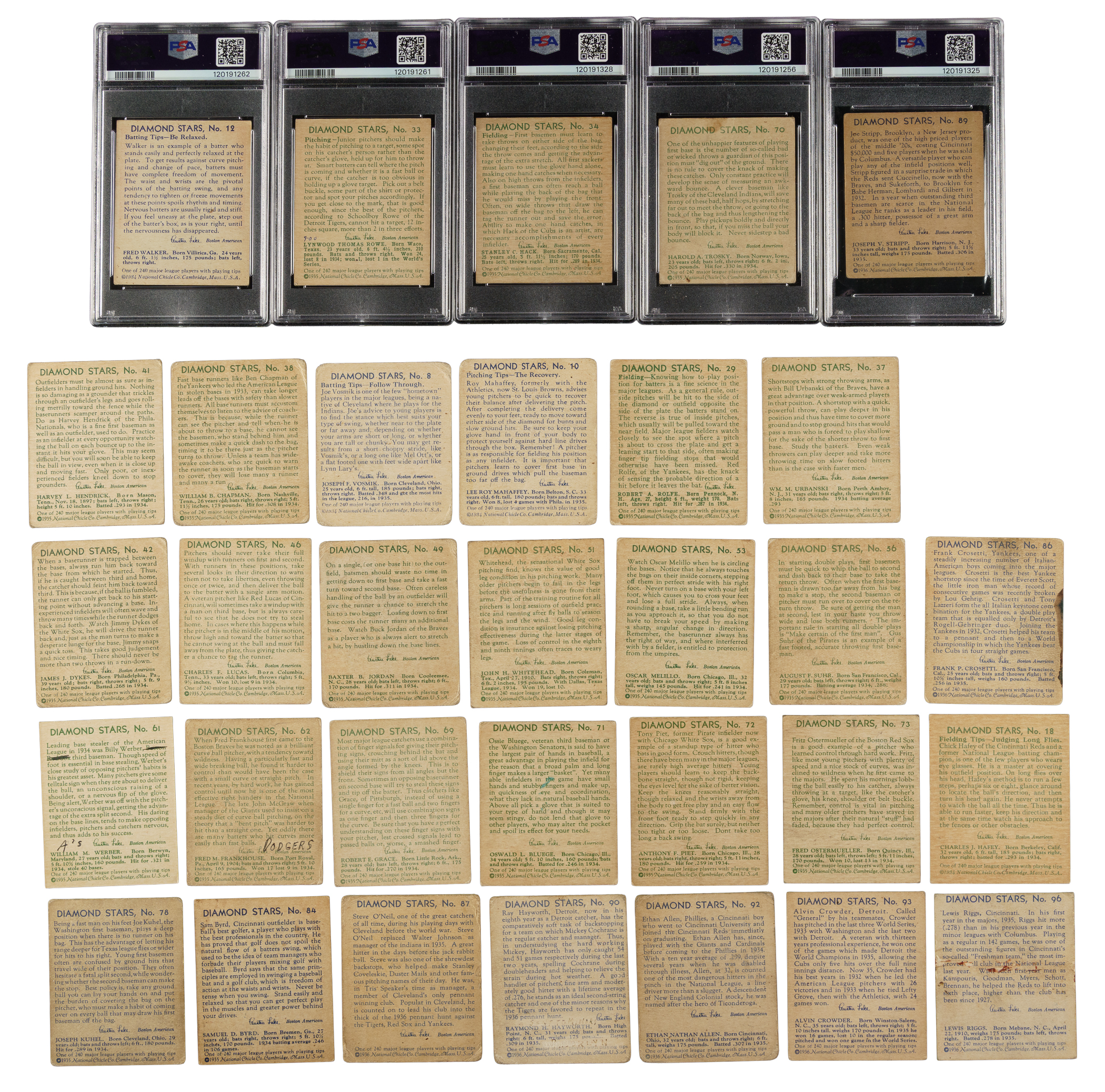 Presented is an attractive medium- to lower-grade collection of 36 different cards from the R327 Diamond Stars series, highlighted by six Hall of Famers. This classic 1930s gum card issue is one of the most popular of the era. Condition is 16% Vg-Ex to Ex, 48% Gd to Vg, and 36% Pr to Fr. Eight cards have been professionally graded and encapsulated by PSA. This collection consists of the following (1935 unless noted): #8 (1936), 10 (1936), 12 (1936, VG 3), 18 Hafey (Ex), 27 Traynor (POOR 1), 28 Lopez (pencil on reverse, otherwise Vg), 29, 33 (VG-EX 4), 34 (VG-EX 4), 36 'Ernie' Lombardi (GOOD 2), 37, 38, 41, 42, 46, 48 Ferrell (VG 3), 49, 51, 53, 56, 61, 62, 69, 70 (GOOD+ 2.5), 71, 72, 73 (green back), 78 (blue back), 84 (1935), 86 Crosetti (Pr), 87, 89 (FAIR 1.5), 90, 92, 93, and 96. This is a sizable group, which could provide the foundation for the assembly of a complete set of one of the 1930s most popular issues. Total: 36 cards.