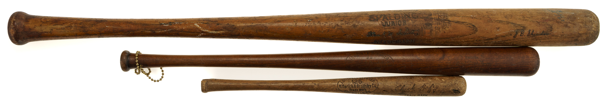 Trio of mini and junior signature-model bats dating from the 1910s to the 1930s. This collection consists of the following: 1) Frank Schulte Spalding junior signature-model bat. Featuring J.B. Sheridan's engraved facsimile signature along the top of the barrel. Sheridan was a sportswriter who was honored by the Baseball Hall of Fame with induction into its Roll of Honor in 1946. The bat displays moderate handling wear. Length: 30 inches. 2) Chick Hafey H&B signature-model mini bat. The bat displays moderate handling wear with multiple chips along the knob. Length: 14 inches. 3) Bill Terry H&B signature-model mini bat. The bat displays light handling wear. Length: 22 inches. Total: 3 bats. The size/weight of this item requires that there will be an additional shipping charge for this lot.