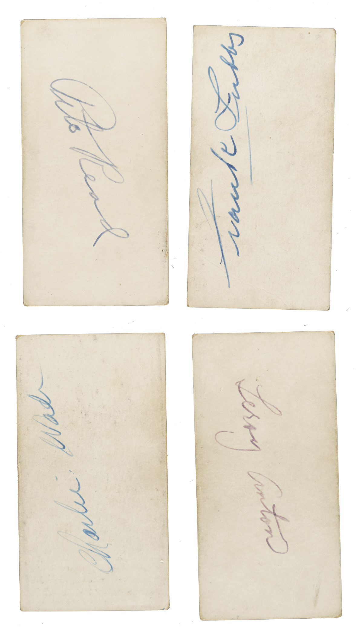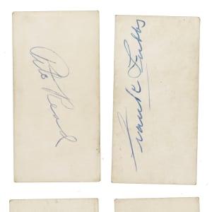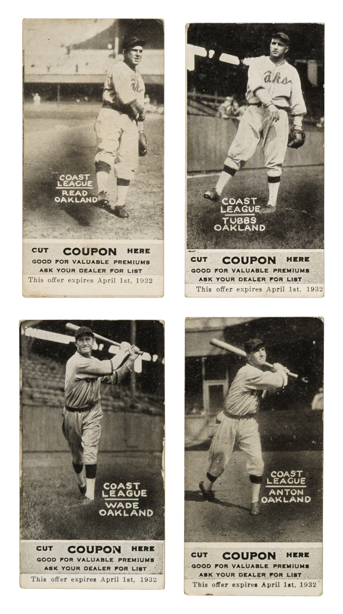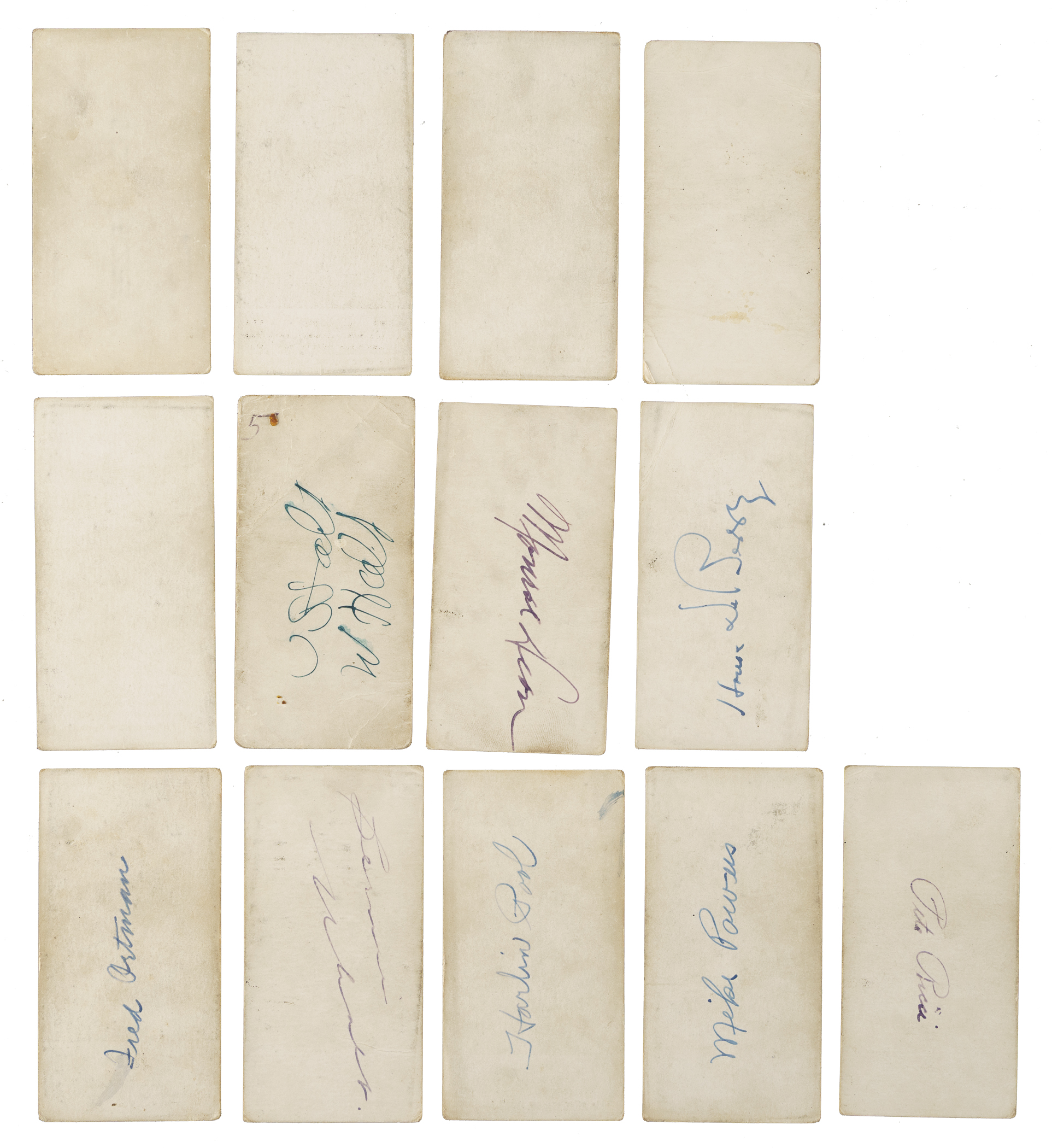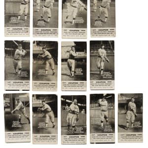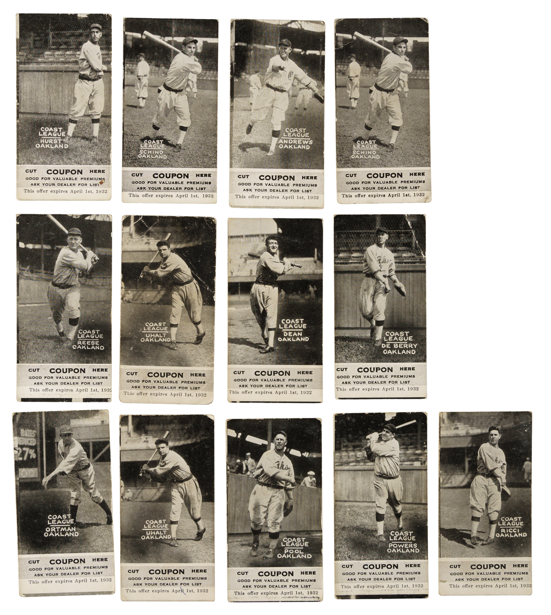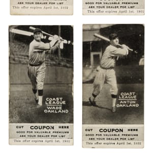 Presented is a collection of 1931 Zeenut PCL baseball cards (17 in total, all with coupons), including 12 signed examples. These cards originate from a large collection of over 600 Zeenuts consigned to this auction, a number of which bear scripted names on the reverse, including 11 in this lot. Our consignor did select a handful of cards to be sent to PSA/DNA prior to consigning, and some of those did not pass authentication, either because they were deemed to be nonplayer written identifiers or exemplars were not available for the given player. These 12 cards are presented without authentication, but in our opinion, several appear to be authentic player signatures. Condition ranges from Gd to Vg, with a couple slightly lesser (Pr). This collection consists of the following: Andrews (unsigned), Anton, De Berry, Dean, Hurst (unsigned), Ortman, Pool, Powers, Read, Reese (unsigned), Ricci, two Schino (both unsigned), Tubbs, two Uhalt, and Wade. Total: 17 cards (12 signed).