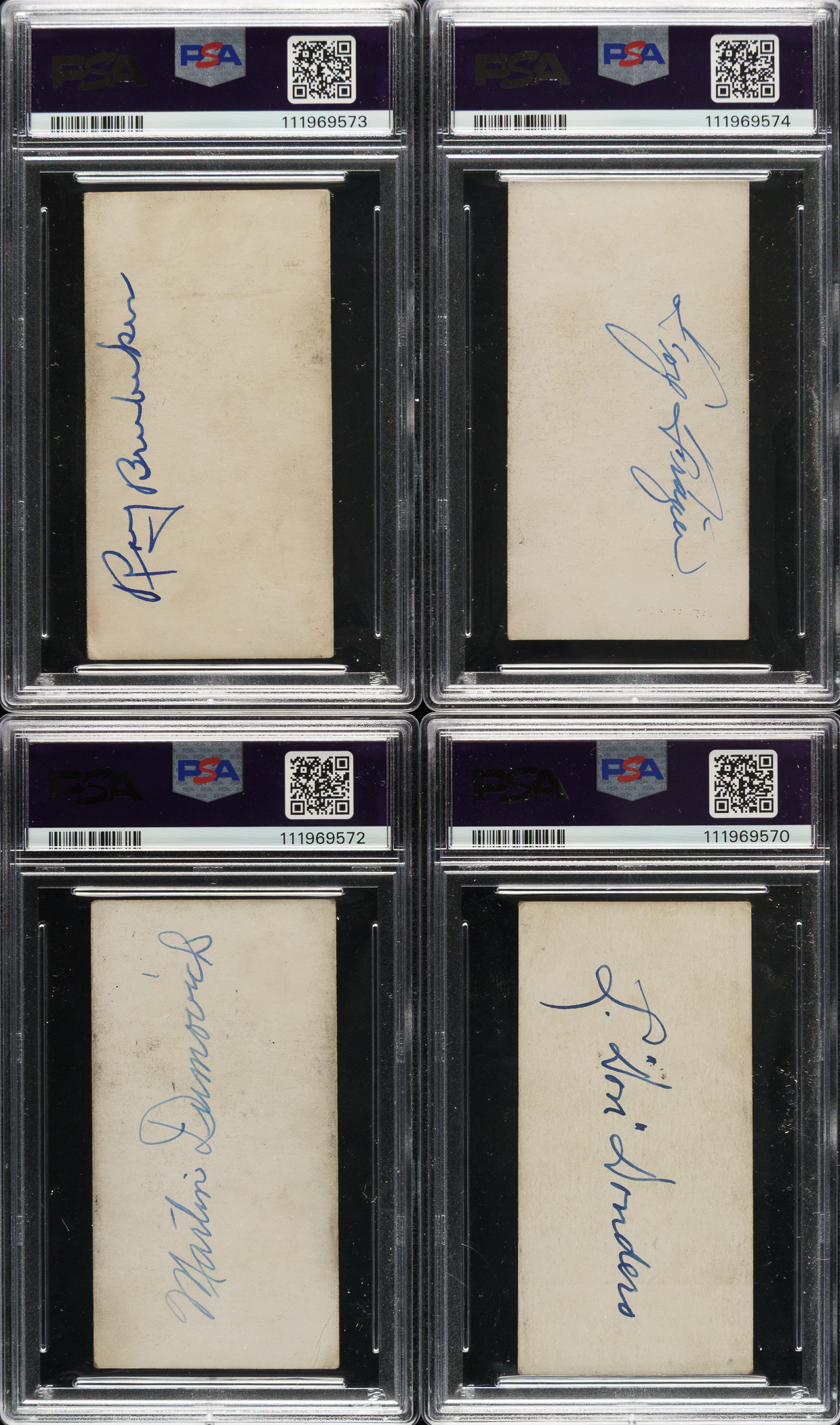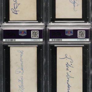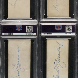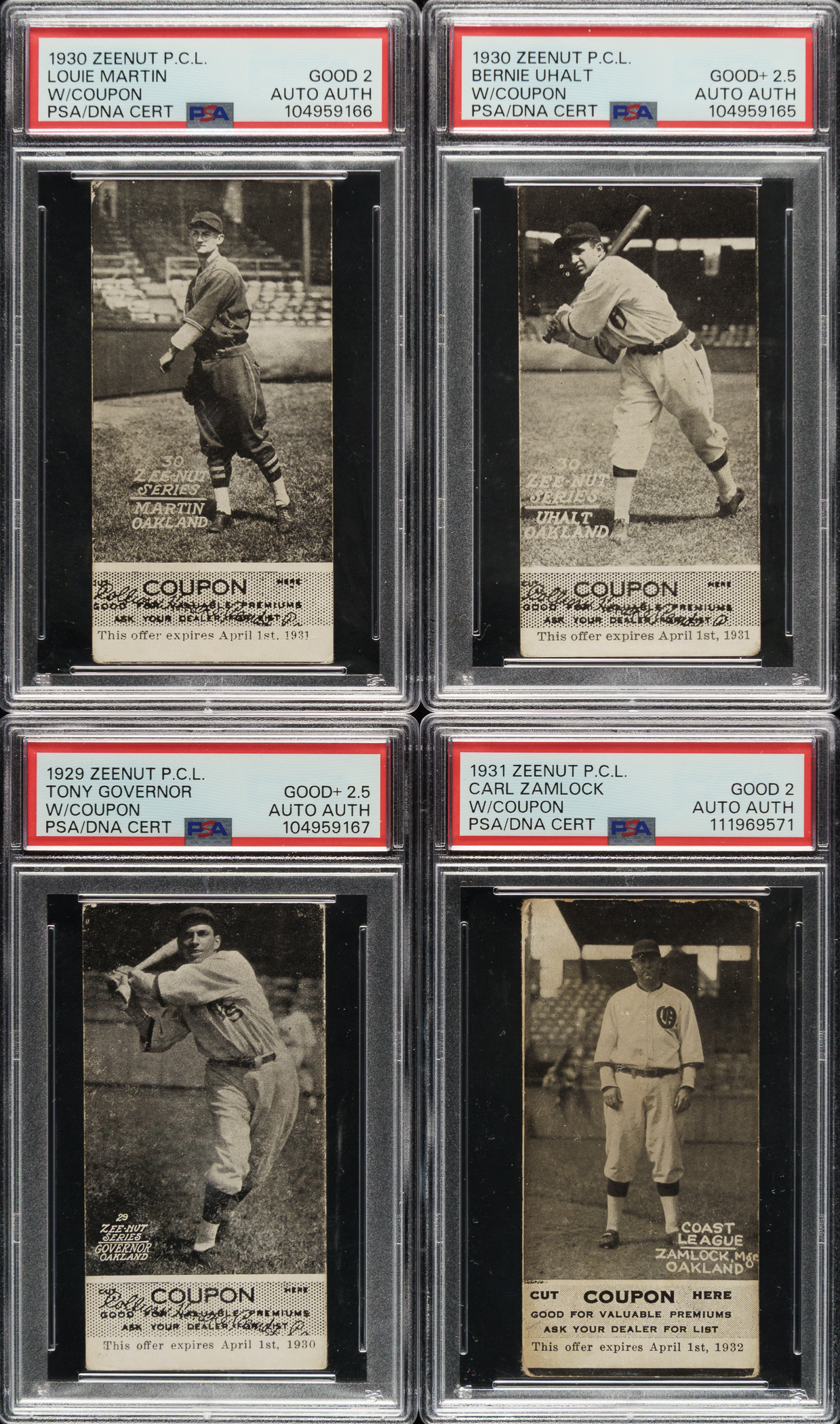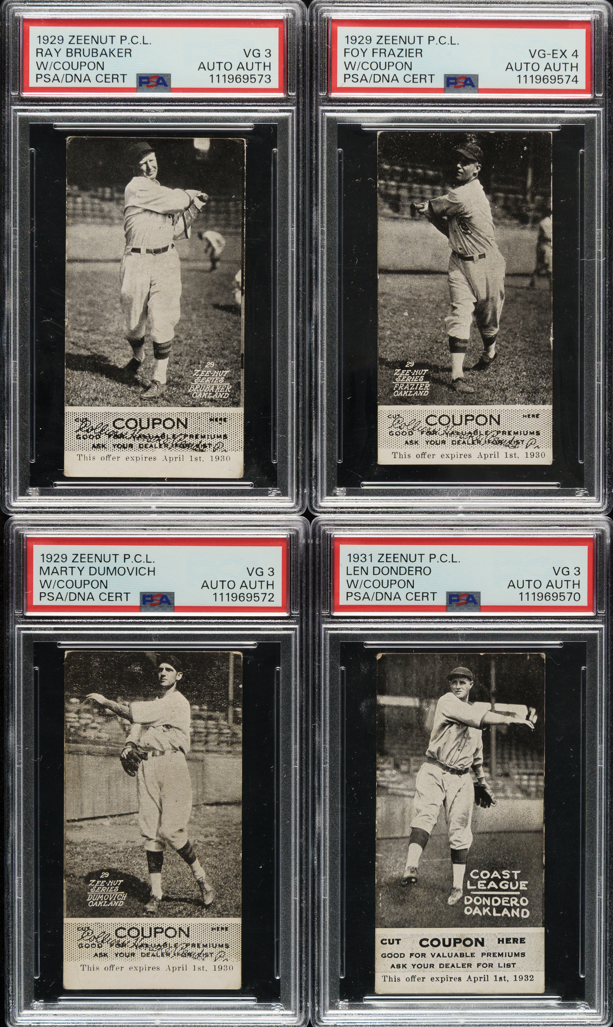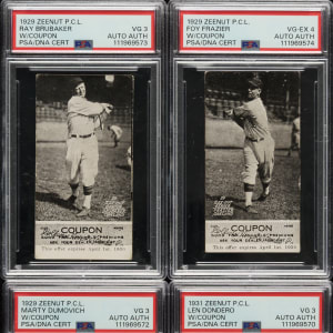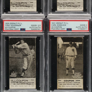 Collection of eight rare Zeenut PCL cards, dating from the late 1920s and early 1930s, representing three different sets, each with the original coupon attached to the bottom. Zeenuts are scarce to begin with, but they rarely survive with coupons intact. The coupons were intended to be cut off by youngsters and redeemed for prizes. The offered group is all the more noteworthy as each is signed on the reverse (all blue ink except one in pencil) by the respective player pictured. Each card is authenticated and encapsulated by PSA/DNA, and the card itself has been assigned a numerical grade. This collection consists of the following: 1) 1929 (4 cards): Brubaker (VG 3), Dumovich (VG 3), Frazier (VG-EX 4), and Governor (GOOD+ 2.5). 2) 1930 (2 cards): Martin (GOOD 2) and Uhalt (GOOD+ 2.5). 3) 1931 (2 cards): Dondero (VG 3) and Zamlock (GOOD 2). This is a rarely offered Zeenut candy card collection with coupons intact, with the added significance of each being signed by the respective player. Total: 8 cards.