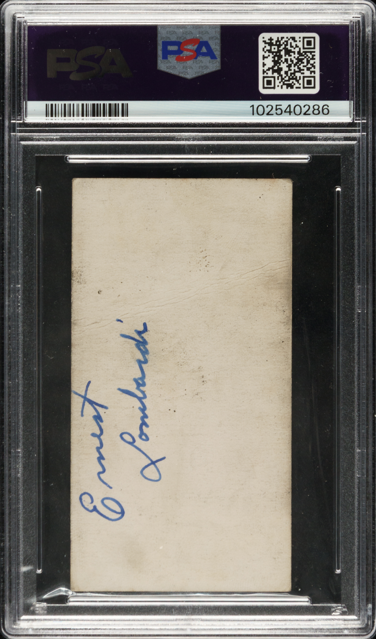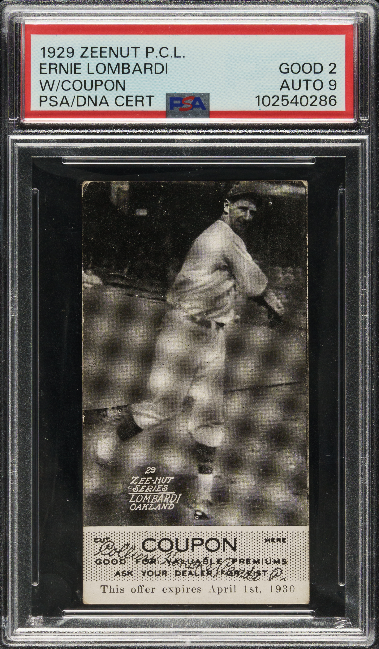 Attractive example of Hall of Famer Ernie Lombardi of the Oakland Oaks, one of the key cards in the 1929 Zeenut PCL series, with the original coupon attached to the bottom. Zeenuts are scarce to begin with, but they rarely survive with coupons intact. The coupons were intended to be cut off by youngsters and redeemed for prizes. This is one of only three cards of Lombardi issued during his playing days in the PCL (the others are the 1928 and 1930 Zeenuts, which the 1930 is also offered in this auction). The offered example is all the more noteworthy as it is signed by Lombardi in blue ink on the reverse. PSA/DNA has graded the signature MINT 9 and the card GOOD 2. This is the ONLY signed example of this card ever encapsulated by PSA/DNA and we cannot imagine that many period signed examples even exist (amazingly we have two different ones in this current auction)! This is a rarely offered Zeenut candy card featuring a Hall of Famer with coupon intact, and the added significance of being signed by the respective player.