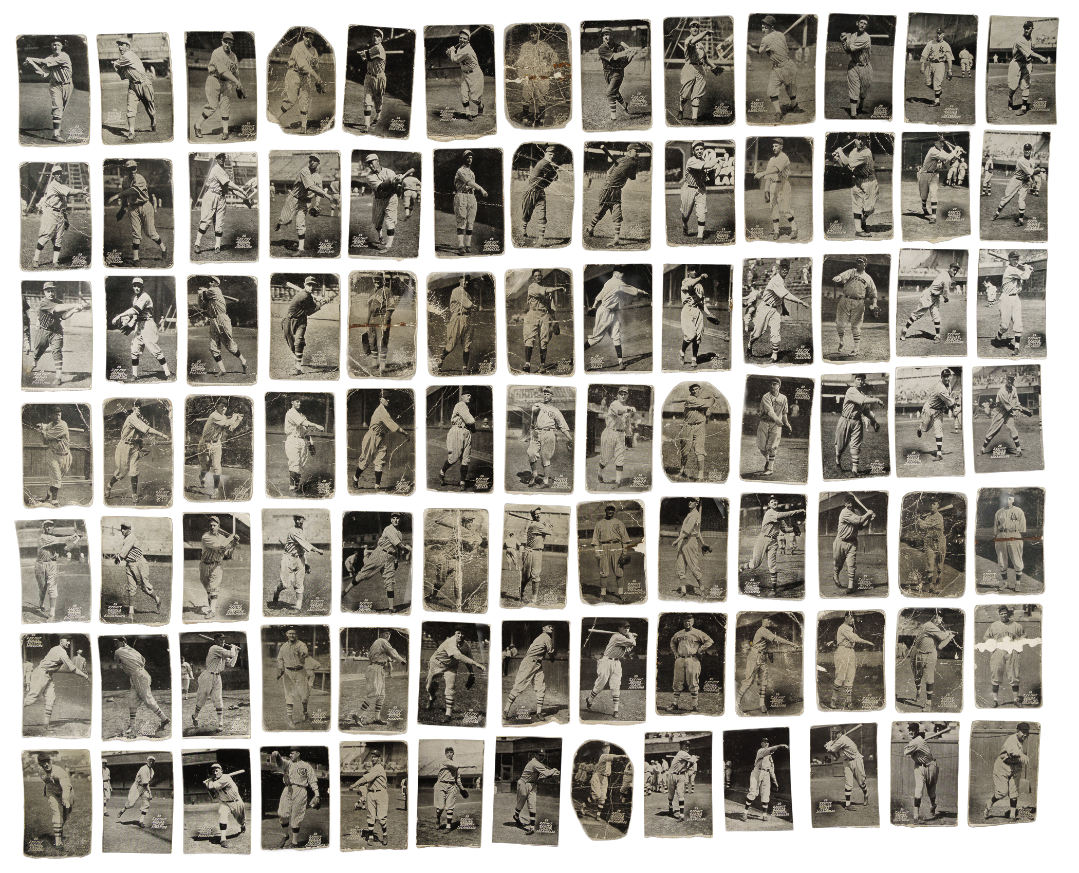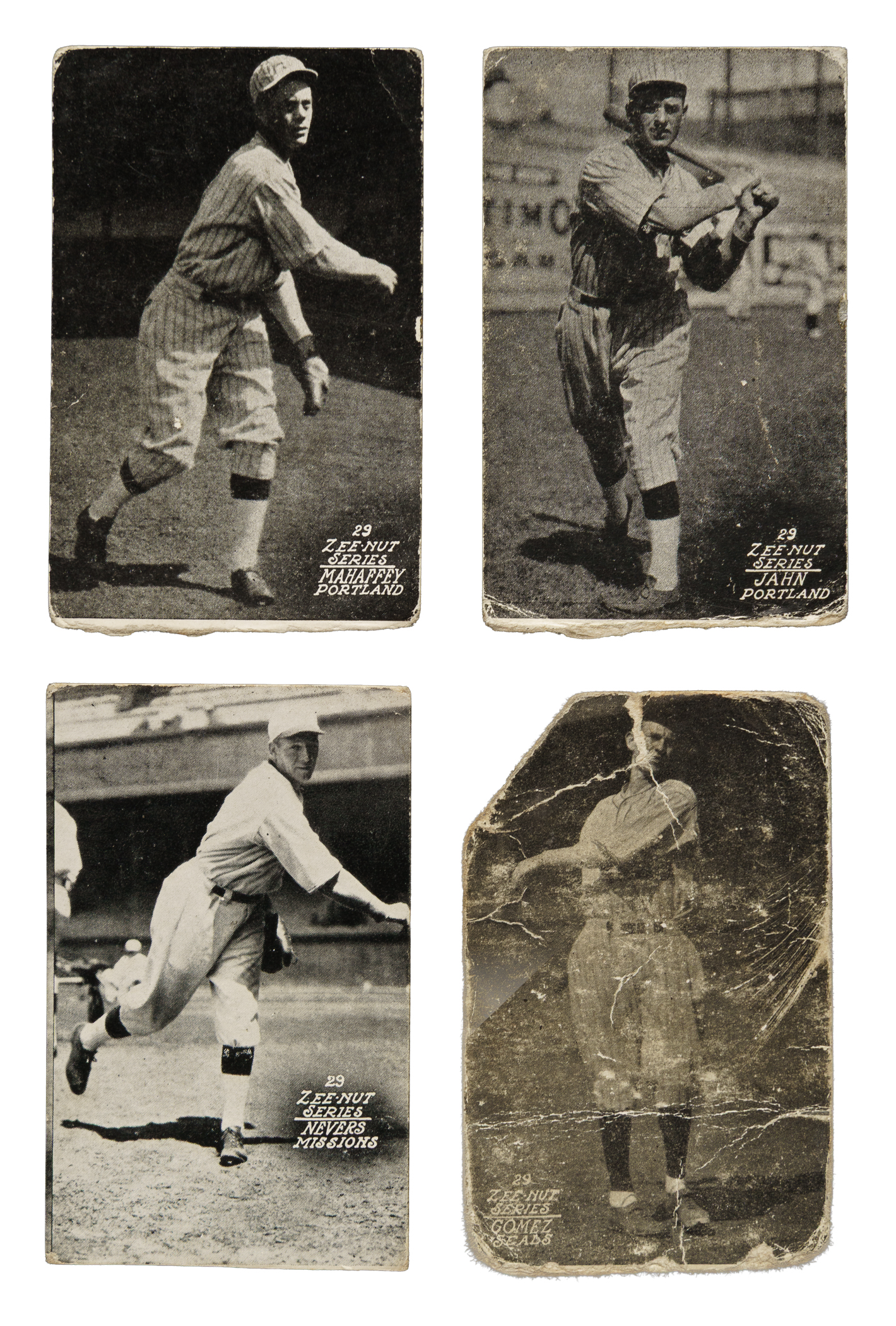 Presented is a partial set of 128 of the 168 different 1929 Zeenut cards featuring Pacific Coast League players, highlighted by Ernie Nevers and Hall of Famer Lefty Gomez (rookie card). The 1929 Zeenut set is comprised of players from eight different teams (Hollywood, Los Angeles, Mission, Oakland, Portland, Sacramento, San Francisco, and Seattle). A large grouping such as this is very rarely seen. Condition is 25% Gd to Vg and 75% Pr to Fr (including some that are heavily worn). As is usually the case with Zeenuts, the coupon at the bottom of each card has been clipped away, as intended, to be redeemed for valuable prizes. Keys: Gomez RC (Pr with clipped corner) and Nevers (Vg). Missing the following 40 cards for completion: Anton, Baker, Baldwin, Boehler, Brooks, Brubaker, Burns, Carlyle, Caveney, Craghead, Crandall, Crosetti, Daglia, Dean, Dumovich, Fenton, Frazier, Governor, Holling, Howard, Hurst, Jacobs, Jeffcoat, Jolley, L. Jones, Kasich, Lombardi, Mails, McEvoy, McIssacs, Oana, Olney, Pinelli, Read, Reed, Reese, Statz, Suhr, Vergez, and Wingo. This 1929 Zeenut partial set is part of a comprehensive Zeenut collection which has been broken down into a number of smaller but still very substantial lots. Total: 129 cards (set of 128 plus one duplicate).