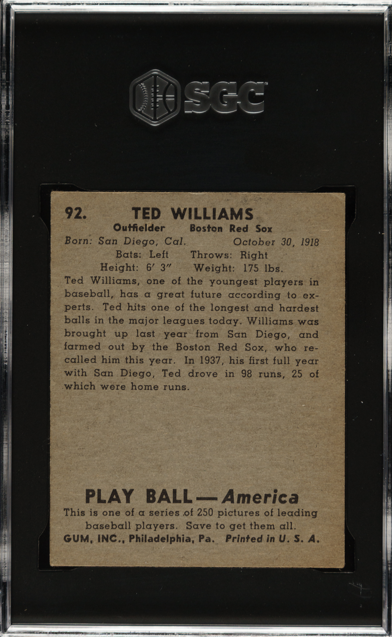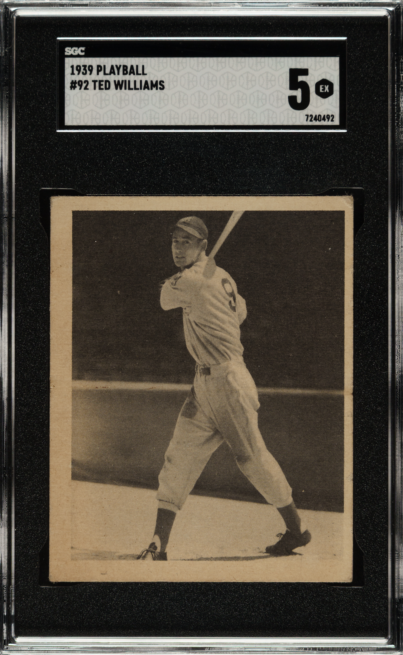 Graded EX 5 by SGC. Mid-grade example of Boston Red Sox Hall of Famer Ted Williams' rookie card from the 1939 Play Ball set. The Play Ball Williams rookie has always been recognized as one of vintage-card collecting's great classics. This example has exceptional image clarity and moderate corner wear. Clean reverse. This classic rookie card is one of the key cards from the 1939 Play Ball set and one of the most popular cards of the era.