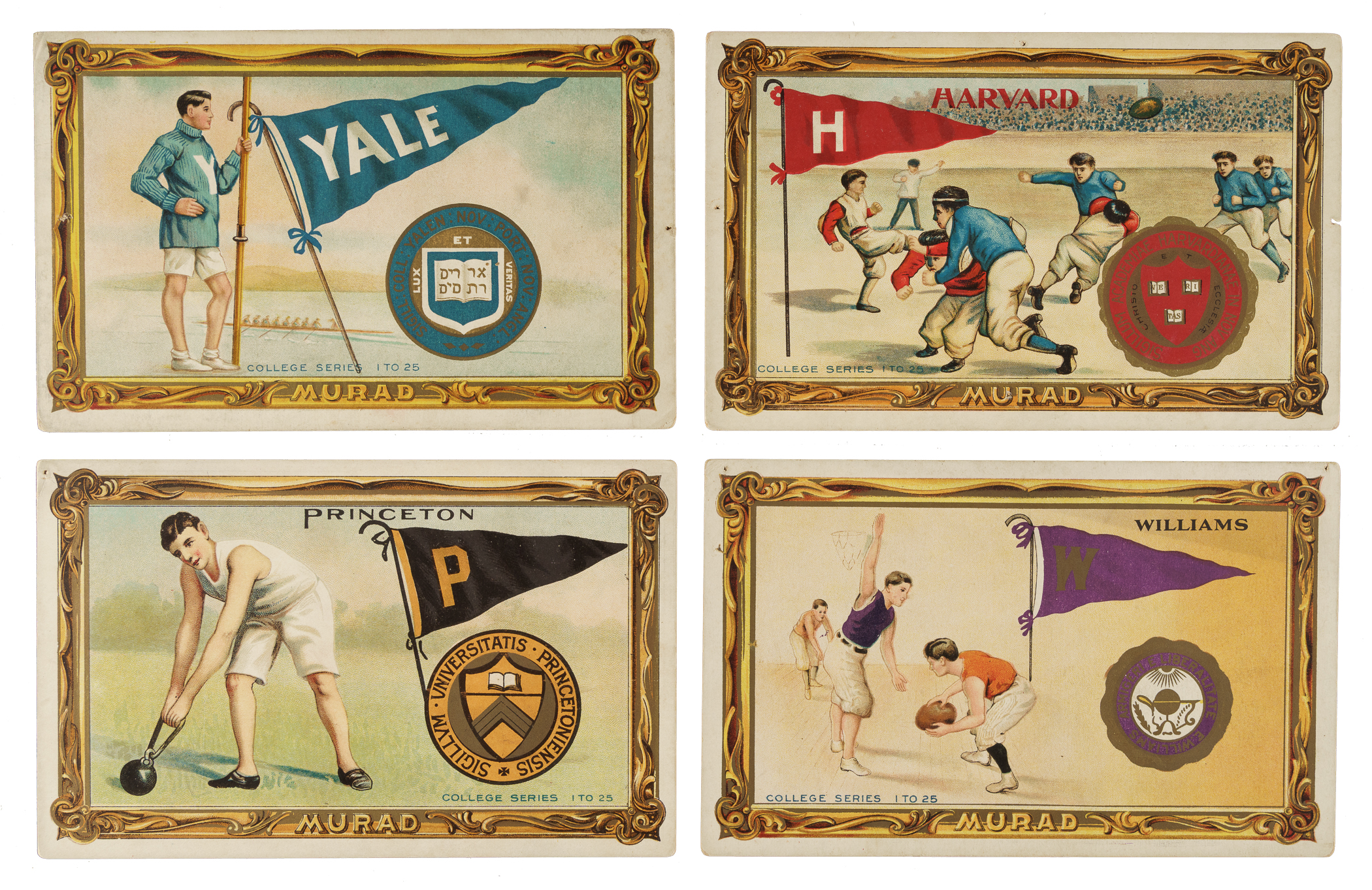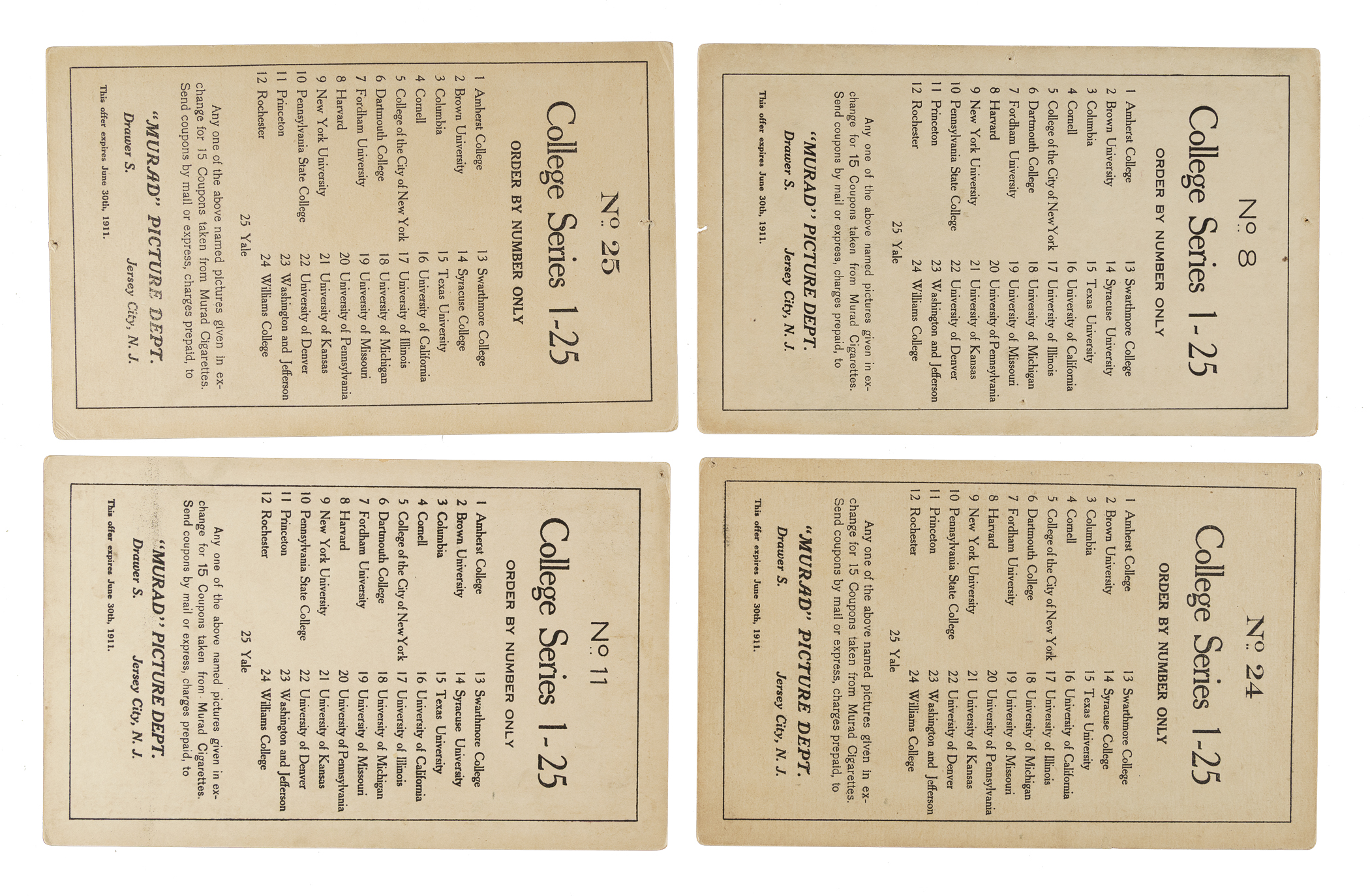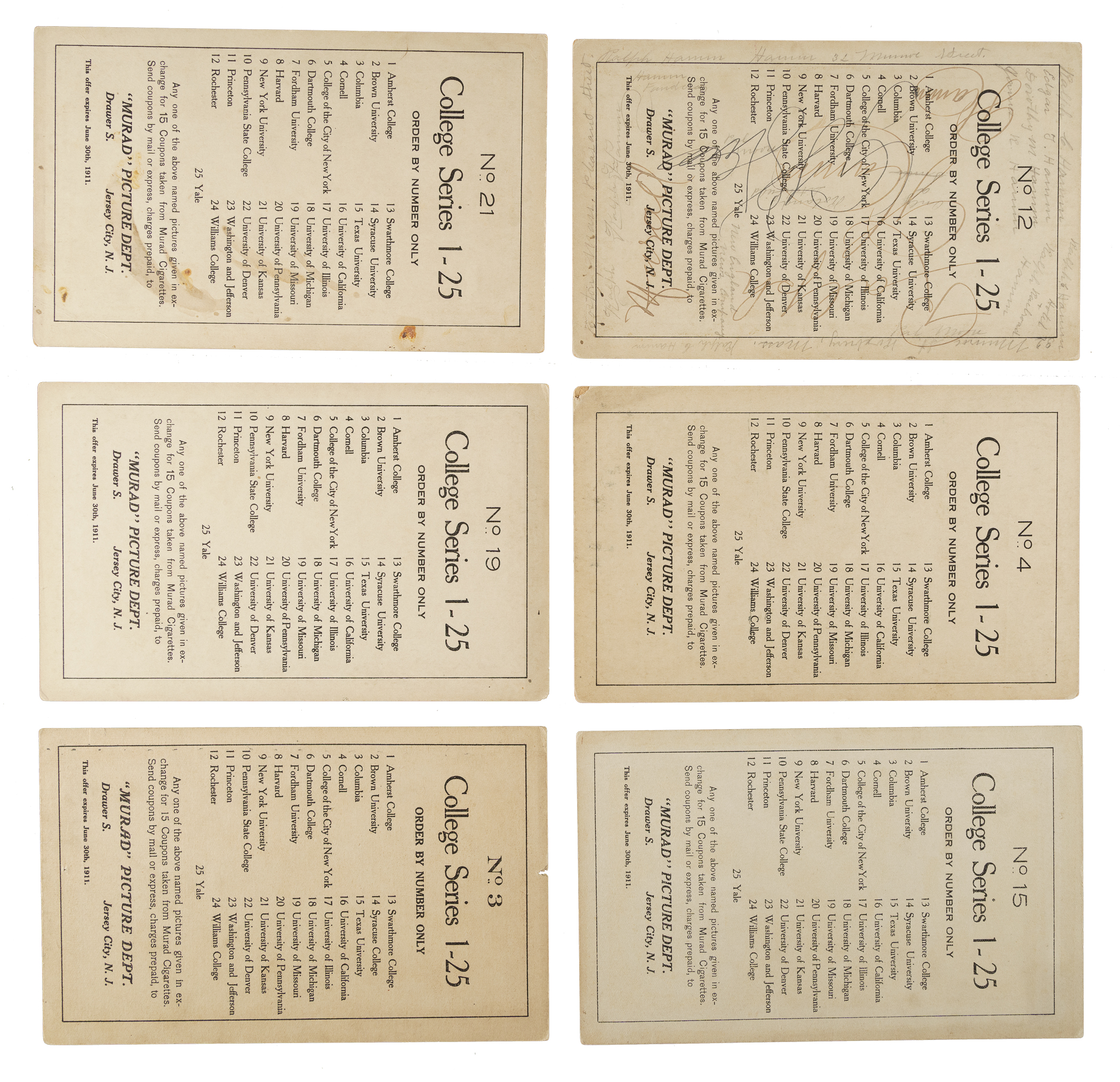 Collection of ten different (out of 25 in the set) T6 Murad Cigarettes "College Series" premiums, highlighted by the Williams College card (one of the earliest cards depicting basketball). The cards measure 5 x 8 inches and are very colorfully illustrated, most with an athletic image and the seal and pennant of the college depicted, and three with only the seal and pennant. The reverse features a checklist and redemption offer. The designs will look familiar to collectors as they are shared between these premiums and the smaller T51 Murad issue. The Murad "College Series" sets feature a variety of sports. This collection consists of the following: #3 Columbia (Pr due to pinholes), 4 Cornell (Pr due to a pinhole), 8 Harvard (Pr due to pinholes), 11 Princeton (Pr due to a pinhole), 12 Rochester (Pr due to both ink and pencil writing on the reverse), 15 Texas (Gd), 19 Missouri (Gd), 21 Kansas (Gd), 24 Williams College (Pr due to pinholes, basketball), and 25 Yale (Pr due to pinholes). Total: 10 cards.