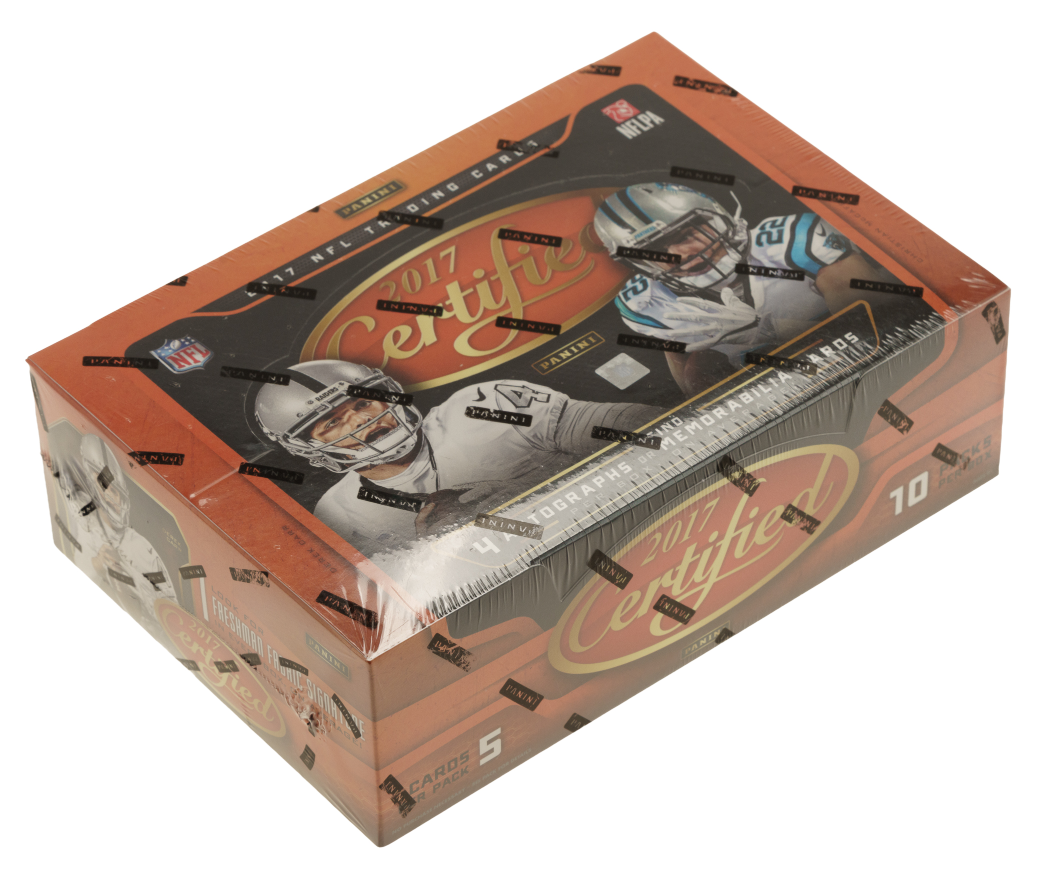 Presented is an unopened 2017 Panini Certified football hobby box containing 10 packs. The box is wrapped in its original factory cellophane. Notable players with rookie cards in the set include Patrick Mahomes, Christian McCaffrey, and Alvin Kamara.