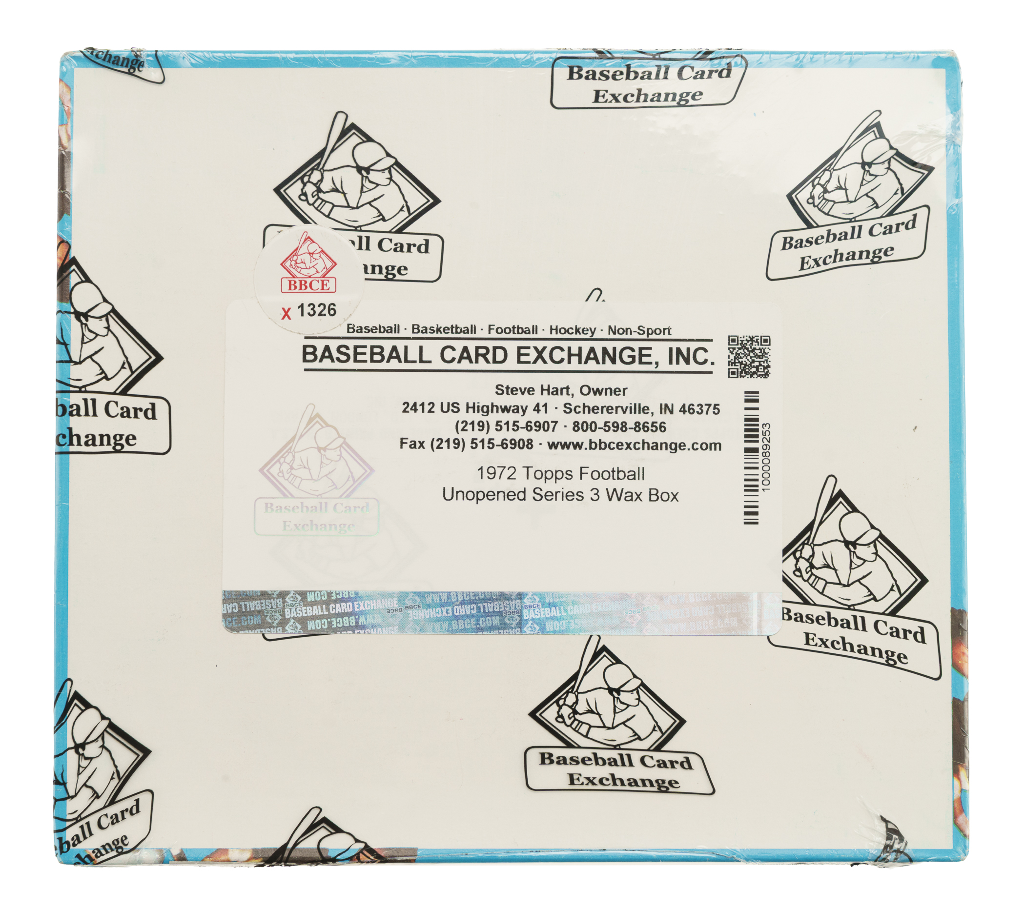Complete, original unopened wax box of 1972 Topps football. The box houses 24 packs with each pack containing 10 cards for a total of 240 cards. This is a third-series box (#264-351), a series that includes Joe Namath ("In Action"), Rayfield Wright (rookie card), Steve Spurrier (rookie card), and Alan Page, as well as numerous other stars and Hall of Famers. The box comes shrink-wrapped by Baseball Card Exchange (owned by Steve Hart, the foremost expert on unopened material). This is a stunning, complete, unopened wax box in exceptional condition.