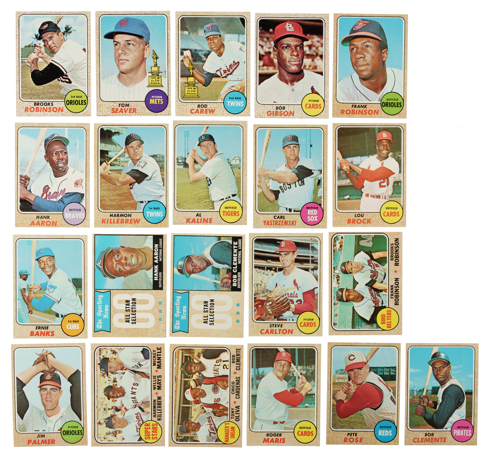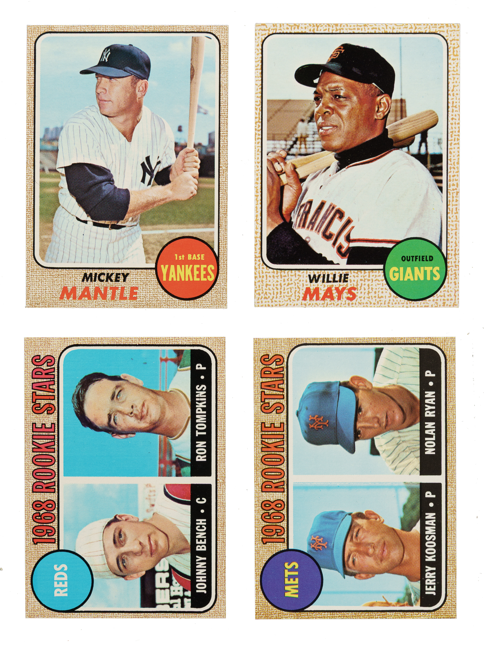 Presented is a crisp and clean complete set of 1968 Topps, highlighted by the rookie cards of Hall of Famers Nolan Ryan and Johnny Bench. The 1968 Topps set also includes the extremely popular “combo” cards featuring more than one player with #480 Managers Dream (with Roberto Clemente), #490 Superstars (Harmon Killebrew, Mickey Mantle, and Willie Mays), and #530 Bird Belters (Frank and Brooks Robinson). Condition is 50% Nr/Mt to Nr/Mt-Mt (including some Mint), 44% Ex to Ex-Mt, and 6% Vg to Vg-Ex (mostly Vg-Ex). Keys: #20 B. Robinson (Ex-Mt), 45 Seaver (Ex+), 50 Mays (Ex), 80 Carew (Ex), 100 Gibson (Nr/Mt due to centering), 110 Aaron (Ex-Mt), 150 Clemente (Nr/Mt), 177 Ryan RC (Nr/Mt+ due to spot of discoloration on reverse), 220 Killebrew (Nr/Mt due to centering), 230 Rose (Nr/Mt-Mt), 240 Kaline (Ex-Mt due to centering), 247 Bench RC (Nr/Mt-Mt+), 250 Yastrzemski (Ex-Mt), 280 Mantle (Vg-Ex+), 330 Maris (Nr/Mt-Mt), 355 Banks (Vg), 370 Aaron AS (Ex due to centering), 374 Clemente AS (Ex), 408 Carlton (Ex-Mt), 480 Manager's Dream (Nr/Mt+), 490 Superstars (Nr/Mt-Mt+), 500 F. Robinson (Ex), 520 Brock (Ex-Mt), 530 Bird Belters (Ex), and 575 Palmer (Nr/Mt-Mt). This is an extremely attractive and mostly high-grade complete set of one of the great 1960s Topps issues, loaded with Hall of Famers. Total: 598 cards.