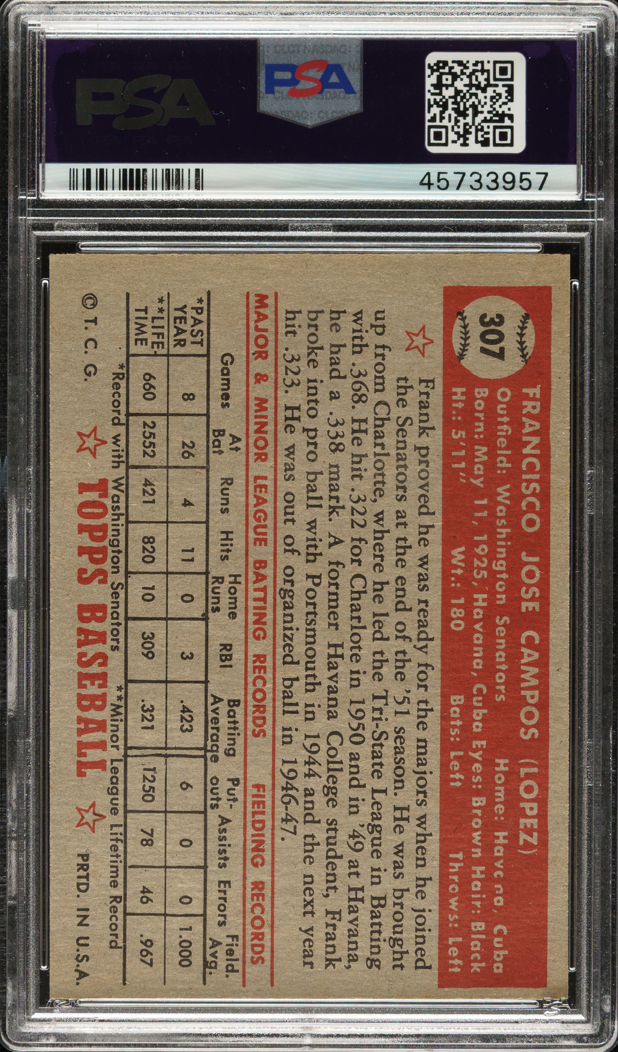 Lot # 1185: 1952 Topps #307 Frank Campos PSA NM 7