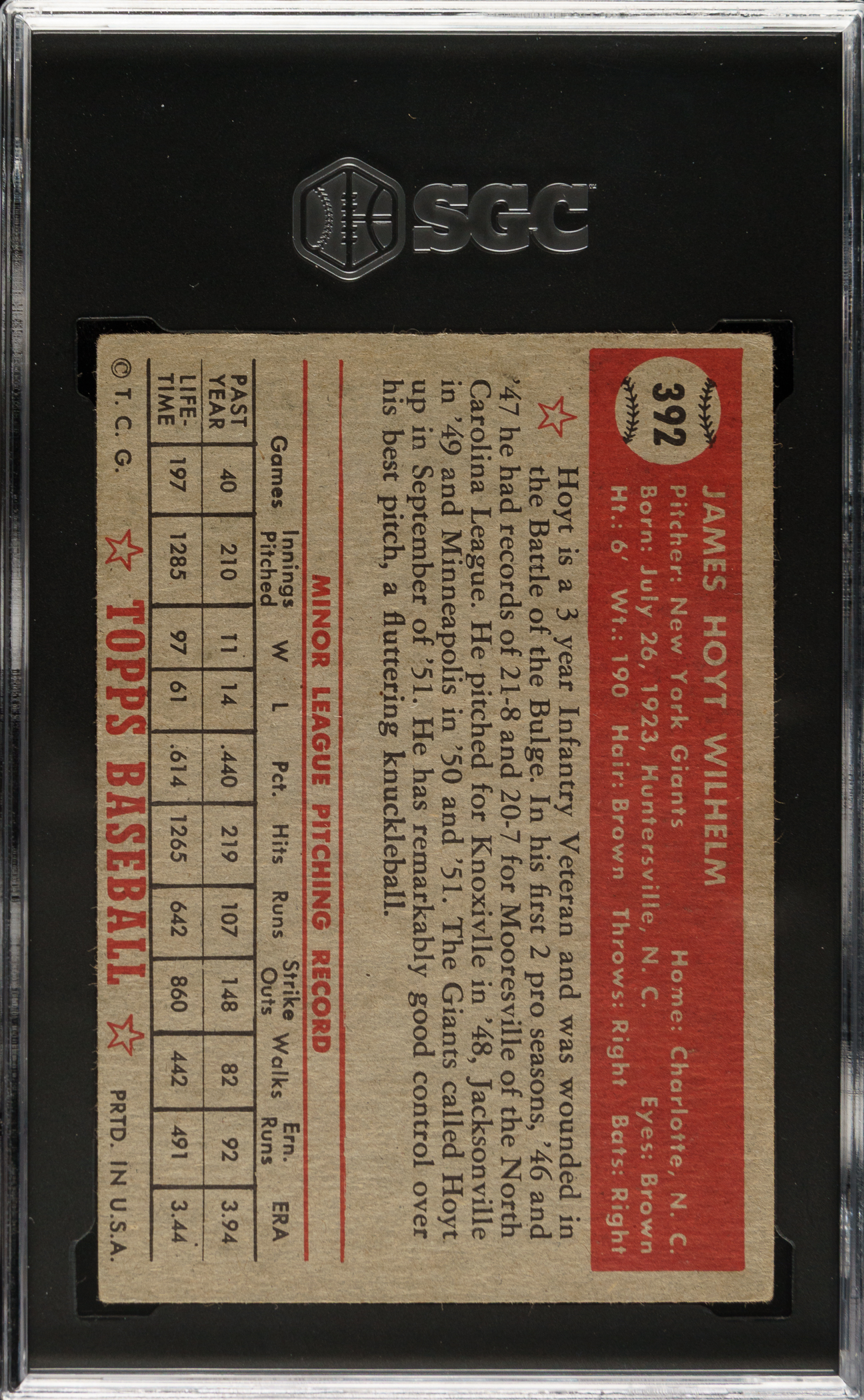 Graded VG/EX+ 4.5 by SGC. New York Giants Hall of Famer Hoyt Wilhelm.