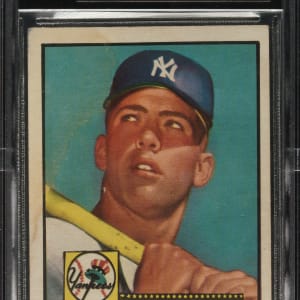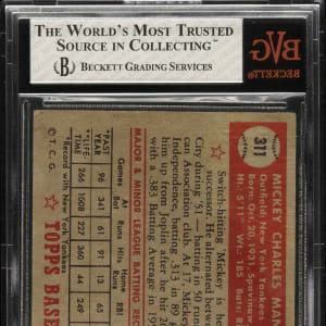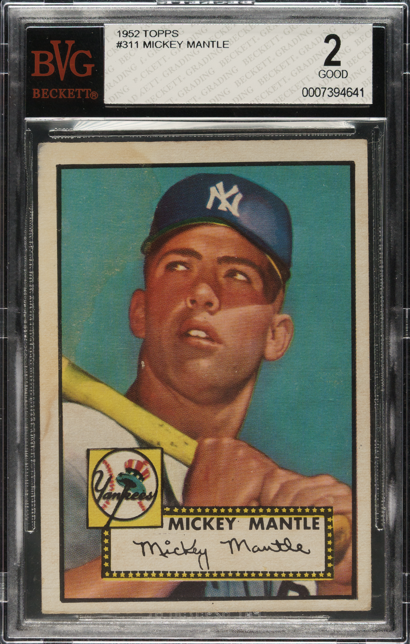 Presented is a very appealing 1952 Topps #311 Mickey Mantle. One of card collecting's classics, Mantle's Topps rookie card is the key to the set, one of the most famous of all cards, and the single most popular and valuable baseball card, having recently claimed the title at $12.6 million in MINT+ condition. The offered example, graded GOOD 2 by Beckett, has characteristics one would expect to see in a slightly higher grade. It has bold colors, a crisp image, and light wear at the corners (weaker bottom right). Light moisture stain on the upper-left quadrant and a tiny chip of paper loss on Mantle's neck has resulted in the modest grade of Good. The 1952 Topps Mantle has long been recognized as one of the most iconic "blue chips" of all vintage baseball cards and a glance at sales records shows that over the years it has consistently risen in value in all grades. This 1952 Topps Mantle presents a particularly significant collecting and investing opportunity as it is a very attractive example in a particularly desirable grade.