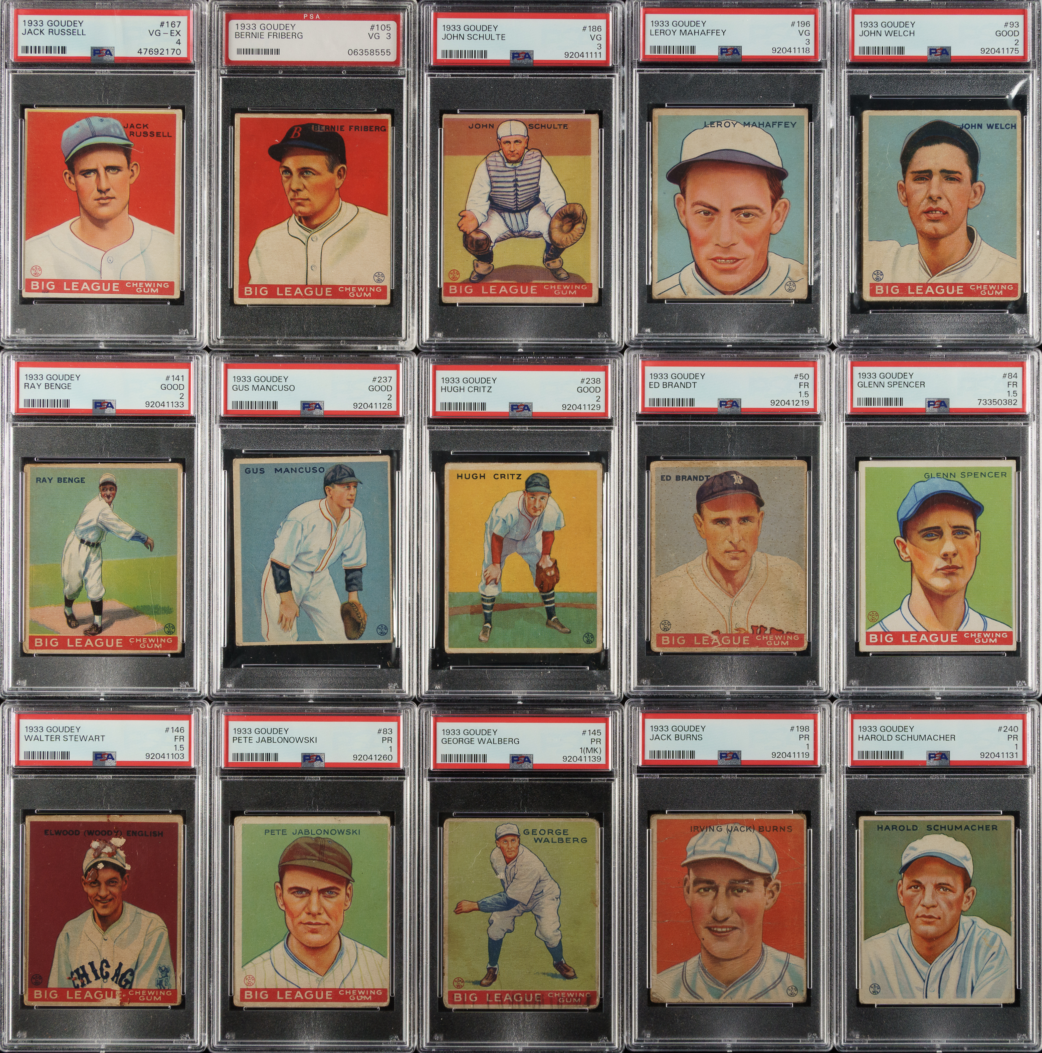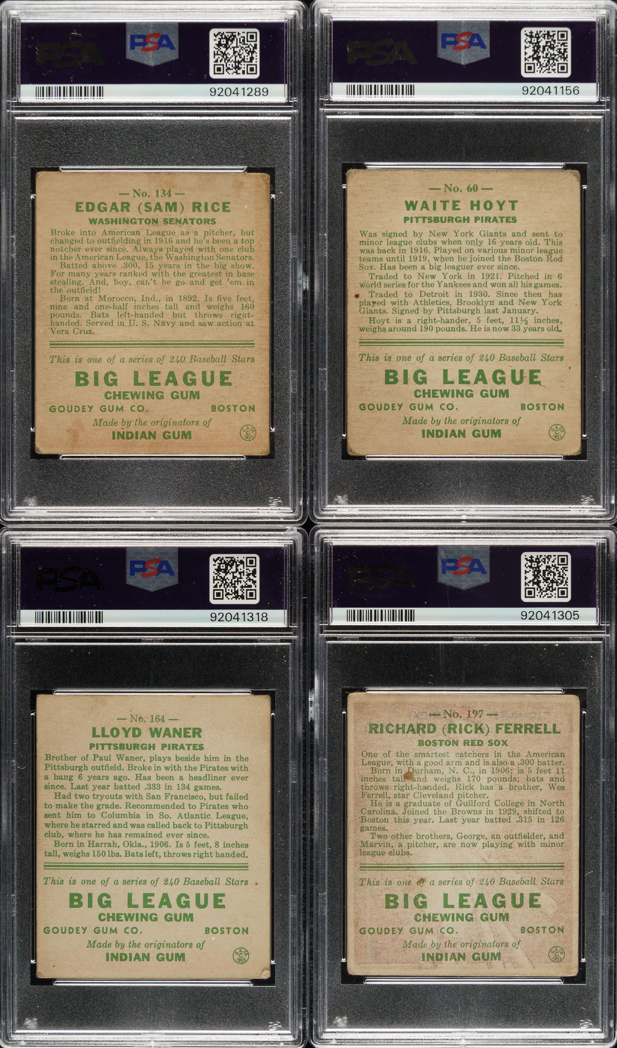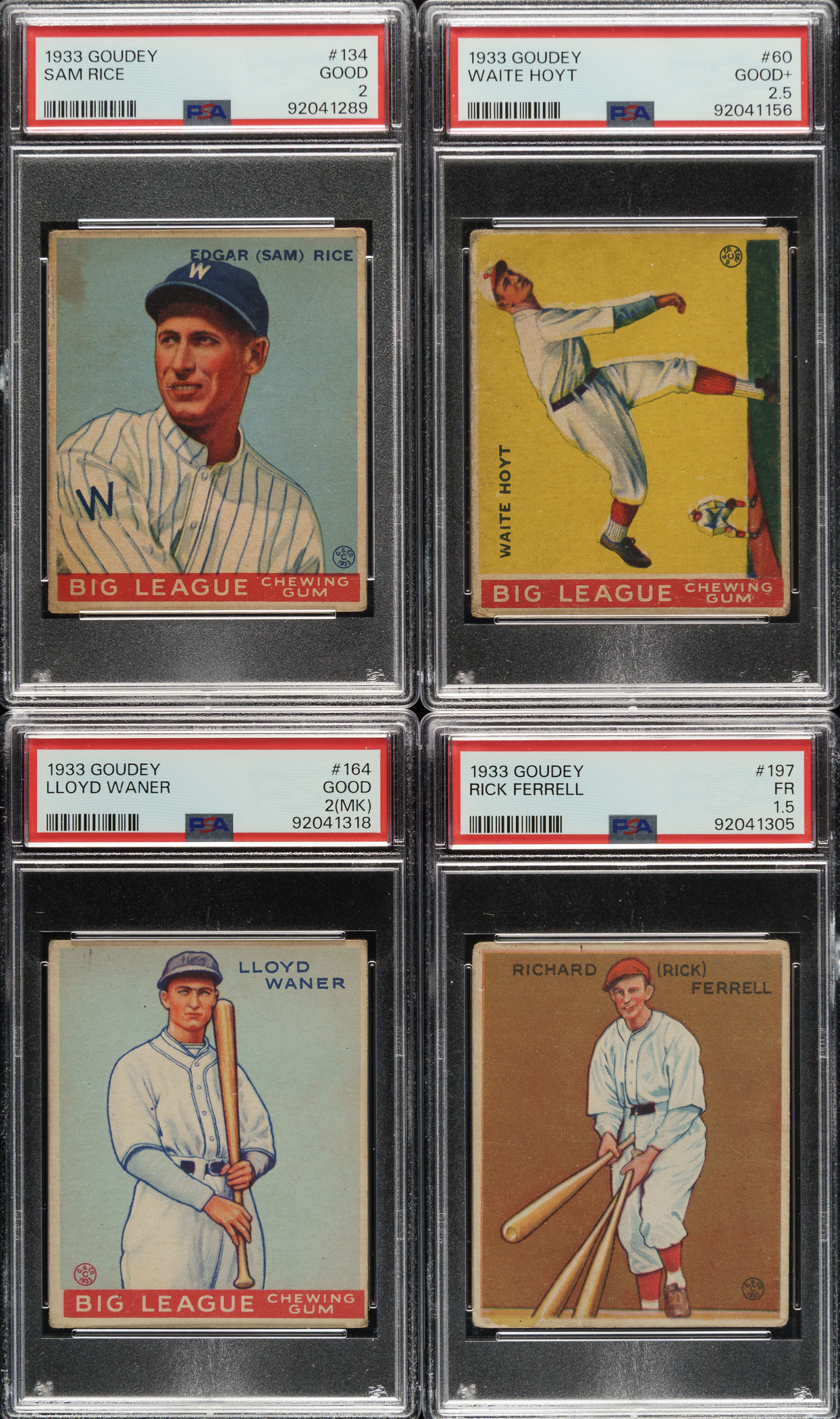 Collection of nineteen 1933 R319 Goudey cards, featuring Hall of Famers Waite Hoyt, Lloyd Waner, Sam Rice, and Rick Ferrell. Each card has been graded and encapsulated by PSA. PSA Grading Composite: VG-EX 4 (1 card): #167. VG 3 (3 cards): #105, 186, and 196. GOOD+ 2.5 (1 card): #60 Hoyt. GOOD 2 (6 cards): #93, 134 Rice, 141, 164 Waner (MK), 237, and 238. FAIR 1.5 (4 cards): #50, 84, 146, and 197 Ferrell. POOR 1 (4 cards): #83, 145 (MK), 198, and 240. Total: 19 cards.
