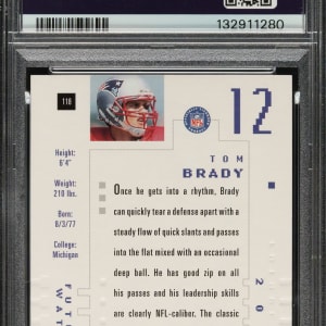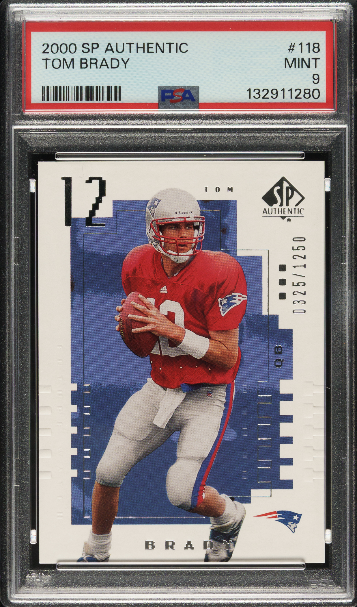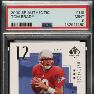 Graded MINT 9 by PSA (submitted by REA). Stunning high-grade example of Tom Brady's 2000 Upper Deck SP Authentic card. Upper Deck SP Authentic is one of the most popular modern football issues. During an era in which players often grace the fronts of rookie cards from multiple card manufacturers, this card has drawn serious interest from collectors over the years and risen to the top of the list as one of the most desirable Tom Brady rookie cards. The offered card boasts a clean surface, sharp corners, and excellent centering. Limited in production to 1,250, the offered example is serial numbered "325/1,250" on the front. A magnificent high-grade example worthy of even the most advanced Tom Brady or modern football-card collection.