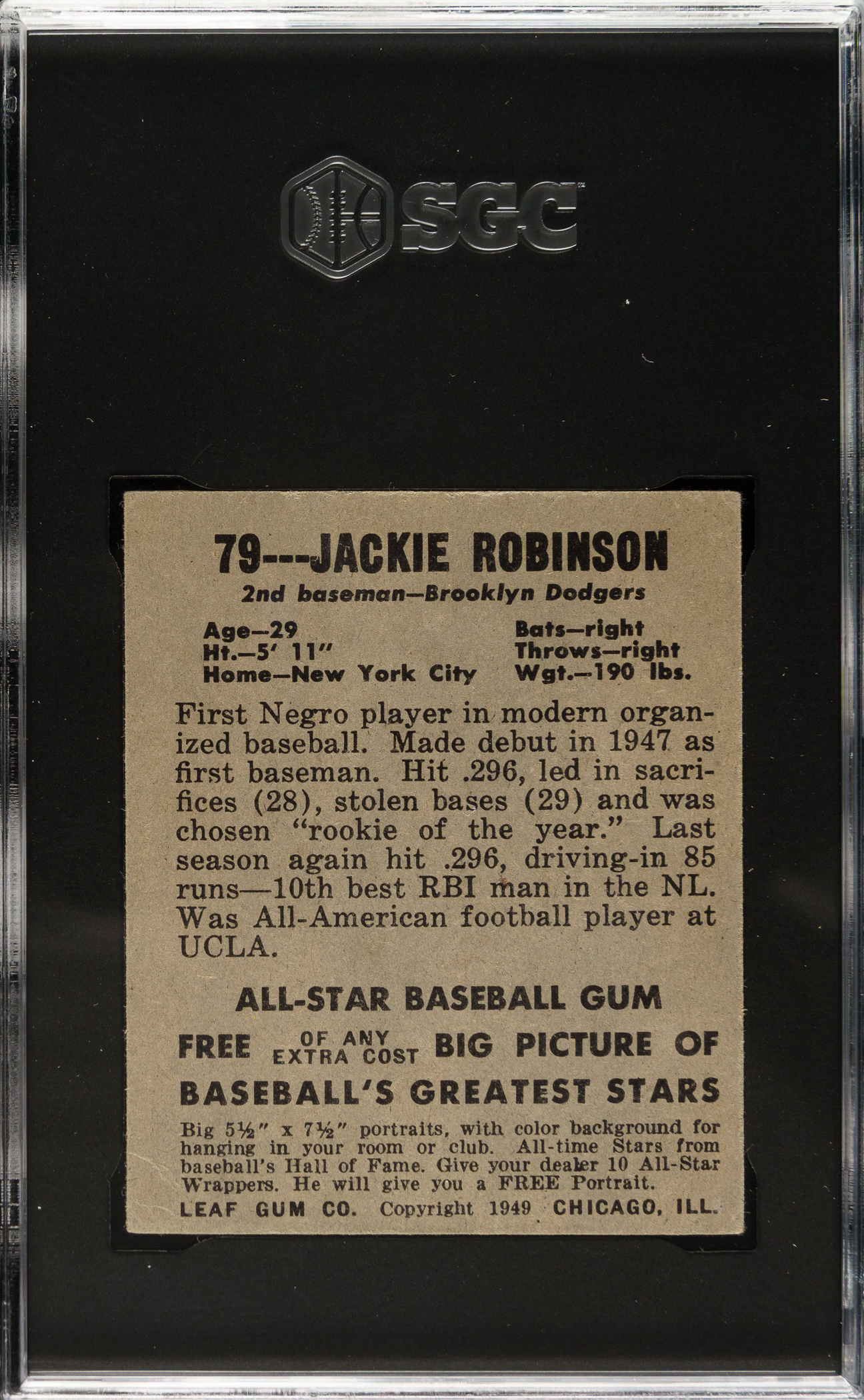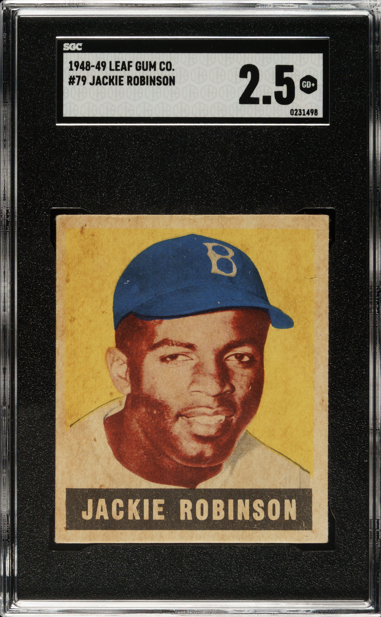 Graded GOOD+ 2.5 by SGC. Pleasing example of this classic rookie card featuring Brooklyn Dodgers Hall of Famer Jackie Robinson. The 1948-1949 Leaf bubble-gum card of Robinson is one of the most popular, striking, and classic of all his cards. The offered card has bold colors, a crisp image of Robinson, and light corner wear. Clean reverse. Light toning on front and centering factor into the assigned grade.