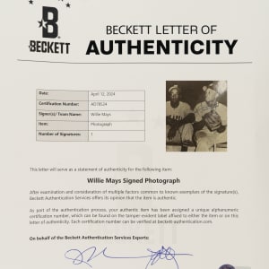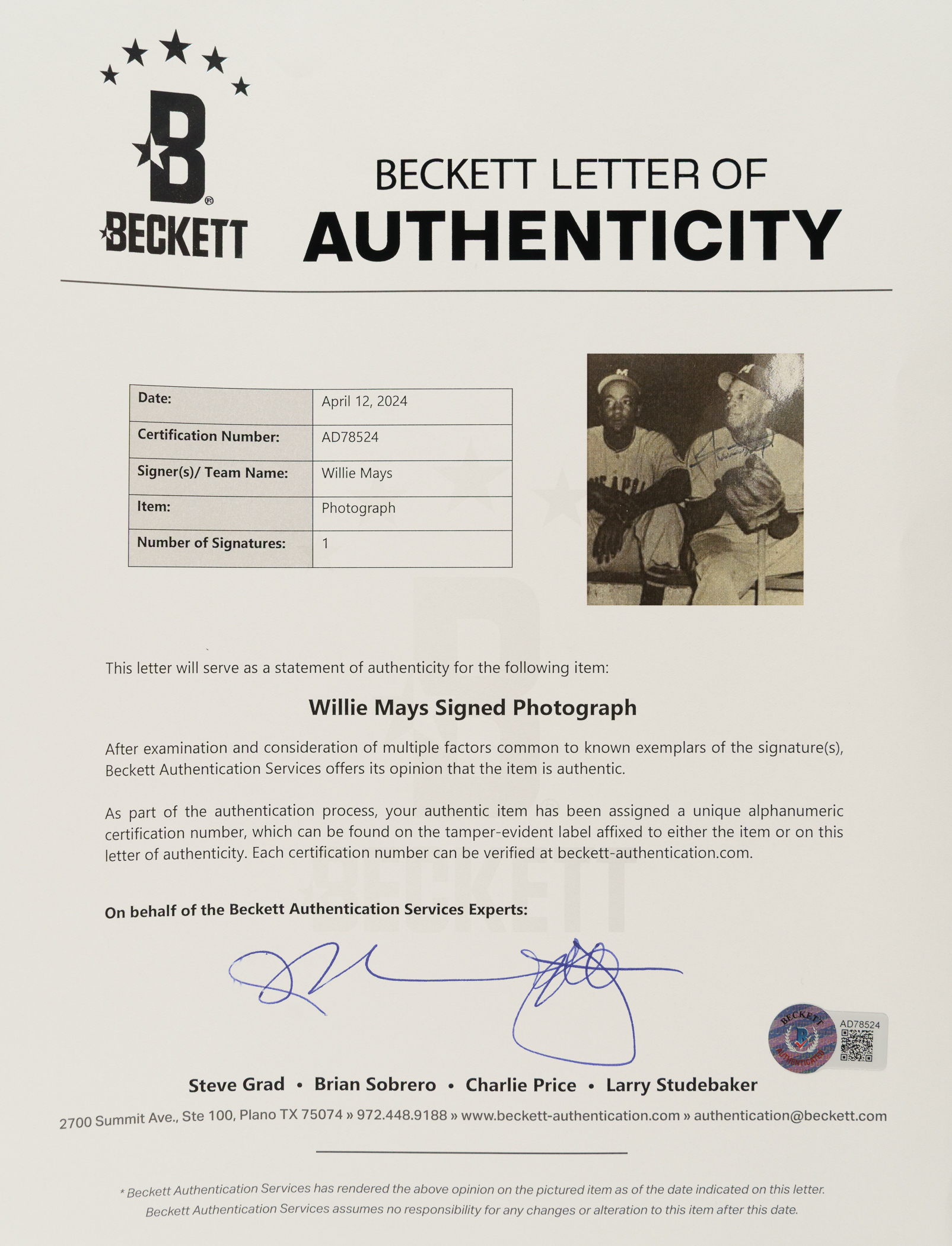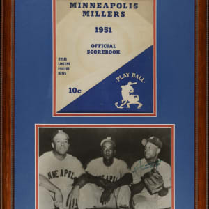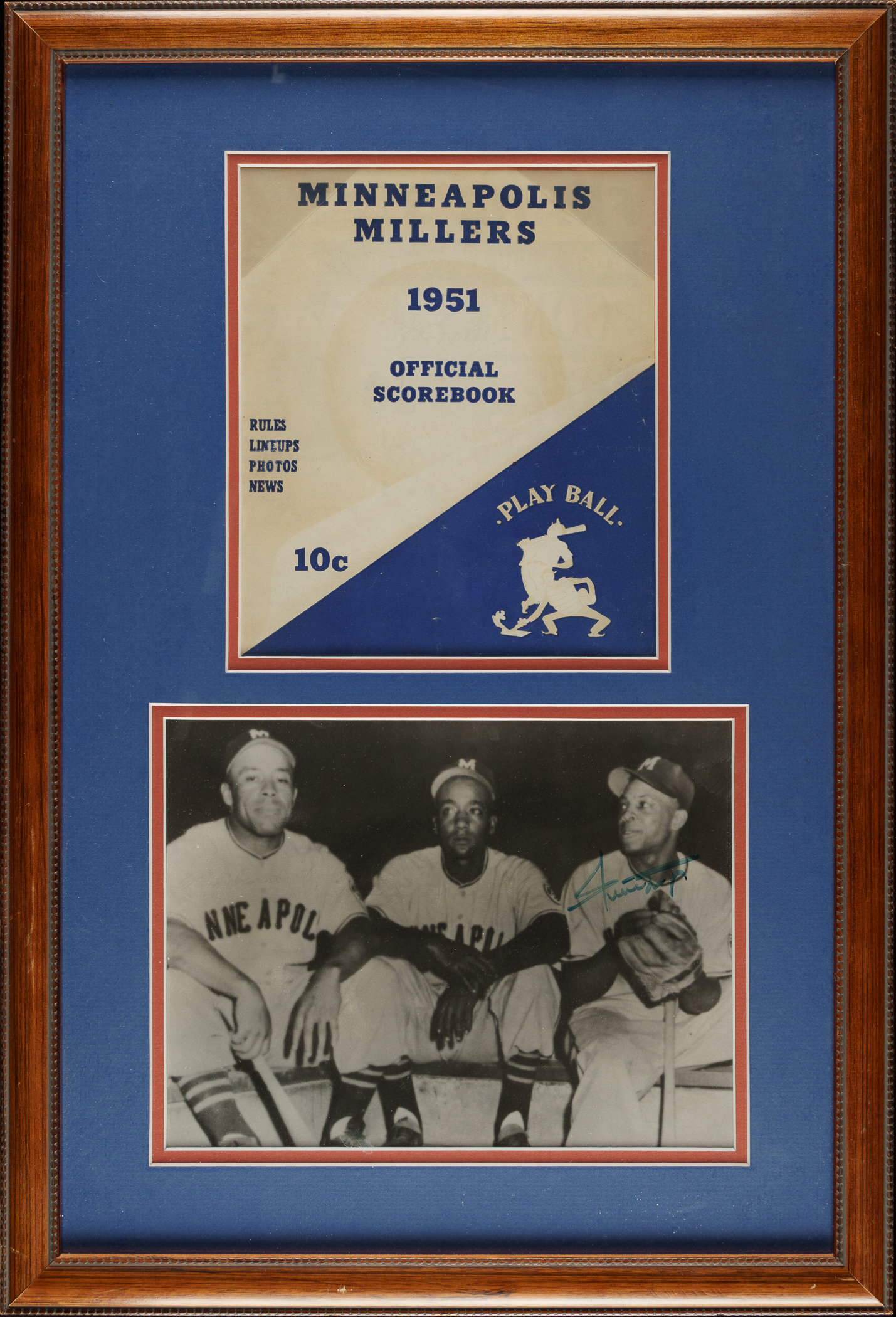 1951 Minneapolis Millers program accompanied by a signed black-and-white photo (modern print) of Willie Mays in a framed display. Mays has signed the photo in blue marker across his image. Negro League Hall of Famer Ray Dandridge is also featured in the photo (far left), which may represent the only image of the two Hall of Famers together. Mays and Dandridge were teammates on the Millers in 1951. The program (7 x 8 inches, visible dimensions) displays scattered creasing and is in apparent Good to Very Good condition overall. The photo (9 x 7 inches, visible dimensions) is in apparent Excellent condition overall. Matted and framed to total dimensions of 14 x 21 inches. Full LOA from Steve Grad and Brian Sobrero/Beckett Authentication Services. The size/weight of this item requires that there will be an additional shipping charge for this lot.