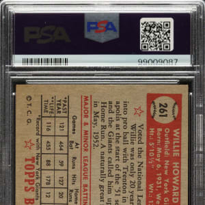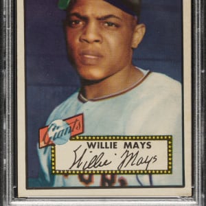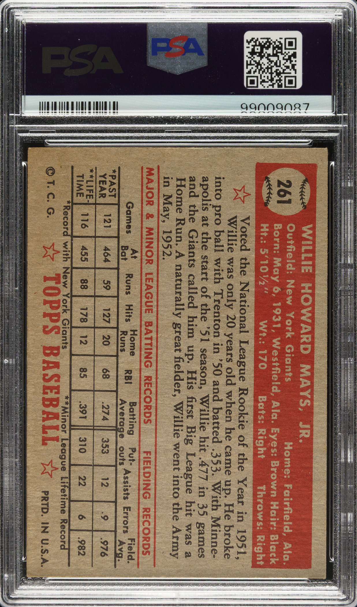 Graded VG-EX+ 4.5 by PSA. Beautiful mid-grade example of New York Giants Hall of Famer Willie Mays from the 1952 set, one of collecting's most classic cards. The offered card has a bold purple background, a crisp image, and light corner wear. A tiny crease on the lower-right corner (most visible from the reverse) is related to the assigned grade. Clean reverse. This is a very attractive example of one of Willie Mays' most important cards.