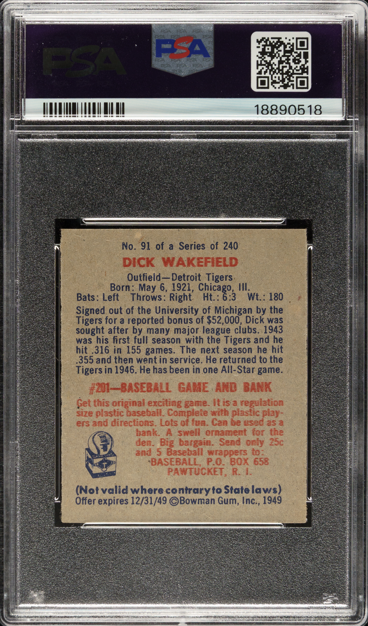 Graded MINT 9 by PSA. Detroit Tigers. One of only six examples graded at this level by PSA with none higher!