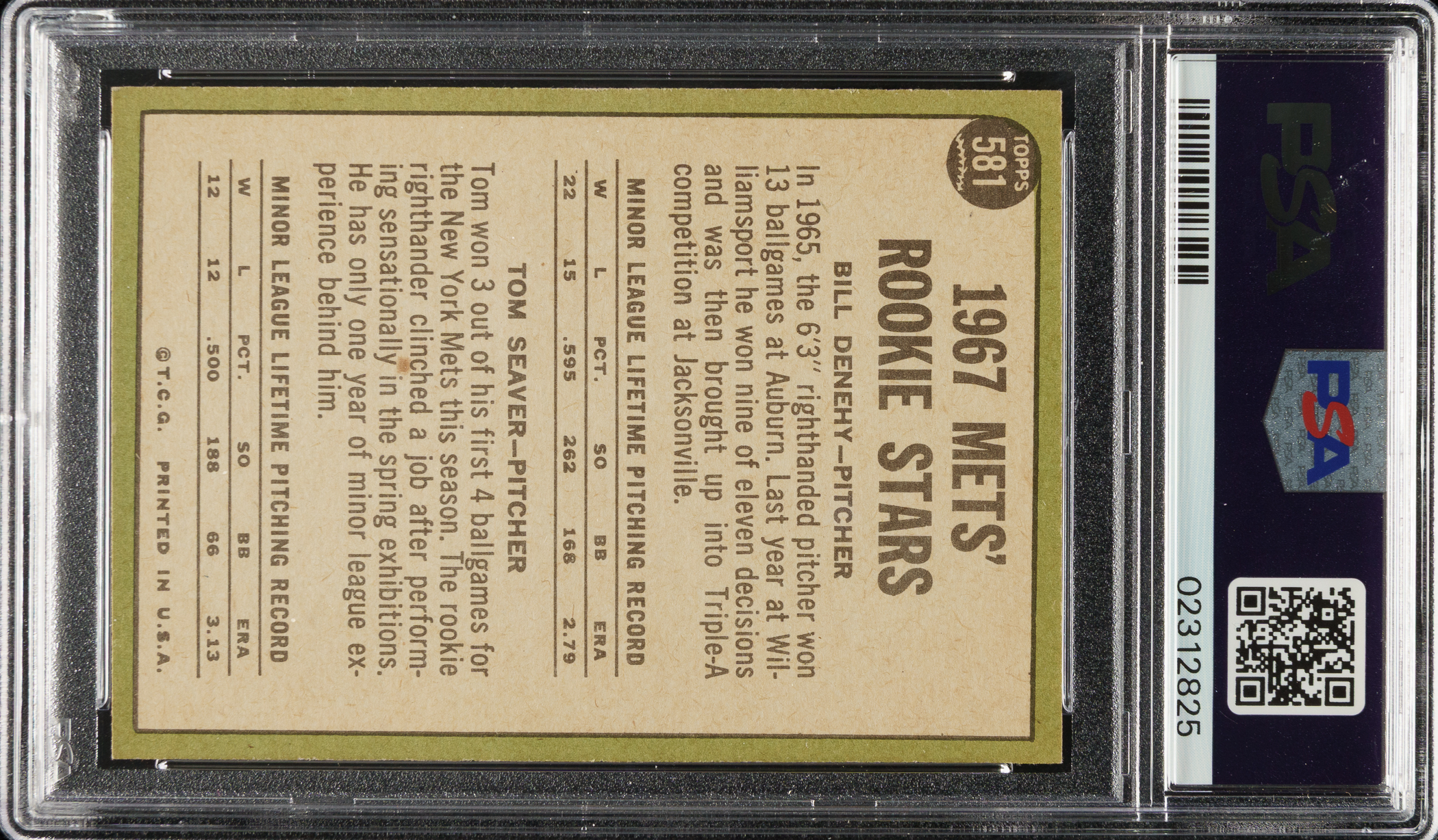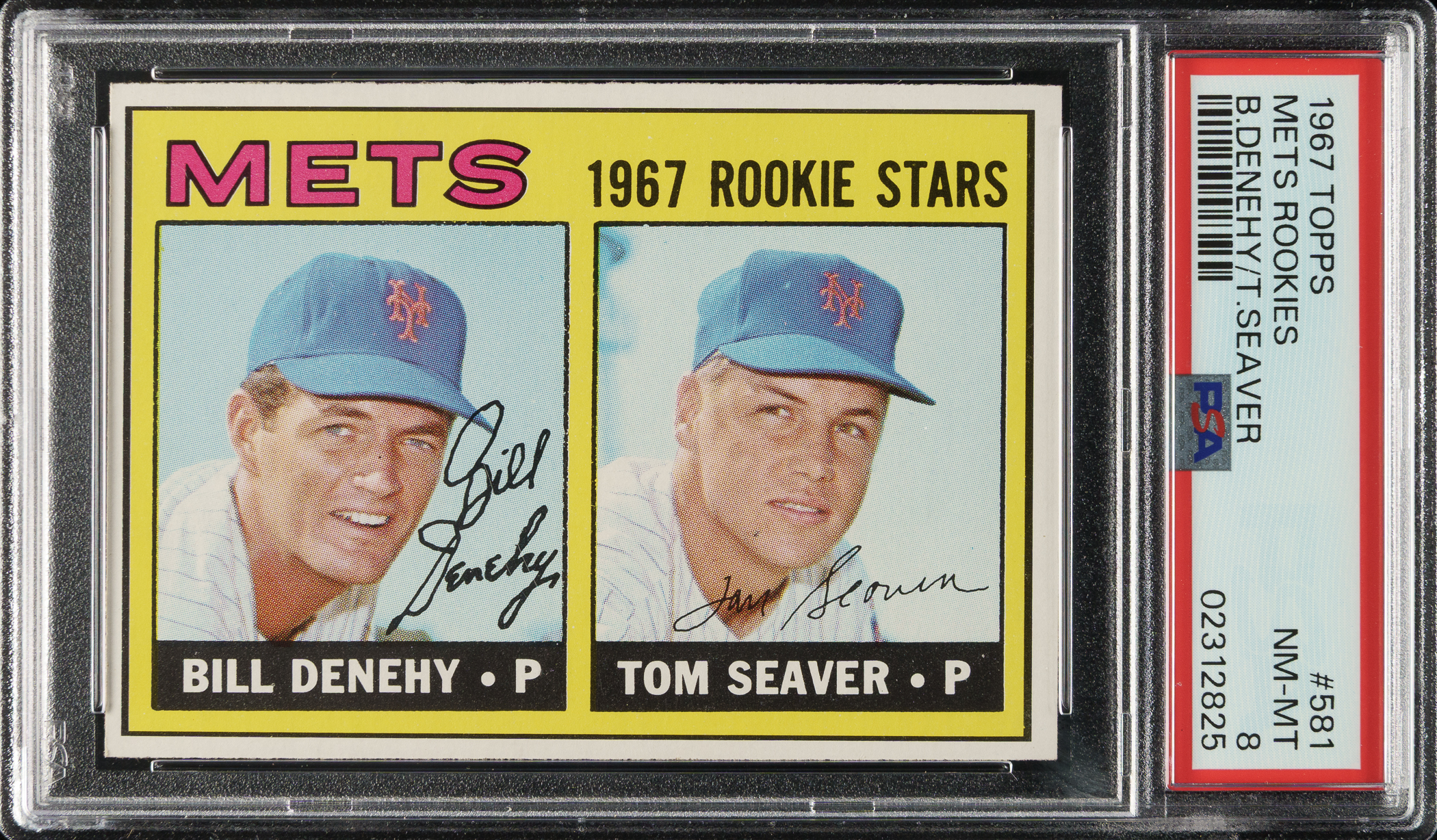 Graded NM-MT 8 by PSA. Extremely desirable rookie card of New York Mets Hall of Fame pitcher Tom Seaver and one of the key cards from the 1967 Topps set. This example has brilliant colors, outstanding image quality, and strong corners. Clean reverse. A tremendous example.