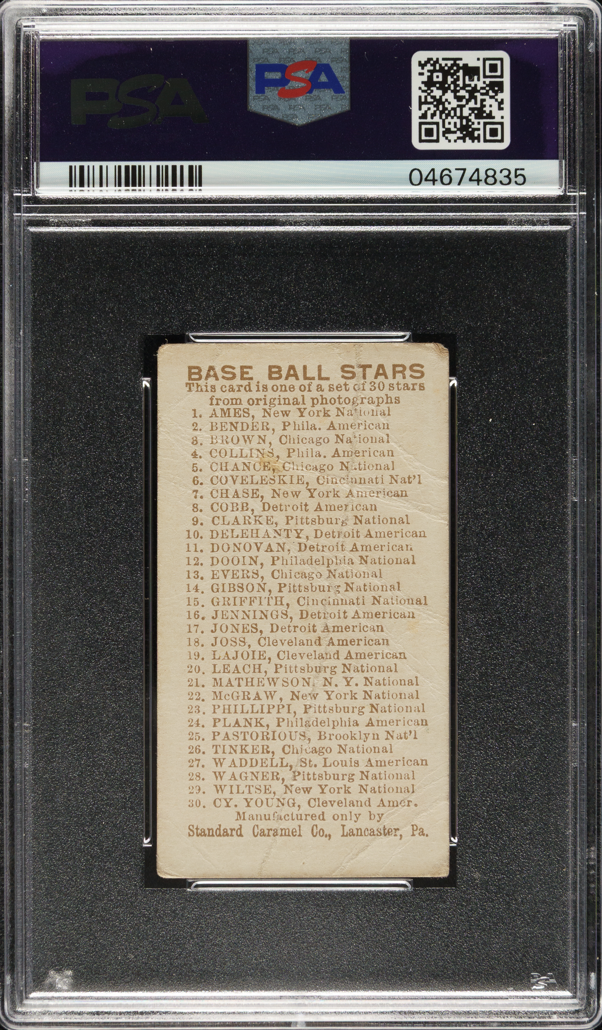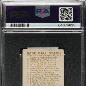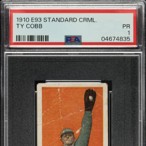 Modestly graded example of key Hall of Famer Ty Cobb from the very popular E93 Standard Caramel series. This 30-card set was issued in 1910 by the Standard Caramel Co. of Lancaster, Pennsylvania. The offered card has a brilliant orange background and a crisp image of Cobb. Graded POOR 1 by PSA, condition issues include scattered creasing, corner wear, and a couple spots of paper loss on the front. Despite these condition flaws, this remains a presentable example of the key card from one of the most popular and colorful of all āEā card issues.