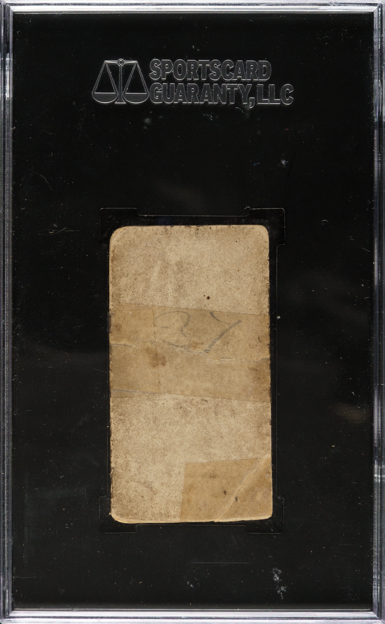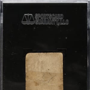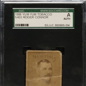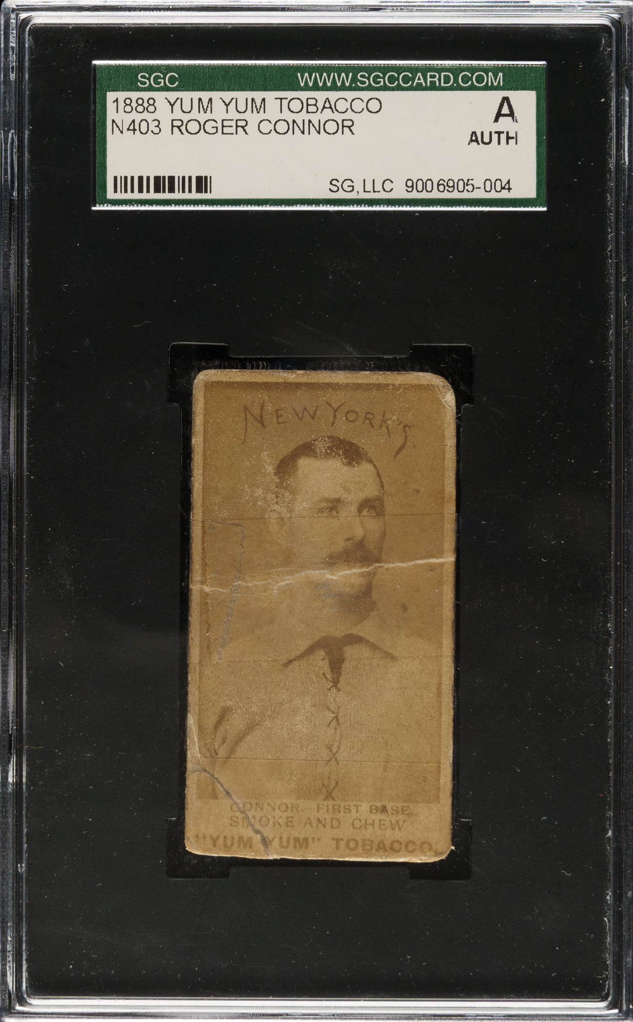 Extremely rare card from the Yum Yum Tobacco series of 1888 featuring New York Giants Hall of Famer Roger Connor in a portrait pose. Yum Yums are one of the 19th century's legendary rarities. In fact, only 113 examples have been graded by SGC and PSA combined! Only three N403 Anson cards have been evaluated by SGC. It is extremely rare to find even a common N403 Yum Yum, let alone a key Hall of Famer. Yum Yum Tobacco was a brand of the August Beck Company of Chicago. Since the earliest days of organized collecting, advanced collectors have appreciated the mystique of the rarest pre-1900 baseball-card issues, especially Yum Yum Tobacco cards. Whether it is because of the brand name, their unusual look, extreme rarity, or a combination of all of these factors, few card issues command the respect that Yum Yum Tobacco cards do among the most serious collectors. It is always a privilege to offer a Yum Yum, regardless of condition. This particular example is encapsulated as "Authentic" by SGC due to vintage tape repairs across the center of the card and in the lower left corner. The tape reinforces heavy creasing (especially severe in the lower left; it appears the corner separated and was reattached). The blank reverse displays moderate soiling as well as pencil marks underneath the band of tape across the center. Despite these condition flaws, this is a pleasing photographic-style example (Yum Yums were also issued with line-drawn woodcut designs) from this extremely rare and desirable 19th century set, featuring one of the 19th century's most legendary Hall of Famers, Roger Connor.
