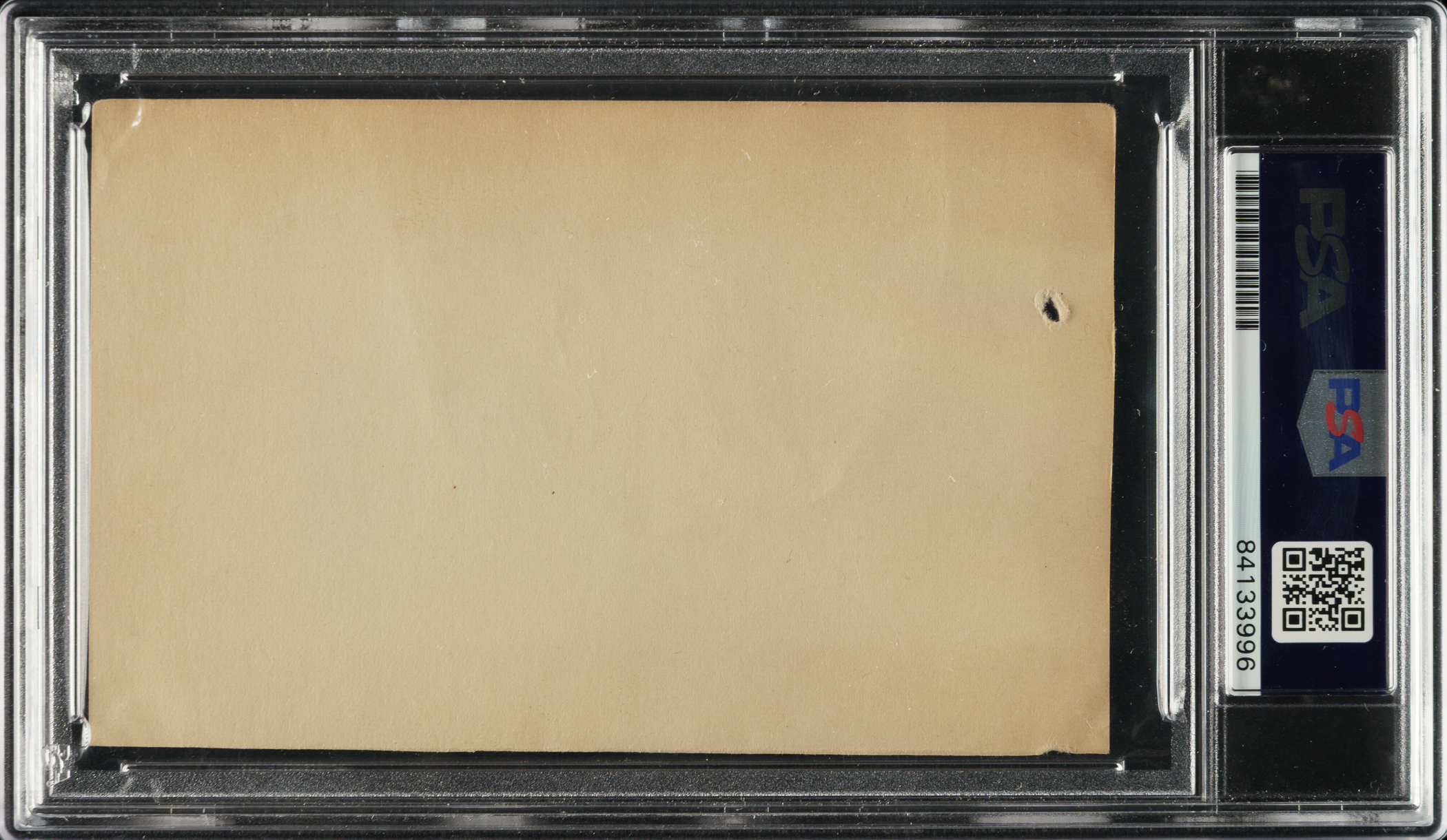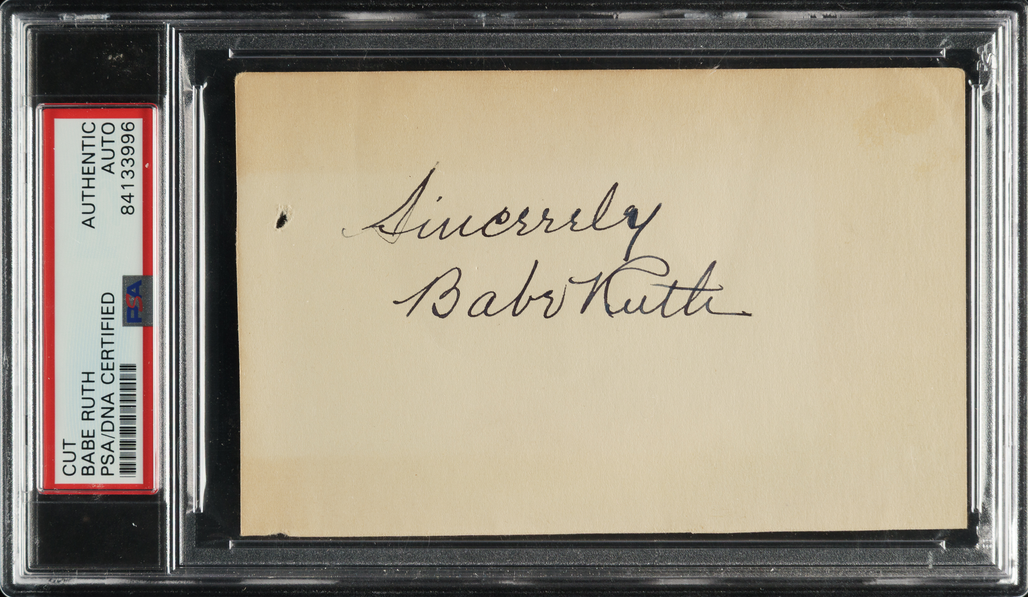 Exceptionally attractive Babe Ruth cut signature. Ruth has scripted "Sincerely Babe Ruth" in black fountain pen on an unlined sheet of paper, which has been cut down to the dimensions of 5-1/8 x 3-1/4 inches. PSA/DNA has encapsulated the sheet and certified the signature as "Authentic." The paper on which Ruth's name is written has a small puncture hole and a few light creases, none of which detract from the excellent overall display value of this small but striking piece. In Fair to Good condition overall. A phenomenal signature example.